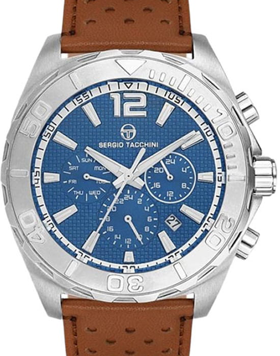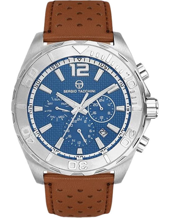 Sergio Tacchini ST.9.107.02 — мужские часы с выразительным спортивным характером, в которых сочетаются динамичный стиль и функциональность. Крупный корпус из нержавеющей стали подчёркивает мощный облик модели, а насыщенно-синий циферблат с тройной индикацией и окошком даты. Функция хронографХронографФункция позволяет измерять отрезки времени с особой точностью: часы, минуты, секунды. Верным признаком хронографа является наличие на циферблате 3 дополнительных окошек-счётчиков. позволяет с высокой точностью измерять промежутки времени, а фиксированный безельБезельВнешний ободок, закрепляющий стекло. В спортивных часах так называется поворотное кольцо с делениями на циферблате, выполняет роль таймера – замеряет отрезки времени на шкале. Неподвижный безель – элемент декора. Однонаправленно вращающийся безель на дайверских часах позволяет фиксировать моменты погружения и выныривания на поверхность. с минутной шкалой придаёт модели дополнительную спортивную выразительность. Циферблат защищён минеральным стекломМинеральное стеклоМинеральное стекло представляет собой искусственно выращенный минерал кварца. Такое стекло отличается особой устойчивостью к повреждениям и царапинам. Уступает по некоторым качествам сапфировому стеклу., устойчивым к мелким царапинам, а перфорированный кожаный ремешок с застёжкой-классикой обеспечивает комфорт и вентиляцию при активном ношении. Водозащита 50 м делает часы подходящими для повседневных условий и лёгких водных нагрузок. Sergio Tacchini — выбор тех, кто ценит энергичный ритм жизни и безупречный итальянский дизайн.