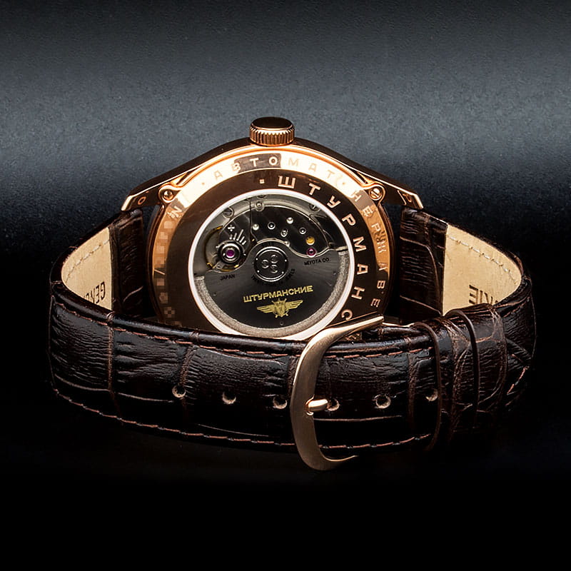 Мужские российские механические часы с минеральным стекломМинеральное стеклоМинеральное стекло представляет собой искусственно выращенный минерал кварца. Такое стекло отличается особой устойчивостью к повреждениям и царапинам. Уступает по некоторым качествам сапфировому стеклу. Штурманские Гагарин 9015/1279164, механизм с высокой точностью. Класс водозащиты: 50 метров, позволит защитить корпус от случайных брызг или капель дождя. Корпус часов изготовлен из стали с PVD-покрытиемPVDУльтратонкое покрытие наносится в технике вакуумного напыления, сочетает в себе нитрид титана особой прочности со слоем золота или оксида хрома. Несёт в себе декоративную или защитную функцию.. Кожаный ремешок на стандартной застёжке. Стрелки и метки с люминесцентным покрытиемЛюминесцентное покрытиеПозволяет считывать показания времени в темноте. Производители наносят на стрелки, часовые индексы, безель или поверхность циферблата светонакопительный состав, дающий холодное свечение.. Калибр Miyota 9015. В механизме 24 камня, частота 28800 полуколебаний в час. Запас хода 42 часа. Апертура даты.