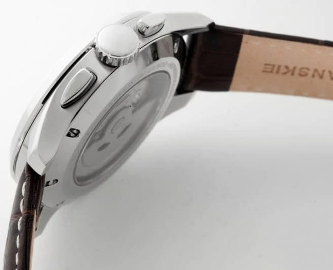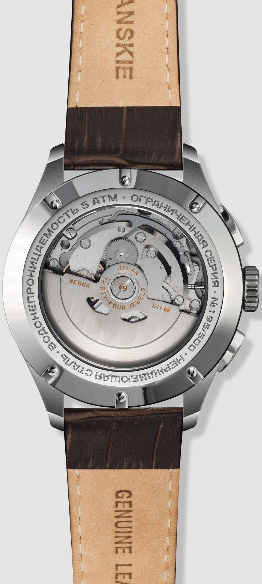 Лимитированные мужские российские механические часы-хронографХронографФункция позволяет измерять отрезки времени с особой точностью: часы, минуты, секунды. Верным признаком хронографа является наличие на циферблате 3 дополнительных окошек-счётчиков. с секундомеромСекундомерСекундоме́р — прибор, способный измерять интервалы времени с точностью до долей секунды. Штурманские Открытый Космос NE86/1855017, механический механизм (автоматический калибр) с высокой точностью. Лимитированная серия - 500 экземпляров, посвящена первому выходу человека в открытый космос. Сапфировое стеклоСапфировое стеклоПрочный и надёжный материал из кристалла сапфира синтетического происхождения, характеризующийся особой твёрдостью и устойчивостью к царапинам и повреждениям. устойчивое к появлению царапин, обладающее высокой прозрачностью. Класс водозащиты: 50 метров, позволит защитить корпус от случайных брызг или капель дождя. Корпус часов изготовлен из стали. Кожаный ремешок на стандартной застёжке. Стрелки и метки с люминесцентным покрытиемЛюминесцентное покрытиеПозволяет считывать показания времени в темноте. Производители наносят на стрелки, часовые индексы, безель или поверхность циферблата светонакопительный состав, дающий холодное свечение.. Стальной корпус надежно защищает от повреждений механический японский калибр Seiko NE86 на 34 камня с запасом хода 42 часа. Подзавод у часов автоматический.