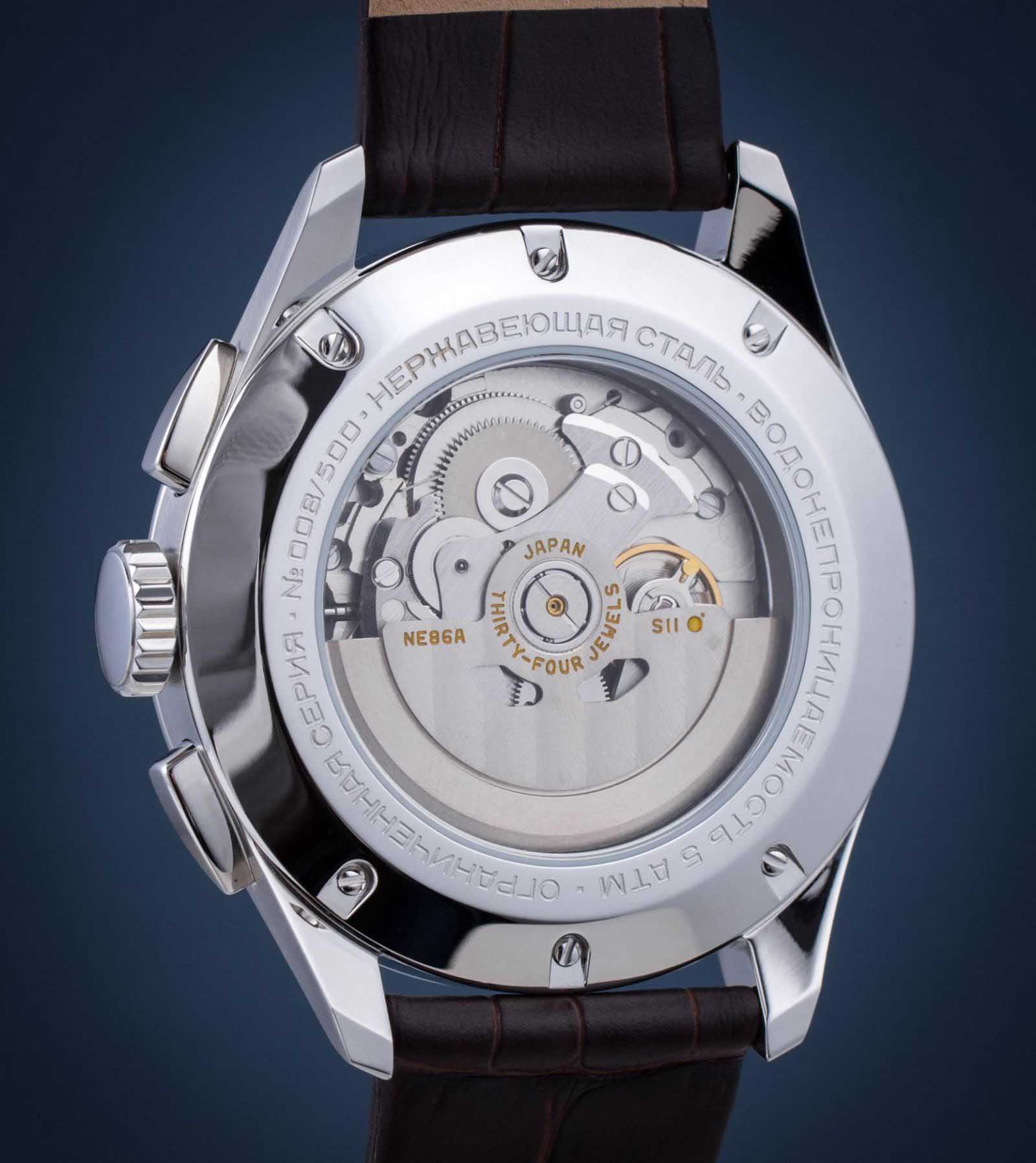 Мужские российские механические часы-хронографХронографФункция позволяет измерять отрезки времени с особой точностью: часы, минуты, секунды. Верным признаком хронографа является наличие на циферблате 3 дополнительных окошек-счётчиков. с секундомеромСекундомерСекундоме́р — прибор, способный измерять интервалы времени с точностью до долей секунды. Штурманские Открытый Космос NE86/1855018, механический механизм (автоматический калибр) с высокой точностью. Лимитированная серия - 500 экземпляров, посвящена первому выходу человека в открытый космос. Индивидуальная нумерация. Сапфировое стеклоСапфировое стеклоПрочный и надёжный материал из кристалла сапфира синтетического происхождения, характеризующийся особой твёрдостью и устойчивостью к царапинам и повреждениям. устойчивое к появлению царапин, обладающее высокой прозрачностью. Класс водозащиты: 50 метров, позволит защитить корпус от случайных брызг или капель дождя. Корпус часов изготовлен из стали. Кожаный ремешок на стандартной застёжке. Стрелки и метки с люминесцентным покрытиемЛюминесцентное покрытиеПозволяет считывать показания времени в темноте. Производители наносят на стрелки, часовые индексы, безель или поверхность циферблата светонакопительный состав, дающий холодное свечение.. Стальной корпус надежно защищает от повреждений механический японский калибр Seiko NE86 на 34 камня с запасом хода 42 часа. Подзавод у часов автоматический.