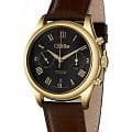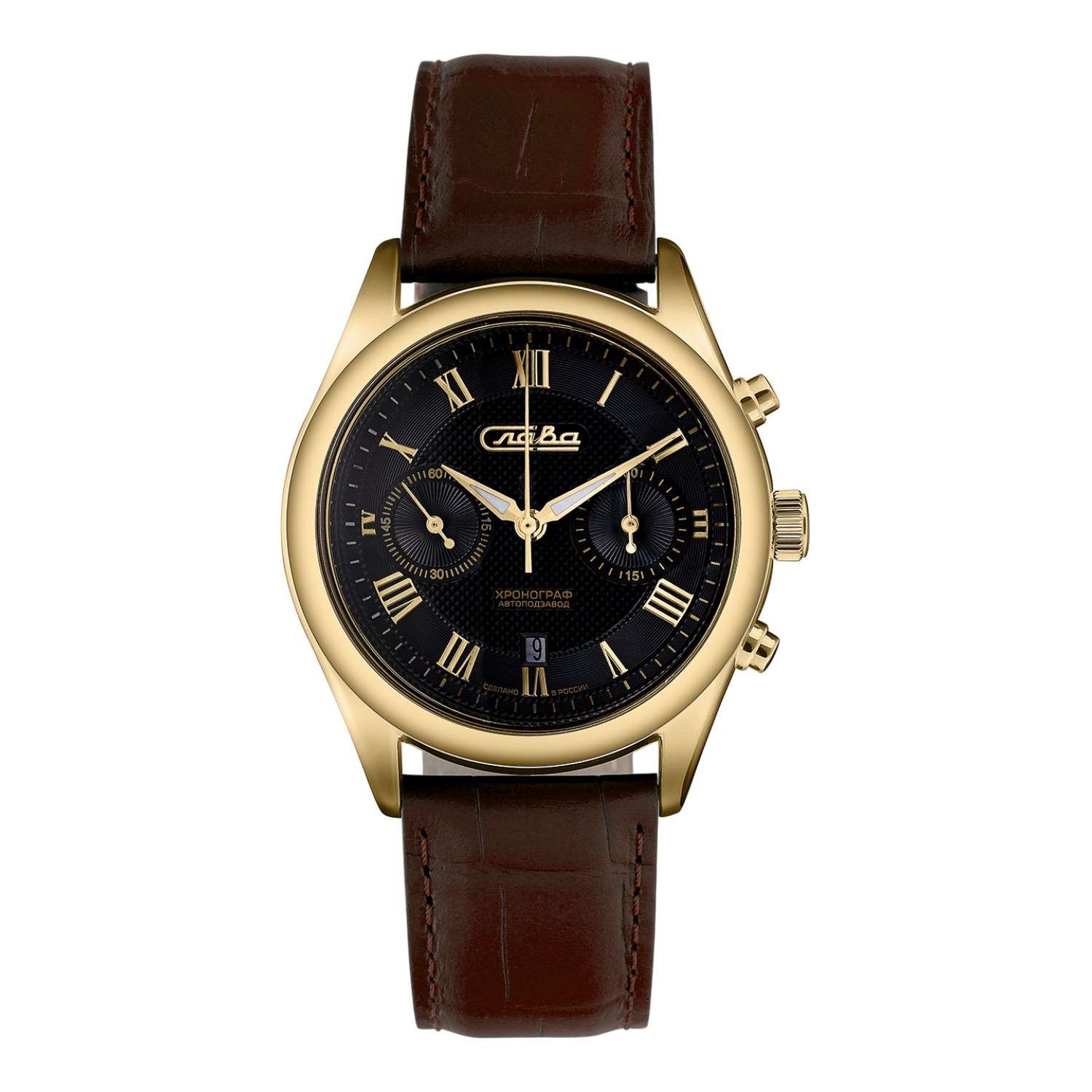 Российские механические наручные часы-хронографХронографФункция позволяет измерять отрезки времени с особой точностью: часы, минуты, секунды. Верным признаком хронографа является наличие на циферблате 3 дополнительных окошек-счётчиков. с секундомеромСекундомерСекундоме́р — прибор, способный измерять интервалы времени с точностью до долей секунды. Слава Сенат 1889258/300-4617, которые станут идеальным аксессуаром для повседневного ношения. Эти часы сочетают в себе элегантность и практичность, предлагая безупречный стиль и надежность. Оснащенные механизмом Peacock 4617 с автоподзаводом, они обеспечивают точность и долговечность. Стальной корпус с IP-покрытиемIP-покрытиеМетод ионного напыления. Демонстрирует повышенную устойчивость к истиранию, окислению и химическим веществам. Под воздействием высокого давления и температуры около 1500°C молекулы металла надёжно соединяются с частицами корпуса часов. золотистого цвета и сапфировым стекломСапфировое стеклоПрочный и надёжный материал из кристалла сапфира синтетического происхождения, характеризующийся особой твёрдостью и устойчивостью к царапинам и повреждениям. защищает черный циферблат с римскими цифрами. Часы также имеют календарь с окошком даты на 6 часах и водозащиту до 50WR, что делает их надежными в различных условиях. Стрелки часов с люминесцентным покрытиемЛюминесцентное покрытиеПозволяет считывать показания времени в темноте. Производители наносят на стрелки, часовые индексы, безель или поверхность циферблата светонакопительный состав, дающий холодное свечение., что облегчает чтение времени даже в условиях слабого освещения. Текстурированный кожаный коричневый ремешок с классической застежкой завершает этот изысканный образ.