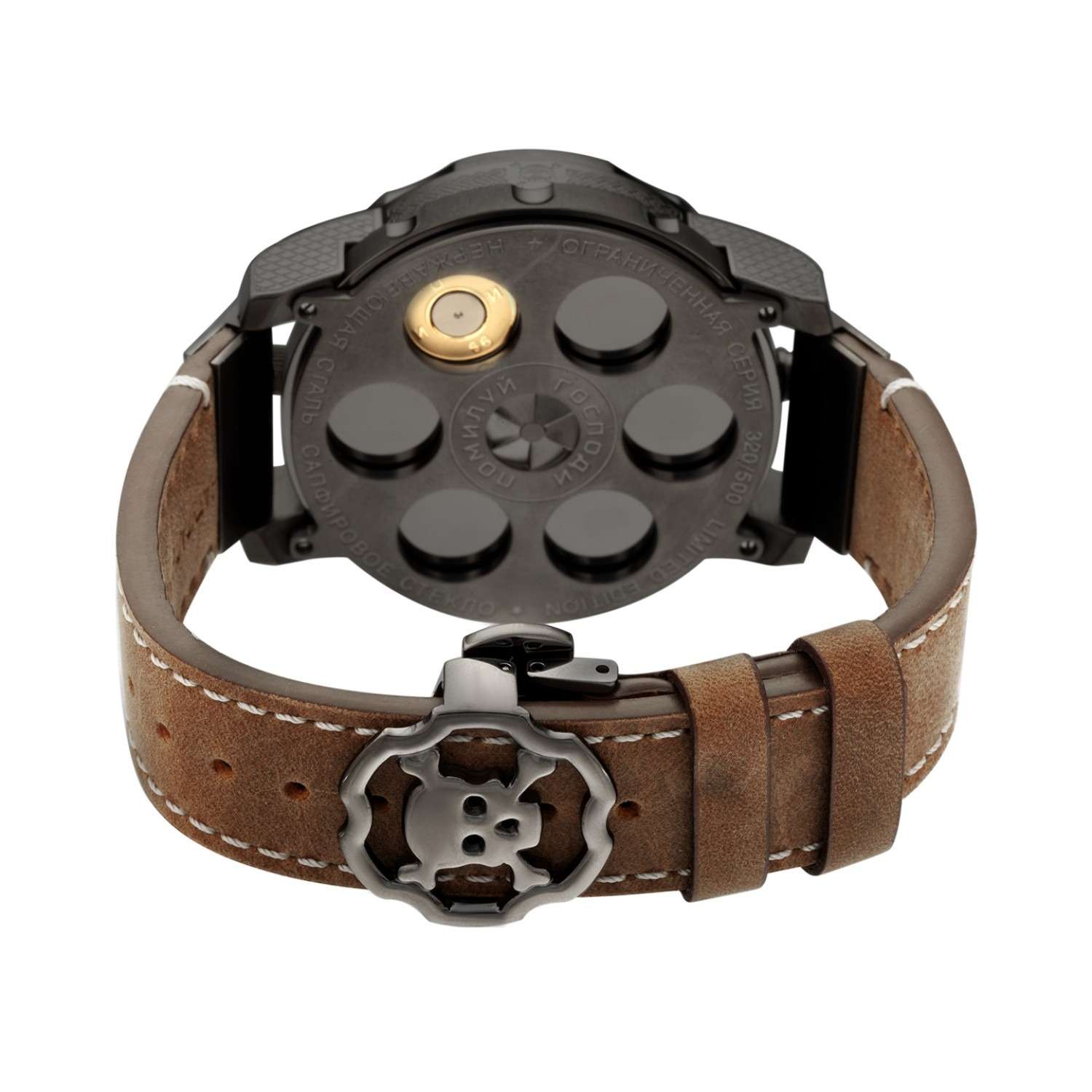 Российские механические наручные часы Слава Русская RUлетка 1906203/300-NH05, которые станут идеальным аксессуаром для повседневного ношения. Эти часы сочетают в себе элегантность и практичность, предлагая безупречный стиль и надежность. Оснащенные механизмом SEIKO NH05 с автоподзаводом, они обеспечивают точность и долговечность. Стальной корпус с черным PVDPVDУльтратонкое покрытие наносится в технике вакуумного напыления, сочетает в себе нитрид титана особой прочности со слоем золота или оксида хрома. Несёт в себе декоративную или защитную функцию. покрытием и сапфировым стекломСапфировое стеклоПрочный и надёжный материал из кристалла сапфира синтетического происхождения, характеризующийся особой твёрдостью и устойчивостью к царапинам и повреждениям. защищает циферблат с арабскими цифрами и необычными стрелками цифрами. БезельБезельВнешний ободок, закрепляющий стекло. В спортивных часах так называется поворотное кольцо с делениями на циферблате, выполняет роль таймера – замеряет отрезки времени на шкале. Неподвижный безель – элемент декора. Однонаправленно вращающийся безель на дайверских часах позволяет фиксировать моменты погружения и выныривания на поверхность. часов с PVDPVDУльтратонкое покрытие наносится в технике вакуумного напыления, сочетает в себе нитрид титана особой прочности со слоем золота или оксида хрома. Несёт в себе декоративную или защитную функцию. покрытием черного цвета. Особенность часов - искусственные бриллианты в глазах орлов и изображение черепов на циферблате. Это первые в мире часы с шестизарядным револьверным барабаном. В барабане — один патрон. Старинная забава русских офицеров и любителей острых ощущений со всего мира. Водозащита на часах до 10 ATM, что делает их надежными в различных условиях. Кожаный коричневый ремешок с застежкой «бабочка»Застёжка "бабочка"Такой вид застёжки дополняется предохранителями, помогающими избежать случайного раскрытия браслета. Обладают изящным исполнением. завершает этот изысканный образ.