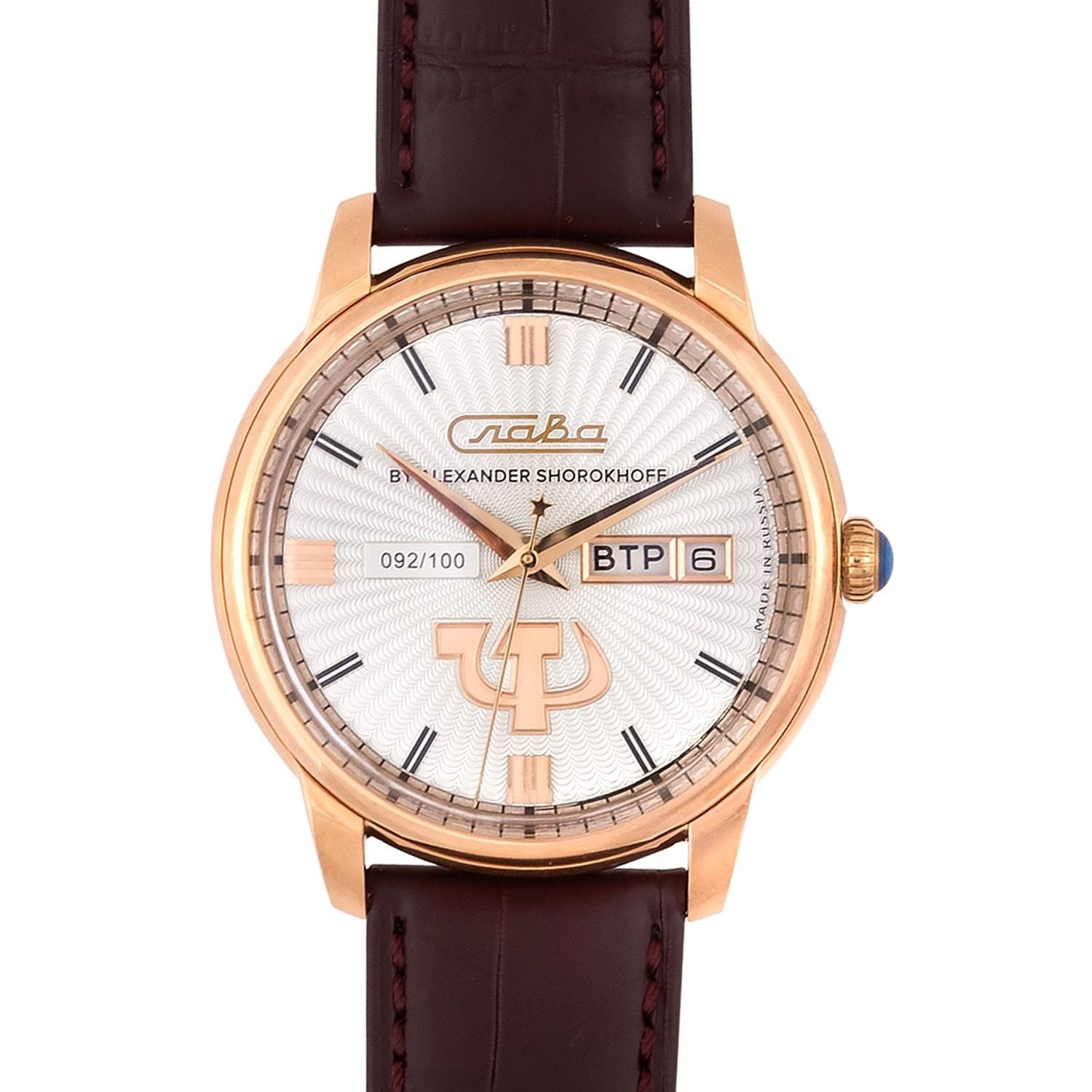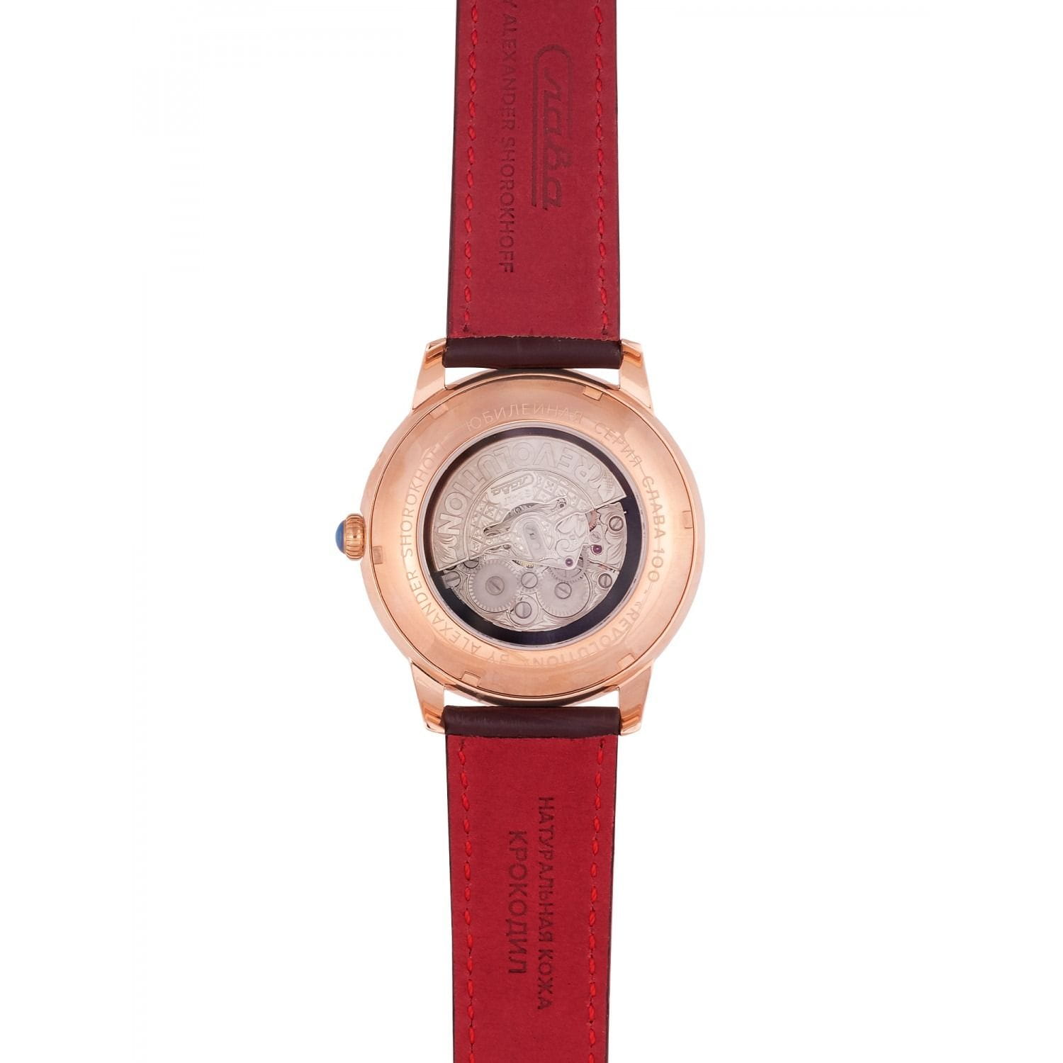 Российские механические часы с автоподзаводом Слава Революция 2603269/300-2427 созданы для тех, кто ценит стиль и надежность. Эта модель является плодом сотрудничества Часовой компании «Слава» и знаменитого мастера Александра Шорохова, который известен своим вкладом в возрождение российского часового мастерства и продвижение культуры в мире. Эти часы выполнены в соответствии с эскизами мастера, с использованием революционных символов — серпа и молота. Часы Слава «Революция» обладают механизмом с автоподзаводом «Слава 2427», украшенным ручной гравировкой, который можно наблюдать через прозрачную заднюю крышку. Этот механизм обеспечивает надежность и точность, а также добавляет элемент эксклюзивности. Корпус часов выполнен из стали c IP-покрытиемIP-покрытиеМетод ионного напыления. Демонстрирует повышенную устойчивость к истиранию, окислению и химическим веществам. Под воздействием высокого давления и температуры около 1500°C молекулы металла надёжно соединяются с частицами корпуса часов. золотистого цвета, который гармонично сочетается с белым циферблатом. Диаметр корпуса составляет 44 мм, а толщина — 14,5 мм, что делает часы выразительными и комфортными для носки. Сапфировое стеклоСапфировое стеклоПрочный и надёжный материал из кристалла сапфира синтетического происхождения, характеризующийся особой твёрдостью и устойчивостью к царапинам и повреждениям. защищает циферблат от царапин и обеспечивает долгий срок службы. Часы оснащены функцией двойного календаря, который отображает дату, что добавляет практичности в повседневной носке. Натуральный кожаный ремешок с застежкой «бабочка»Застёжка "бабочка"Такой вид застёжки дополняется предохранителями, помогающими избежать случайного раскрытия браслета. Обладают изящным исполнением. завершают образ, обеспечивая удобство и стиль. С водонепроницаемостью до 100 метров эти часы подходят для активного образа жизни, позволяя не беспокоиться о случайных контактах с водой, таких как плавание или дождь. Слава «Революция» выпускаются ограниченной серией — в трех видах по 100 штук.