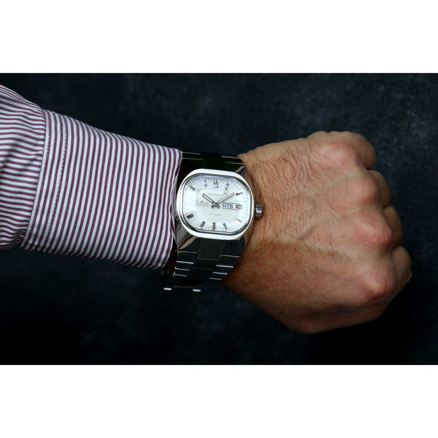 Часы Слава Танк 4320690/100-2427 — это элегантное сочетание ретро стиля и современных технологий, способное подчеркнуть изысканный вкус владельца и дополнить любой образ. Эта лимитированная серия, состоящая из 300 экземпляров, является современной интерпретацией легендарного выпуска часов, созданного специально для делегатов XXV съезда КПСС в 1975 году. Механизм часов с автоподзаводом оснащен калибром «Слава 2427». Запас хода составляет 31 час, что обеспечивает надежность и долговечность в использовании. Корпус и браслет с застежкой «бабочка»Застёжка "бабочка"Такой вид застёжки дополняется предохранителями, помогающими избежать случайного раскрытия браслета. Обладают изящным исполнением. выполнены из высококачественной стали 904L, придающей модели прочность и устойчивость к внешним воздействиям. Диаметр корпуса составляет 42 мм, а толщина — 13 мм, что делает часы удобными в ношении. Белый циферблат с метками в виде штрихов защищен выпуклым сапфировым стекломСапфировое стеклоПрочный и надёжный материал из кристалла сапфира синтетического происхождения, характеризующийся особой твёрдостью и устойчивостью к царапинам и повреждениям., стойким к царапинам. Стрелки и метки обладают люминесцентным покрытиемЛюминесцентное покрытиеПозволяет считывать показания времени в темноте. Производители наносят на стрелки, часовые индексы, безель или поверхность циферблата светонакопительный состав, дающий холодное свечение., которое светится в темноте после зарядки на свету, обеспечивая отличную видимость в любых условиях. Календарь с указанием числа и дня недели расположен в положении 3 часа, добавляя функциональности модели. Каждые часы имеют индивидуальный серийный номер, выгравированный на боковой части корпуса, что подчеркивает их уникальность. Прозрачная задняя крышка позволяет наблюдать за работой механизма, а надежный стальной браслет с раскладывающейся застежкой обеспечивает комфорт и безопасность при носке. Часы обладают водозащитой 100WR, что делает их идеальными для активного образа жизни.
