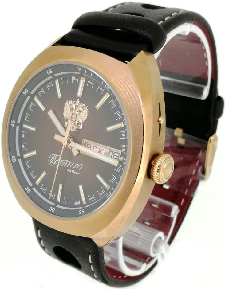 Российские механические часы Слава 5013147/300-2427, которые поддерживаются автоподзаводом, созданы для тех, кто ценит стиль и надежность. Корпус часов изготовлен из стали с IP-покрытиемIP-покрытиеМетод ионного напыления. Демонстрирует повышенную устойчивость к истиранию, окислению и химическим веществам. Под воздействием высокого давления и температуры около 1500°C молекулы металла надёжно соединяются с частицами корпуса часов., что придает им дополнительную стойкость и элегантный вид. Коричневый циферблат украшен гербом России и подписью Президента РФ, добавляя патриотичную нотку и эксклюзивность. Удобно расположенное окошко даты и дня недели в положении 3 часа делает эти часы еще более практичными. Стрелки и метки с люминесцентным покрытиемЛюминесцентное покрытиеПозволяет считывать показания времени в темноте. Производители наносят на стрелки, часовые индексы, безель или поверхность циферблата светонакопительный состав, дающий холодное свечение. облегчают чтение времени даже в условиях слабого освещения. Минеральное стеклоМинеральное стеклоМинеральное стекло представляет собой искусственно выращенный минерал кварца. Такое стекло отличается особой устойчивостью к повреждениям и царапинам. Уступает по некоторым качествам сапфировому стеклу. с сапфировым напылением защищает циферблат от царапин и повреждений, сохраняя идеальный внешний вид на протяжении долгого времени. Водозащита 100WR позволяет не беспокоиться о воздействии влаги в повседневной жизни. Часы комплектуются кожаным перфорированным ремешком, прошитым белой нитью и оснащенным классической застежкой, обеспечивая комфорт и надежность в носке.