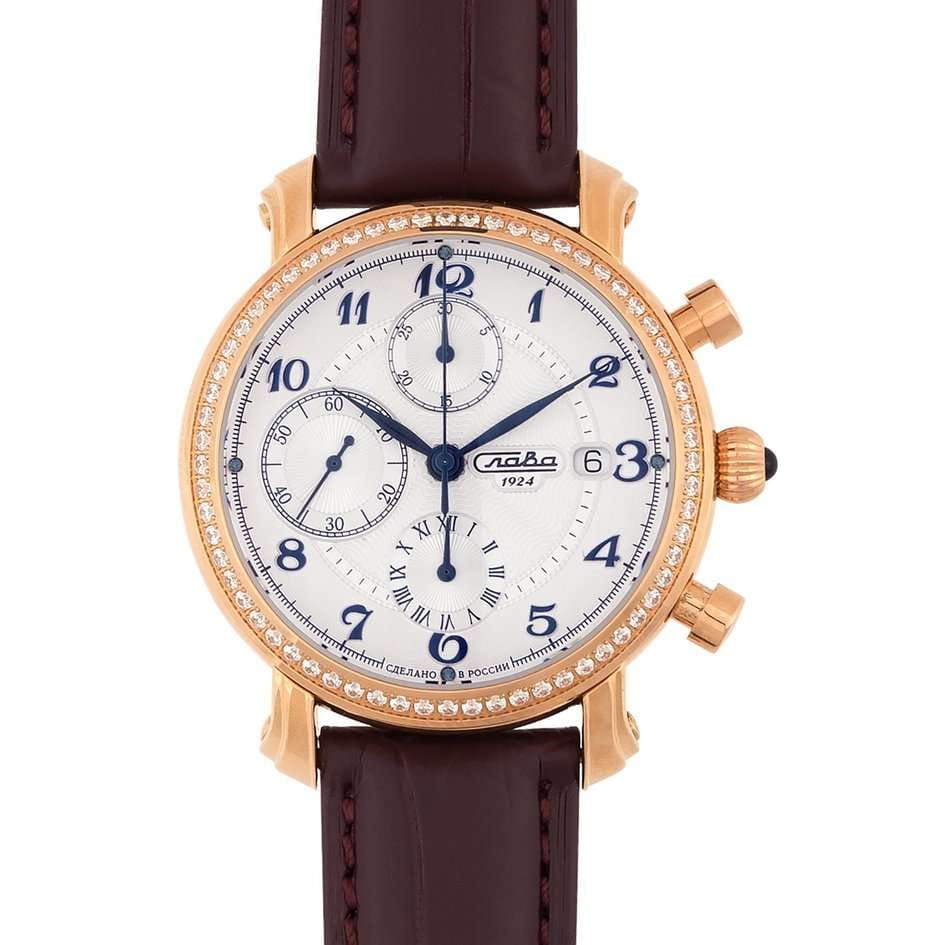 Российские механические наручные часы-хронографХронографФункция позволяет измерять отрезки времени с особой точностью: часы, минуты, секунды. Верным признаком хронографа является наличие на циферблате 3 дополнительных окошек-счётчиков. с секундомеромСекундомерСекундоме́р — прибор, способный измерять интервалы времени с точностью до долей секунды. Слава Слава России 7453618/300-7750-68 — воплощение классического стиля и исключительного качества, произведенные в России. Эта модель из лимитированной коллекции, выпущенной в количестве всего 300 экземпляров, станет великолепным дополнением к вашему образу. Часы оснащены надежным механическим механизмом Valjoux ETA 7750 с автоподзаводом, обеспечивающим точный ход. Корпус из нержавеющей стали с золотистым PVDPVDУльтратонкое покрытие наносится в технике вакуумного напыления, сочетает в себе нитрид титана особой прочности со слоем золота или оксида хрома. Несёт в себе декоративную или защитную функцию.-покрытием диаметром 41 мм и толщиной 14,2 мм отличается высокой прочностью и водозащитой до 5 ATM. БезельБезельВнешний ободок, закрепляющий стекло. В спортивных часах так называется поворотное кольцо с делениями на циферблате, выполняет роль таймера – замеряет отрезки времени на шкале. Неподвижный безель – элемент декора. Однонаправленно вращающийся безель на дайверских часах позволяет фиксировать моменты погружения и выныривания на поверхность. часов с вставками из камней циркона. Серебристый циферблат с арабскими цифрами защищен сапфировым стекломСапфировое стеклоПрочный и надёжный материал из кристалла сапфира синтетического происхождения, характеризующийся особой твёрдостью и устойчивостью к царапинам и повреждениям., устойчивым к царапинам, что позволяет надолго сохранить безупречный вид часов. На 3 часах расположено окошко с указателем даты и дня недели. Кожаный ремень с застежкой «бабочка»Застёжка "бабочка"Такой вид застёжки дополняется предохранителями, помогающими избежать случайного раскрытия браслета. Обладают изящным исполнением. добавляет элегантности и комфорта, создавая ощущение роскоши и изысканности. Эта модель станет идеальным выбором для тех, кто ценит традиции и высокое качество в сочетании с современным дизайном.