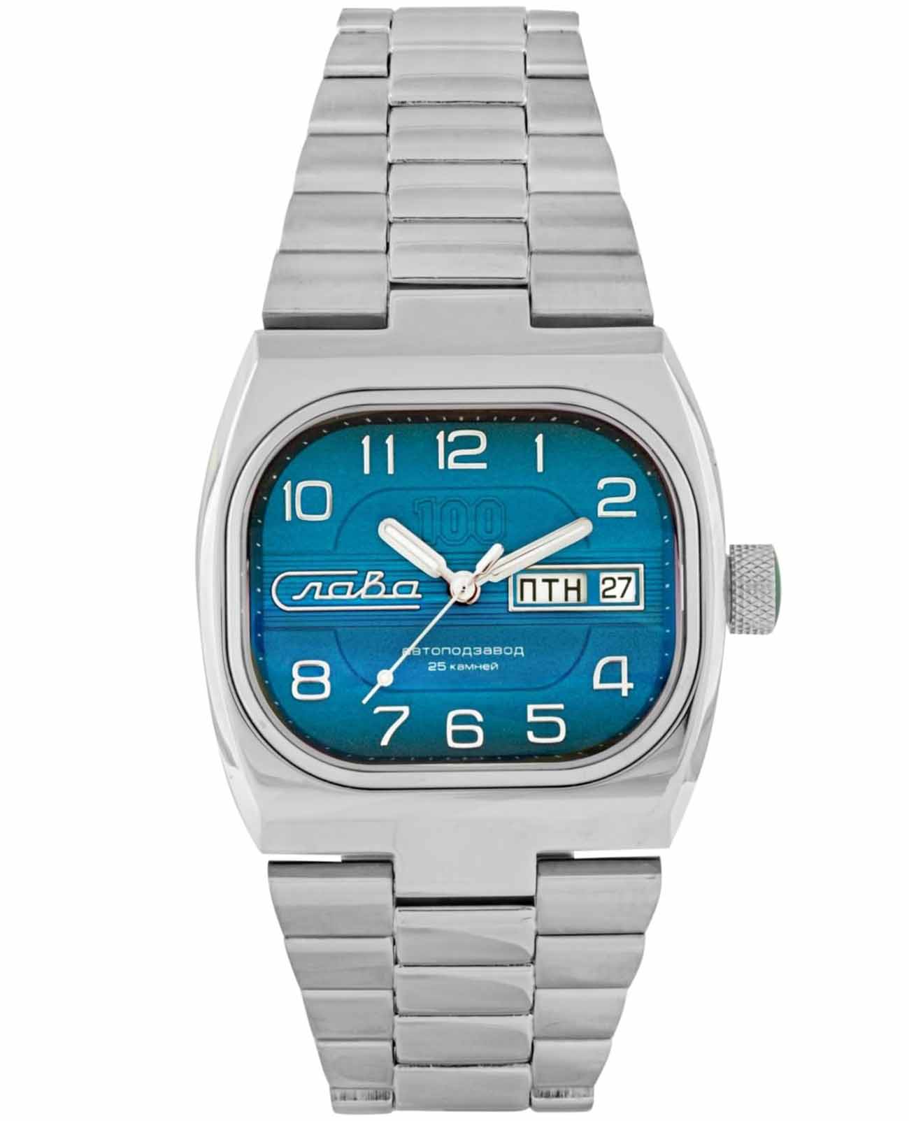 Российские часы Слава Телевизор 9045565/100-2427 оснащены механизмом Слава 2427, что обеспечивает исключительную надежность и точность хода. Корпус и браслет часов выполнены из стали, что придает им долговечность и устойчивость к внешним воздействиям. Сапфировое стеклоСапфировое стеклоПрочный и надёжный материал из кристалла сапфира синтетического происхождения, характеризующийся особой твёрдостью и устойчивостью к царапинам и повреждениям., которое еще и граненое, защищает голубой циферблат от царапин. Водозащита уровня 100WR позволяет использовать часы в различных условиях. Эти часы идеально подойдут для повседневного использования, сочетая в себе стиль, надежность и функциональность. Стрелки с люминесцентным покрытиемЛюминесцентное покрытиеПозволяет считывать показания времени в темноте. Производители наносят на стрелки, часовые индексы, безель или поверхность циферблата светонакопительный состав, дающий холодное свечение., что облегчает чтение времени даже в условиях слабого освещения. Окошки дня недели и даты находятся в положении 3 часа. Стальной браслет на застежке «бабочка»Застёжка "бабочка"Такой вид застёжки дополняется предохранителями, помогающими избежать случайного раскрытия браслета. Обладают изящным исполнением. обеспечивает комфортное и надёжное крепление на запястье. Лимитированная серия ограничена 500 экземплярами, что подчеркивает их уникальность. Эти часы станут надежным спутником в вашей повседневной жизни.