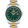 Женские наручные часы Slazenger SL.09.2142.3.03 сочетают в себе элегантный дизайн и надежность современных технологий. Модель обладает корпусом размерами 37 мм, изготовленным из суперметалла, что обеспечивает высокую устойчивость к внешним воздействиям. БезельБезельВнешний ободок, закрепляющий стекло. В спортивных часах так называется поворотное кольцо с делениями на циферблате, выполняет роль таймера – замеряет отрезки времени на шкале. Неподвижный безель – элемент декора. Однонаправленно вращающийся безель на дайверских часах позволяет фиксировать моменты погружения и выныривания на поверхность. с IP-покрытиемIP-покрытиеМетод ионного напыления. Демонстрирует повышенную устойчивость к истиранию, окислению и химическим веществам. Под воздействием высокого давления и температуры около 1500°C молекулы металла надёжно соединяются с частицами корпуса часов.. Браслет из суперметалла с частичным IP-покрытиемIP-покрытиеМетод ионного напыления. Демонстрирует повышенную устойчивость к истиранию, окислению и химическим веществам. Под воздействием высокого давления и температуры около 1500°C молекулы металла надёжно соединяются с частицами корпуса часов. гарантирует комфортное ношение и стильный внешний вид. Циферблат зеленого цвета декорирован кристаллами в виде меток. Для защиты используется минеральное стеклоМинеральное стеклоМинеральное стекло представляет собой искусственно выращенный минерал кварца. Такое стекло отличается особой устойчивостью к повреждениям и царапинам. Уступает по некоторым качествам сапфировому стеклу., обеспечивающее прочную защиту от царапин. Часы работают на кварцевом механизме, поэтому гарантирует точное время без необходимости подзаводки. Модель также оснащена функцией отображения даты, делая ее практичной для повседневного использования. Водонепроницаемость часов достигает 3 атмосфер, что позволяет использовать их при мытье рук или хождении под мелким дождем, однако не рекомендуется для плавания или других водных видов спорта. Вес модели составляет 97 грамм.