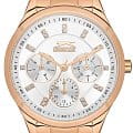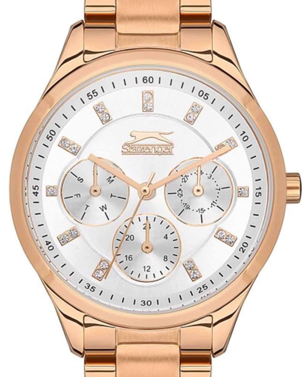 Часы Slazenger SL.09.2151.4.02 — это элегантный аксессуар, который прекрасно дополнит женственный образ. Эти наручные кварцевые часы сочетают в себе стиль и функциональность. Круглый корпус диаметром 35 мм изготовлен из суперметалла с золотистым IP-покрытиемIP-покрытиеМетод ионного напыления. Демонстрирует повышенную устойчивость к истиранию, окислению и химическим веществам. Под воздействием высокого давления и температуры около 1500°C молекулы металла надёжно соединяются с частицами корпуса часов., который отличается повышенной прочностью. Белый циферблат выполнен по технологии Sunray, что создает эффект солнечных лучей, и украшен фианитами, придающими часам особую изысканность. На циферблате расположены метки в виде штрихов и точек, а также логотип бренда. Время отображается в 12- и 24-часовом формате, а также предусмотрены отдельные индикаторы для дня недели и числа. Минеральное стеклоМинеральное стеклоМинеральное стекло представляет собой искусственно выращенный минерал кварца. Такое стекло отличается особой устойчивостью к повреждениям и царапинам. Уступает по некоторым качествам сапфировому стеклу. обеспечивает надежную защиту от царапин. Водозащита уровня 30WR позволяет защищать часы от случайных попаданий воды. Металлический браслет с золотистым IP-покрытиемIP-покрытиеМетод ионного напыления. Демонстрирует повышенную устойчивость к истиранию, окислению и химическим веществам. Под воздействием высокого давления и температуры около 1500°C молекулы металла надёжно соединяются с частицами корпуса часов. и раскладной застёжкойРаскладная застёжкаТакой тип застёжки используется только на браслетах из металла. Она никогда не раскрывается полностью, происходит разделение на 2 и более частей. Раскладывающая застёжка снизит вероятность потери часов к минимуму. гарантирует комфортное ношение и надежную фиксацию на запястье. Рифленая заводная головка добавляет удобства в управлении настройками. Эти часы станут идеальным выбором для тех, кто ценит сочетание классического дизайна и практичности.