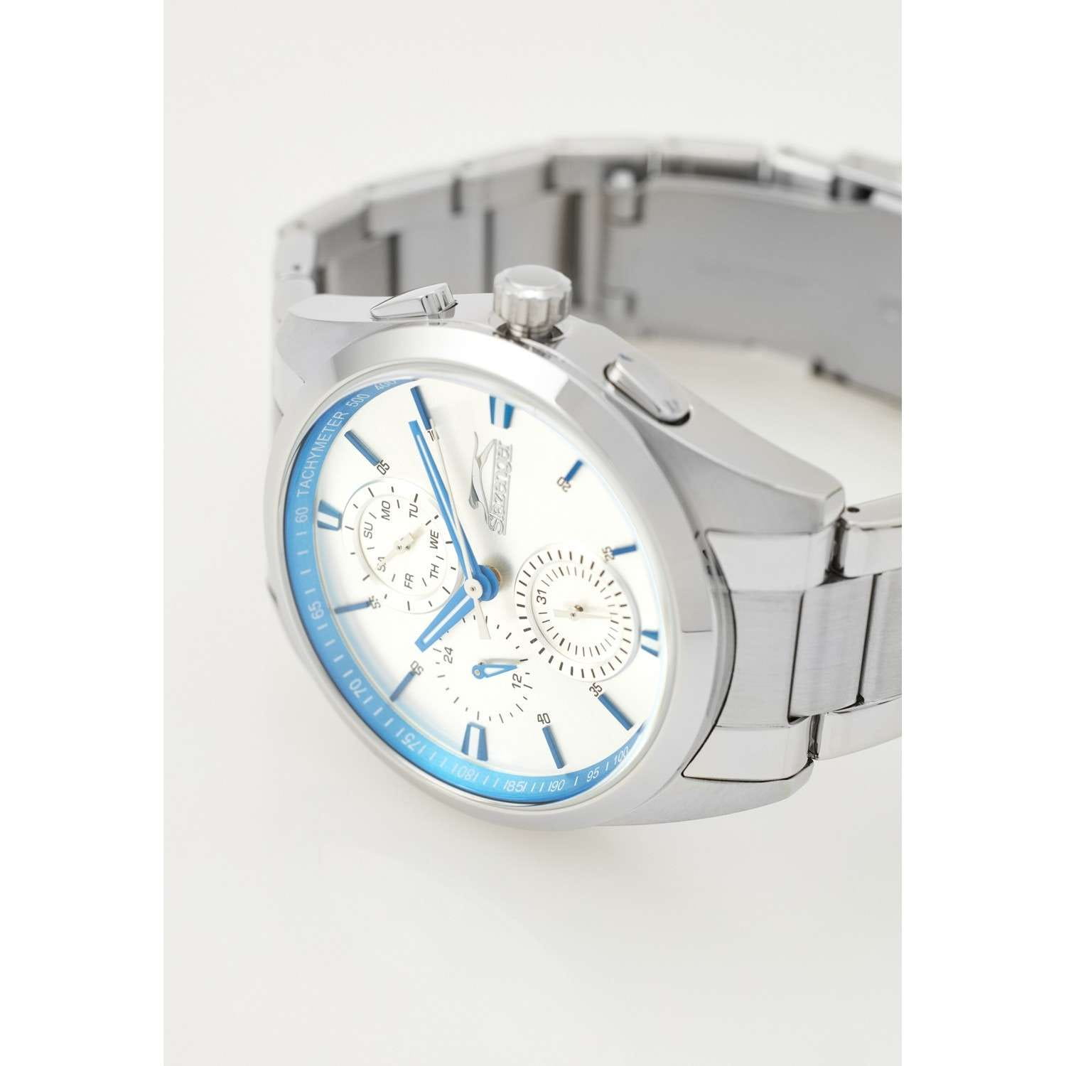 Часы Slazenger SL.09.2215.2.07 представляют собой стильные мужские наручные часы, которые сочетают в себе элегантный дизайн и функциональность. Изготовленные в Англии, эти кварцевые часы оснащены прочным металлическим корпусом и металлическим браслетом с раскладной застёжкойРаскладная застёжкаТакой тип застёжки используется только на браслетах из металла. Она никогда не раскрывается полностью, происходит разделение на 2 и более частей. Раскладывающая застёжка снизит вероятность потери часов к минимуму., который обеспечивает надежную фиксацию на запястье. Минеральное стеклоМинеральное стеклоМинеральное стекло представляет собой искусственно выращенный минерал кварца. Такое стекло отличается особой устойчивостью к повреждениям и царапинам. Уступает по некоторым качествам сапфировому стеклу. защищает серебристый циферблат от царапин, а водозащита WR 50 позволяет использовать их в условиях повышенной влажности. Диаметр корпуса составляет 43 мм, а толщина — 14 мм, что делает часы удобными для ежедневного ношения. Ширина ремешка — 22 мм, что обеспечивает комфорт и стильный вид на руке. Дополнительные функции включают отображение второго часового поясаВторой часовой поясФункция, позволяющая отображать время двух часовых поясов одновременно., дня недели и текущего времени в 24-часовом формате, а также наличие окошка даты для удобства пользователя. Стрелки снабжены люминесцентным покрытиемЛюминесцентное покрытиеПозволяет считывать показания времени в темноте. Производители наносят на стрелки, часовые индексы, безель или поверхность циферблата светонакопительный состав, дающий холодное свечение., что позволяет легко считывать время в темноте. Часы также оснащены тахиметромТахиметрРазмеченная шкала, располагается на ободке или безеле часов. Тахиметр позволяет рассчитать скорость на определённом участке пути, расстояние измеряется в километрах или милях., что добавляет им функциональности и может быть полезно для измерения скорости.