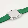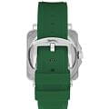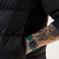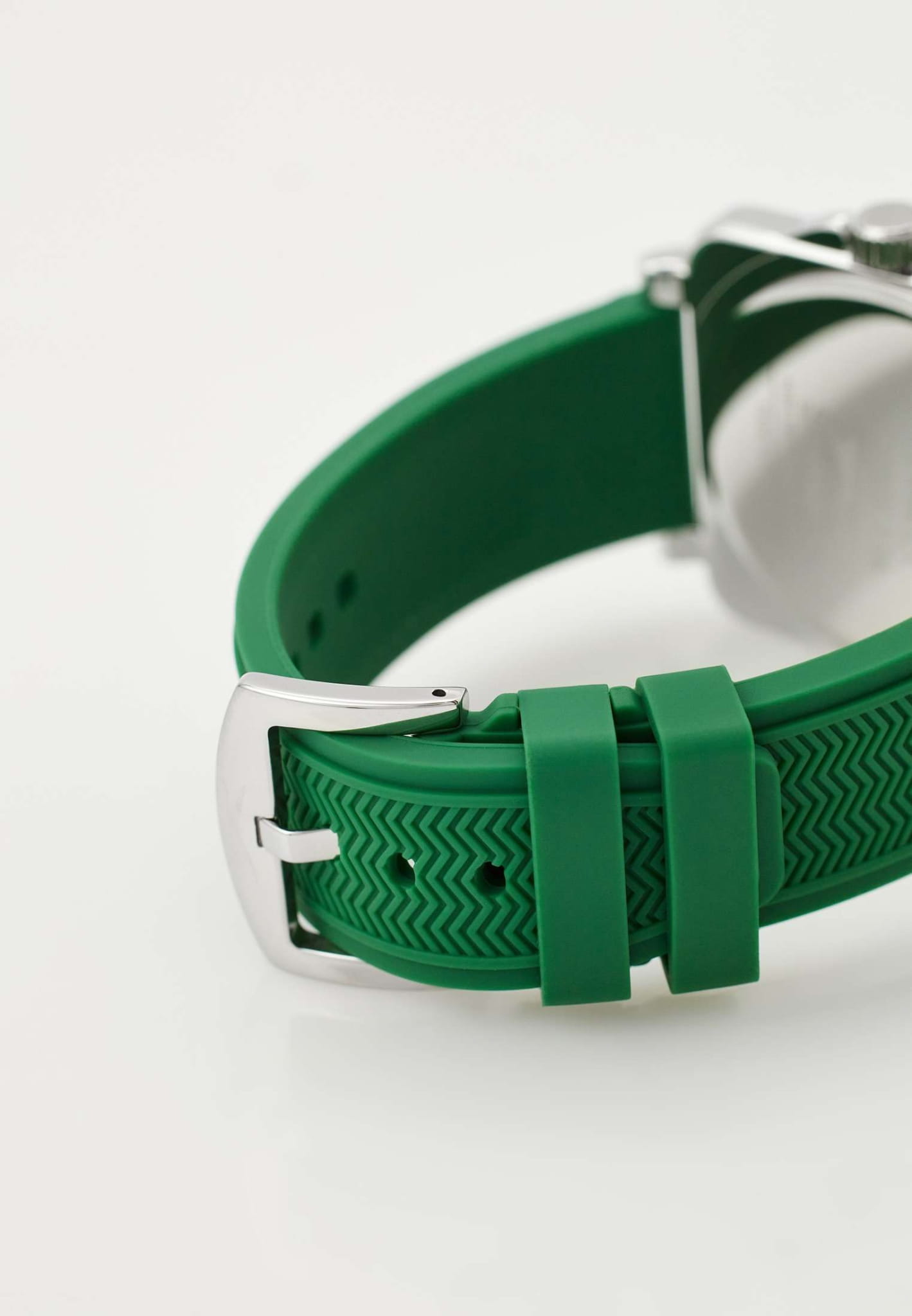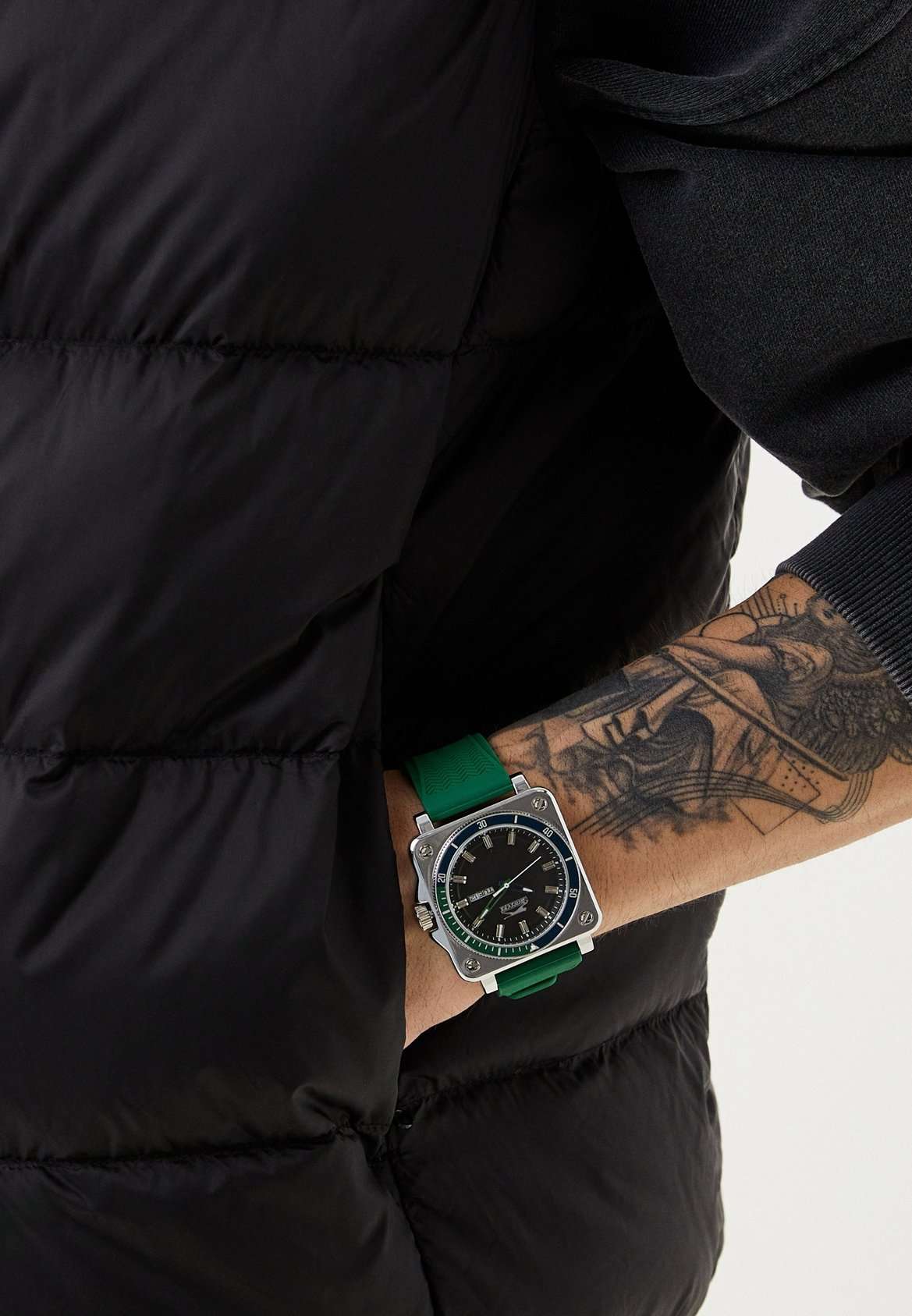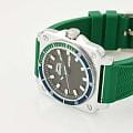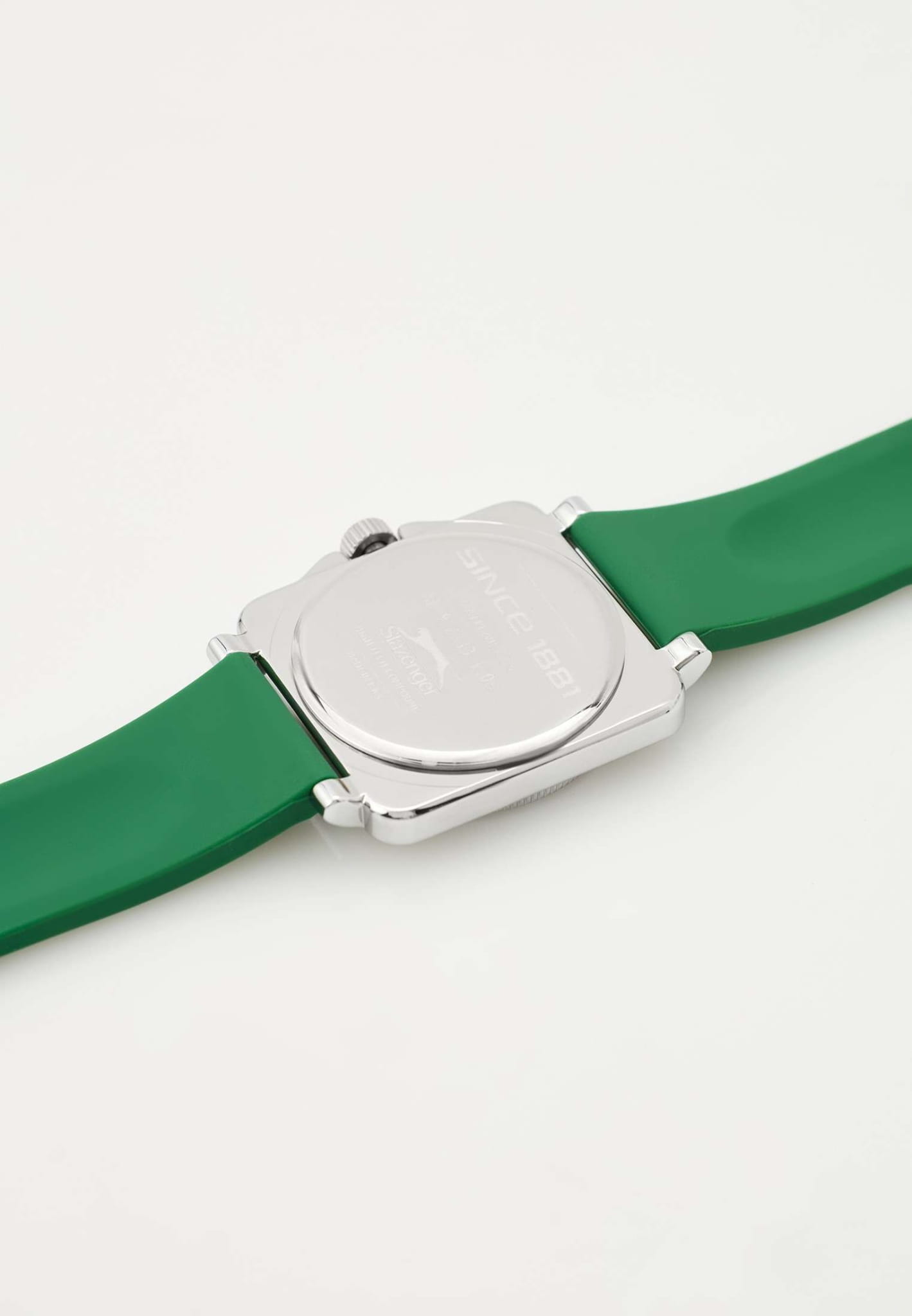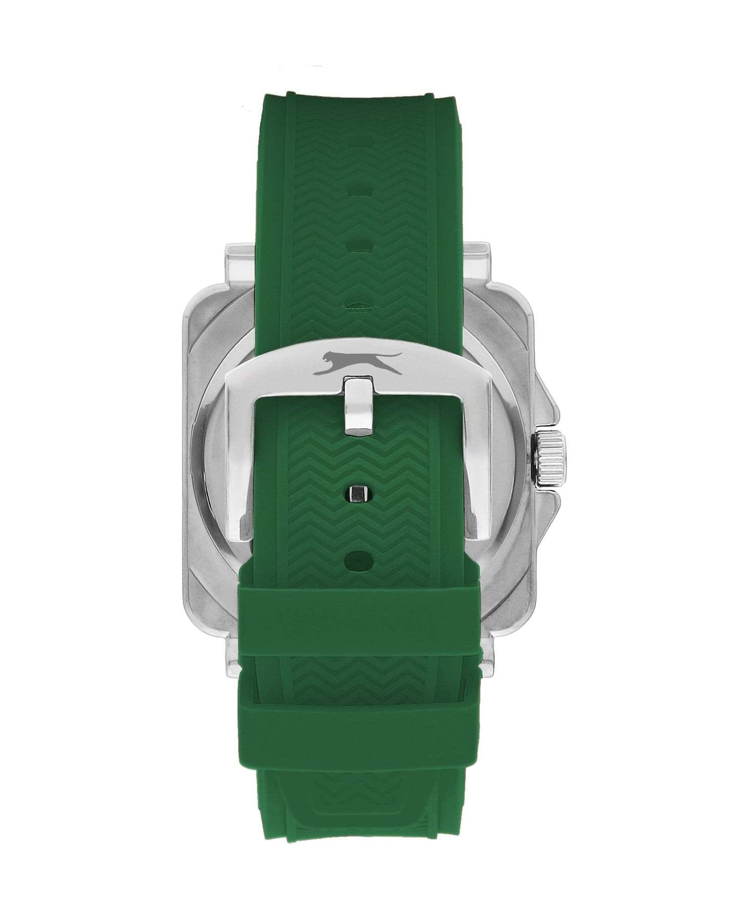 Часы Slazenger SL.09.2233.1.06 — это современная модель, сочетающая стиль и практичность. Корпус квадратной формы выполнен из прочного металла, а круглый черный циферблат придает дизайну особую выразительность. На вращающийся безельБезельВнешний ободок, закрепляющий стекло. В спортивных часах так называется поворотное кольцо с делениями на циферблате, выполняет роль таймера – замеряет отрезки времени на шкале. Неподвижный безель – элемент декора. Однонаправленно вращающийся безель на дайверских часах позволяет фиксировать моменты погружения и выныривания на поверхность. нанесено синее и зеленое IP-покрытиеIP-покрытиеМетод ионного напыления. Демонстрирует повышенную устойчивость к истиранию, окислению и химическим веществам. Под воздействием высокого давления и температуры около 1500°C молекулы металла надёжно соединяются с частицами корпуса часов.. Резиновый зеленый ремешок с классической застежкой обеспечивает удобство при повседневном ношении. Модель оснащена кварцевым механизмом, минеральное стеклоМинеральное стеклоМинеральное стекло представляет собой искусственно выращенный минерал кварца. Такое стекло отличается особой устойчивостью к повреждениям и царапинам. Уступает по некоторым качествам сапфировому стеклу., защищающим от случайных повреждений, и водозащитой уровня WR 50, позволяющей не бояться контакта с водой в повседневных ситуациях. На циферблате расположены окошки даты и дня недели. Для удобства использования в темное время суток предусмотрено люминесцентное покрытиеЛюминесцентное покрытиеПозволяет считывать показания времени в темноте. Производители наносят на стрелки, часовые индексы, безель или поверхность циферблата светонакопительный состав, дающий холодное свечение. стрелок. Заводная головка дополнительно защищена от случайных нажатий. Габариты корпуса составляют 43 на 43 мм, толщина — 11 мм.