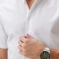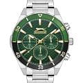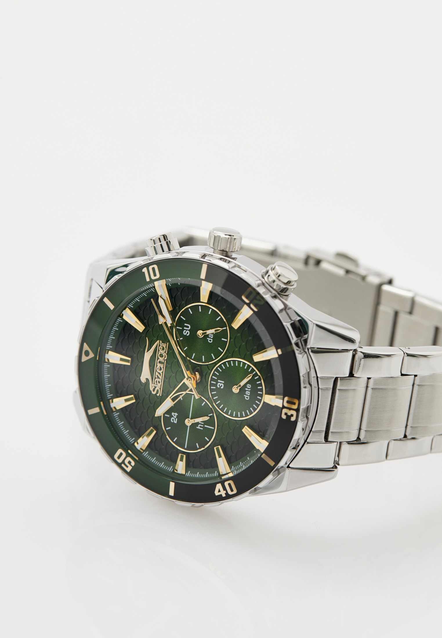 Часы Slazenger SL.09.2236.2.03 — это стильная и надежная модель, которая станет отличным выбором для активного современного мужчины. Крупный корпус диаметром 46 мм выполнен из прочного металла, а серебристый металлический браслет оснащён удобной раскладной застёжкойРаскладная застёжкаТакой тип застёжки используется только на браслетах из металла. Она никогда не раскрывается полностью, происходит разделение на 2 и более частей. Раскладывающая застёжка снизит вероятность потери часов к минимуму., что обеспечивает комфорт при повседневном ношении. На безельБезельВнешний ободок, закрепляющий стекло. В спортивных часах так называется поворотное кольцо с делениями на циферблате, выполняет роль таймера – замеряет отрезки времени на шкале. Неподвижный безель – элемент декора. Однонаправленно вращающийся безель на дайверских часах позволяет фиксировать моменты погружения и выныривания на поверхность. нанесено черное и зеленое IP-покрытиеIP-покрытиеМетод ионного напыления. Демонстрирует повышенную устойчивость к истиранию, окислению и химическим веществам. Под воздействием высокого давления и температуры около 1500°C молекулы металла надёжно соединяются с частицами корпуса часов.. Минеральное стеклоМинеральное стеклоМинеральное стекло представляет собой искусственно выращенный минерал кварца. Такое стекло отличается особой устойчивостью к повреждениям и царапинам. Уступает по некоторым качествам сапфировому стеклу. защищает текстурированный зеленый циферблат от случайных царапин, а водозащита уровня WR 50 позволяет не переживать о попадании влаги при контакте с водой. На циферблате расположены дополнительные малые циферблаты с отображением даты, дня недели и времени в 24-часовом формате, что делает использование часов максимально функциональным. Для удобства использования в темное время суток предусмотрено люминесцентное покрытиеЛюминесцентное покрытиеПозволяет считывать показания времени в темноте. Производители наносят на стрелки, часовые индексы, безель или поверхность циферблата светонакопительный состав, дающий холодное свечение. стрелок. Толщина корпуса составляет 13 мм, вес часов — 152 грамма.