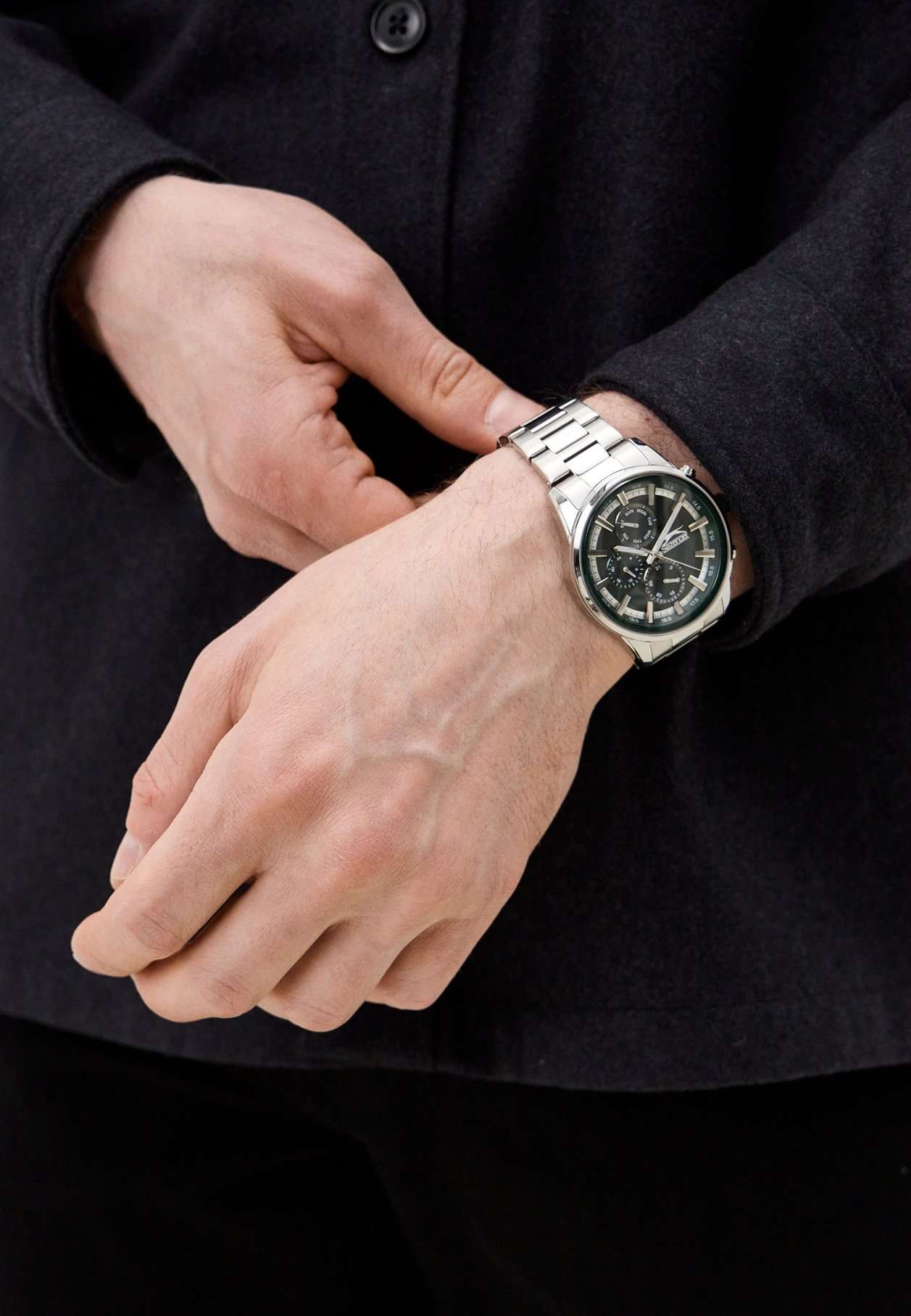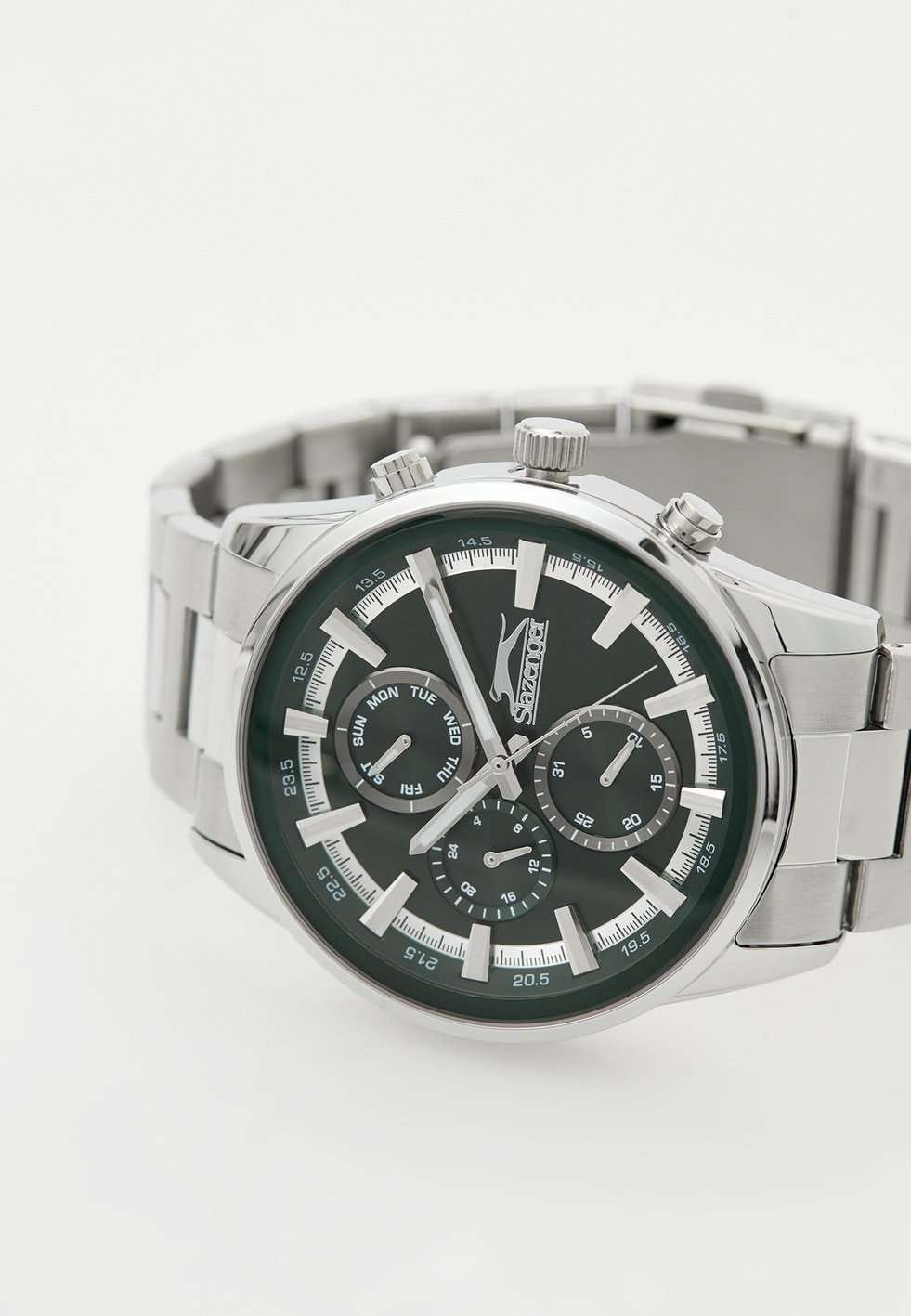 Часы Slazenger SL.09.2242.2.05 – это стильная и надежная модель, созданная для современных мужчин, ценящих качество и функциональность. Корпус и браслет выполнены из прочного металла серебряного цвета, что придает аксессуару элегантный внешний вид и обеспечивает долговечность. Часы фиксируются на руке с помощью браслета с удобной раскладной застёжкойРаскладная застёжкаТакой тип застёжки используется только на браслетах из металла. Она никогда не раскрывается полностью, происходит разделение на 2 и более частей. Раскладывающая застёжка снизит вероятность потери часов к минимуму.. Кварцевый механизм гарантирует точность хода, а минеральное стеклоМинеральное стеклоМинеральное стекло представляет собой искусственно выращенный минерал кварца. Такое стекло отличается особой устойчивостью к повреждениям и царапинам. Уступает по некоторым качествам сапфировому стеклу. защищает зеленый циферблат от царапин и повреждений. Диаметр корпуса составляет 46 мм, толщина – 13 мм, ширина ремешка – 24 мм, а вес часов – 146 грамм, что делает их удобными для повседневного ношения. Водозащита уровня WR 50 позволяет не снимать часы во время мытья рук и при незначительном контакте с водой. Для удобства использования в темное время суток предусмотрено люминесцентное покрытиеЛюминесцентное покрытиеПозволяет считывать показания времени в темноте. Производители наносят на стрелки, часовые индексы, безель или поверхность циферблата светонакопительный состав, дающий холодное свечение. стрелок. Модель оснащена дополнительными циферблатами, отображающими дату, день недели и текущее время в 24-часовом формате.