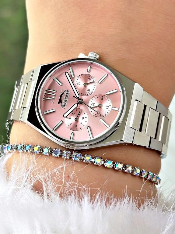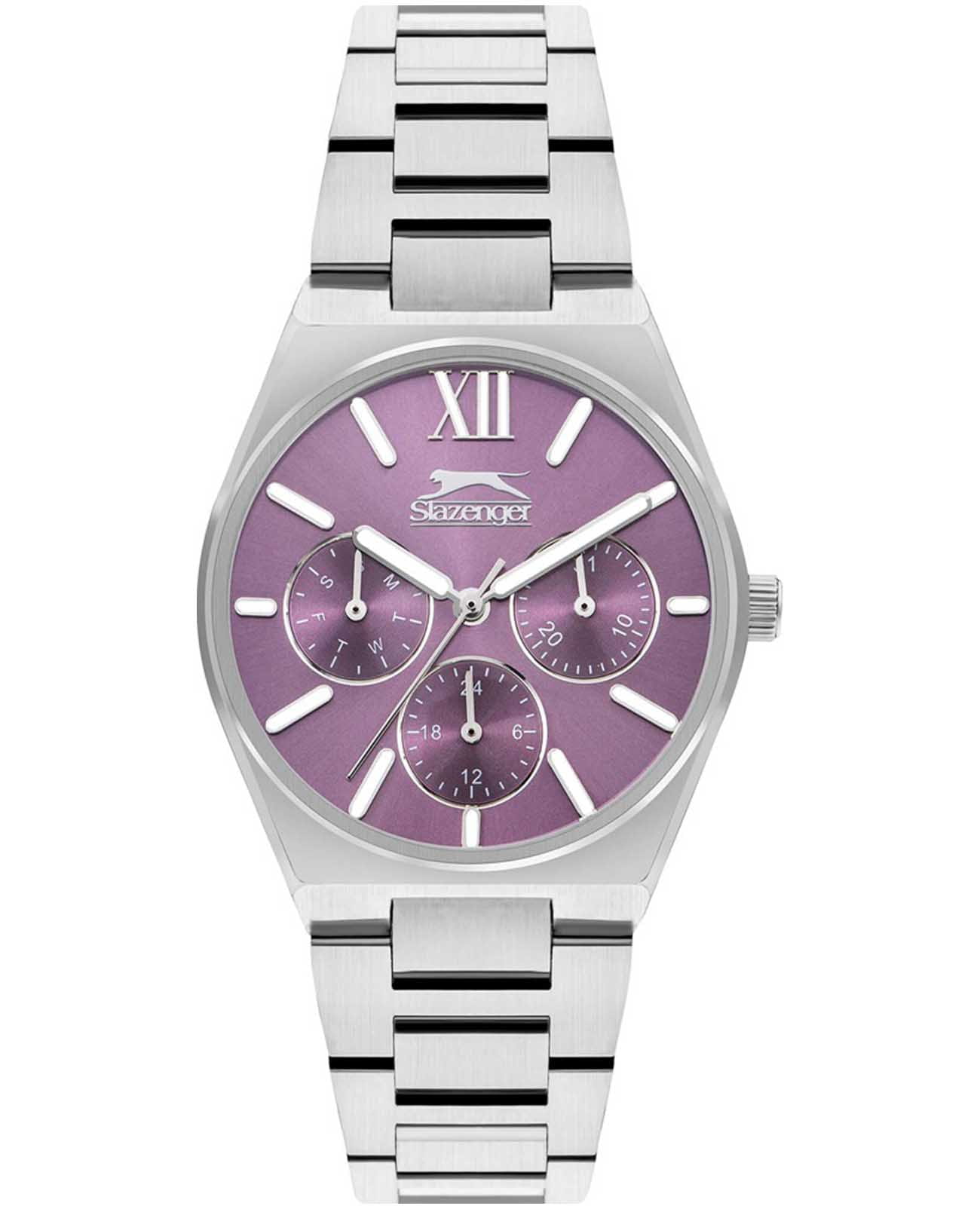 Часы Slazenger SL.09.2243.4.02 сочетают в себе элегантный дизайн и практичность для повседневного использования. Модель выполнена в изысканном серебряном цвете, корпус и браслет изготовлены из прочного металла, что обеспечивает надежность и долговечность изделия. Кварцевый механизм гарантирует точность хода, а минеральное стеклоМинеральное стеклоМинеральное стекло представляет собой искусственно выращенный минерал кварца. Такое стекло отличается особой устойчивостью к повреждениям и царапинам. Уступает по некоторым качествам сапфировому стеклу. защищает розовый циферблат от механических повреждений. Диаметр корпуса составляет 34 мм, толщина — 9 мм, ширина ремешка — 20 мм, а общий вес часов — всего 87 грамм, что делает их легкими и комфортными на руке. Уровень водозащиты WR 30 позволяет не беспокоиться о случайных брызгах. Для удобства использования в темное время суток предусмотрено люминесцентное покрытиеЛюминесцентное покрытиеПозволяет считывать показания времени в темноте. Производители наносят на стрелки, часовые индексы, безель или поверхность циферблата светонакопительный состав, дающий холодное свечение. стрелок и меток. Дополнительные малые циферблаты отображают дату, день недели и время в 24-часовом формате. Часы оснащены металлическим браслетом с надежной раскладной застёжкойРаскладная застёжкаТакой тип застёжки используется только на браслетах из металла. Она никогда не раскрывается полностью, происходит разделение на 2 и более частей. Раскладывающая застёжка снизит вероятность потери часов к минимуму..