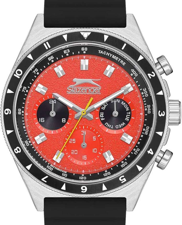 Часы Slazenger SL.09.2247.2.06 — это современная модель с выразительным спортивным характером, идеально подходящая для активного образа жизни. Корпус выполнен из прочного металла, красный циферблат защищён минеральным стекломМинеральное стеклоМинеральное стекло представляет собой искусственно выращенный минерал кварца. Такое стекло отличается особой устойчивостью к повреждениям и царапинам. Уступает по некоторым качествам сапфировому стеклу., устойчивым к царапинам. Часы также оснащены шкалой тахиметраТахиметрРазмеченная шкала, располагается на ободке или безеле часов. Тахиметр позволяет рассчитать скорость на определённом участке пути, расстояние измеряется в километрах или милях., что добавляет им функциональности и может быть полезно для измерения скорости. На безельБезельВнешний ободок, закрепляющий стекло. В спортивных часах так называется поворотное кольцо с делениями на циферблате, выполняет роль таймера – замеряет отрезки времени на шкале. Неподвижный безель – элемент декора. Однонаправленно вращающийся безель на дайверских часах позволяет фиксировать моменты погружения и выныривания на поверхность. нанесено черное IP-покрытиеIP-покрытиеМетод ионного напыления. Демонстрирует повышенную устойчивость к истиранию, окислению и химическим веществам. Под воздействием высокого давления и температуры около 1500°C молекулы металла надёжно соединяются с частицами корпуса часов.. Диаметр корпуса составляет 46 мм, толщина — 11 мм, а ширина ремешка — 22 мм. Лёгкий и комфортный чёрный резиновый ремешок оснащён классической застёжкой, благодаря чему часы удобно сидят на руке и не вызывают дискомфорта даже при длительном ношении. Вес модели составляет всего 79 грамм. Надёжный кварцевый механизм обеспечивает точность времени, а уровень водозащиты WR 50 позволяет использовать часы в повседневных условиях, не опасаясь случайных брызг или дождя. Для удобства использования в темное время суток предусмотрено люминесцентное покрытиеЛюминесцентное покрытиеПозволяет считывать показания времени в темноте. Производители наносят на стрелки, часовые индексы, безель или поверхность циферблата светонакопительный состав, дающий холодное свечение. стрелок и меток. Дополнительные малые циферблаты показывают дату, день недели и текущее время в 24-часовом формате, что делает использование часов ещё более удобным и функциональным.