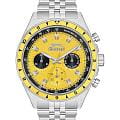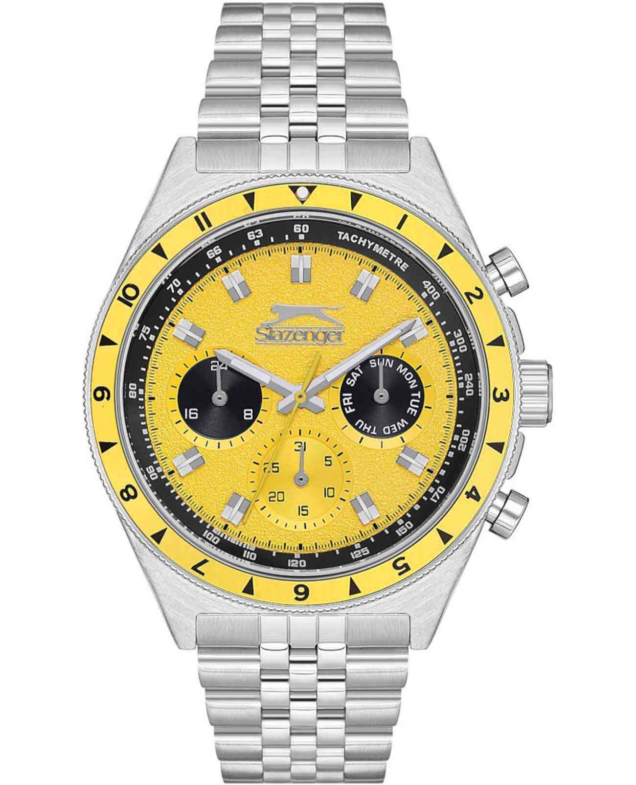 Часы Slazenger SL.09.2248.2.04 — это современная модель с выразительным спортивным характером, идеально подходящая для активного образа жизни. Корпус выполнен из прочного металла, желтый циферблат защищён минеральным стекломМинеральное стеклоМинеральное стекло представляет собой искусственно выращенный минерал кварца. Такое стекло отличается особой устойчивостью к повреждениям и царапинам. Уступает по некоторым качествам сапфировому стеклу., устойчивым к царапинам. Часы также оснащены шкалой тахиметраТахиметрРазмеченная шкала, располагается на ободке или безеле часов. Тахиметр позволяет рассчитать скорость на определённом участке пути, расстояние измеряется в километрах или милях., что добавляет им функциональности и может быть полезно для измерения скорости.  На безельБезельВнешний ободок, закрепляющий стекло. В спортивных часах так называется поворотное кольцо с делениями на циферблате, выполняет роль таймера – замеряет отрезки времени на шкале. Неподвижный безель – элемент декора. Однонаправленно вращающийся безель на дайверских часах позволяет фиксировать моменты погружения и выныривания на поверхность. нанесено желтое IP-покрытиеIP-покрытиеМетод ионного напыления. Демонстрирует повышенную устойчивость к истиранию, окислению и химическим веществам. Под воздействием высокого давления и температуры около 1500°C молекулы металла надёжно соединяются с частицами корпуса часов..  Диаметр корпуса составляет 46 мм, толщина — 11 мм, а ширина браслета — 22 мм.  Часы оснащены металлическим браслетом с надежной раскладной застёжкойРаскладная застёжкаТакой тип застёжки используется только на браслетах из металла. Она никогда не раскрывается полностью, происходит разделение на 2 и более частей. Раскладывающая застёжка снизит вероятность потери часов к минимуму., благодаря чему часы удобно сидят на руке и не вызывают дискомфорта даже при длительном ношении. Вес модели составляет 130 грамм. Надёжный кварцевый механизм обеспечивает точность времени, а уровень водозащиты WR 50 позволяет использовать часы в повседневных условиях, не опасаясь случайных брызг или дождя. Для удобства использования в темное время суток предусмотрено люминесцентное покрытиеЛюминесцентное покрытиеПозволяет считывать показания времени в темноте. Производители наносят на стрелки, часовые индексы, безель или поверхность циферблата светонакопительный состав, дающий холодное свечение. стрелок и меток. Дополнительные малые циферблаты показывают дату, день недели и текущее время в 24-часовом формате, что делает использование часов ещё более удобным и функциональным.