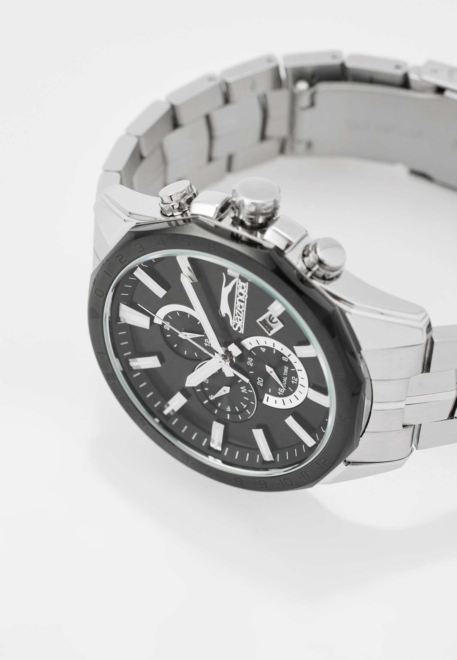 Часы Slazenger SL.09.2259.2.01 — это стильный и многофункциональный аксессуар, который станет достойным дополнением к вашему образу. Корпус и браслет модели выполнены из современного суперметалла — прочного сплава на основе меди с пониженным содержанием цинка и никеля, а также инновационным покрытием, что обеспечивает долговечность и привлекательный внешний вид. На безельБезельВнешний ободок, закрепляющий стекло. В спортивных часах так называется поворотное кольцо с делениями на циферблате, выполняет роль таймера – замеряет отрезки времени на шкале. Неподвижный безель – элемент декора. Однонаправленно вращающийся безель на дайверских часах позволяет фиксировать моменты погружения и выныривания на поверхность. нанесено черное IP-покрытиеIP-покрытиеМетод ионного напыления. Демонстрирует повышенную устойчивость к истиранию, окислению и химическим веществам. Под воздействием высокого давления и температуры около 1500°C молекулы металла надёжно соединяются с частицами корпуса часов., что придает аксессуару утончённый и универсальный внешний вид. Под минеральным стекломМинеральное стеклоМинеральное стекло представляет собой искусственно выращенный минерал кварца. Такое стекло отличается особой устойчивостью к повреждениям и царапинам. Уступает по некоторым качествам сапфировому стеклу. находится насыщенно чёрный циферблат с дополнительными функциями: вынесенный 24-часовой индикатор, указатель дня недели, окно даты в положении между 4 и 5 часами, а также функция GMTGMTОтображение времени второго часового пояса.Такая функция особенно актуальна для путешественников и бизнесменов,которые общаются с людьми из разных стран,теперь вы всегда будете знать,какой час у вашего партнёра или близкого человека. для отслеживания второго часового поясаВторой часовой поясФункция, позволяющая отображать время двух часовых поясов одновременно. — всё это делает модель особенно удобной при активном образе жизни и путешествиях. Кварцевый механизм гарантирует высокую точность хода. Диаметр корпуса составляет 46 мм, толщина — 12 мм, что подчёркивает современный характер часов. Стрелки с люминесцентным покрытиемЛюминесцентное покрытиеПозволяет считывать показания времени в темноте. Производители наносят на стрелки, часовые индексы, безель или поверхность циферблата светонакопительный состав, дающий холодное свечение. удобно подсвечиваются в темноте после зарядки на свету. Стальной браслет с раскладной застёжкойРаскладная застёжкаТакой тип застёжки используется только на браслетах из металла. Она никогда не раскрывается полностью, происходит разделение на 2 и более частей. Раскладывающая застёжка снизит вероятность потери часов к минимуму. обеспечивает комфортную посадку. Водозащита до 5 атмосфер позволяет не опасаться случайных брызг или дождя. Часы идеально подходят для ежедневного ношения и особых случаев, а также станут отличным подарком.