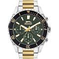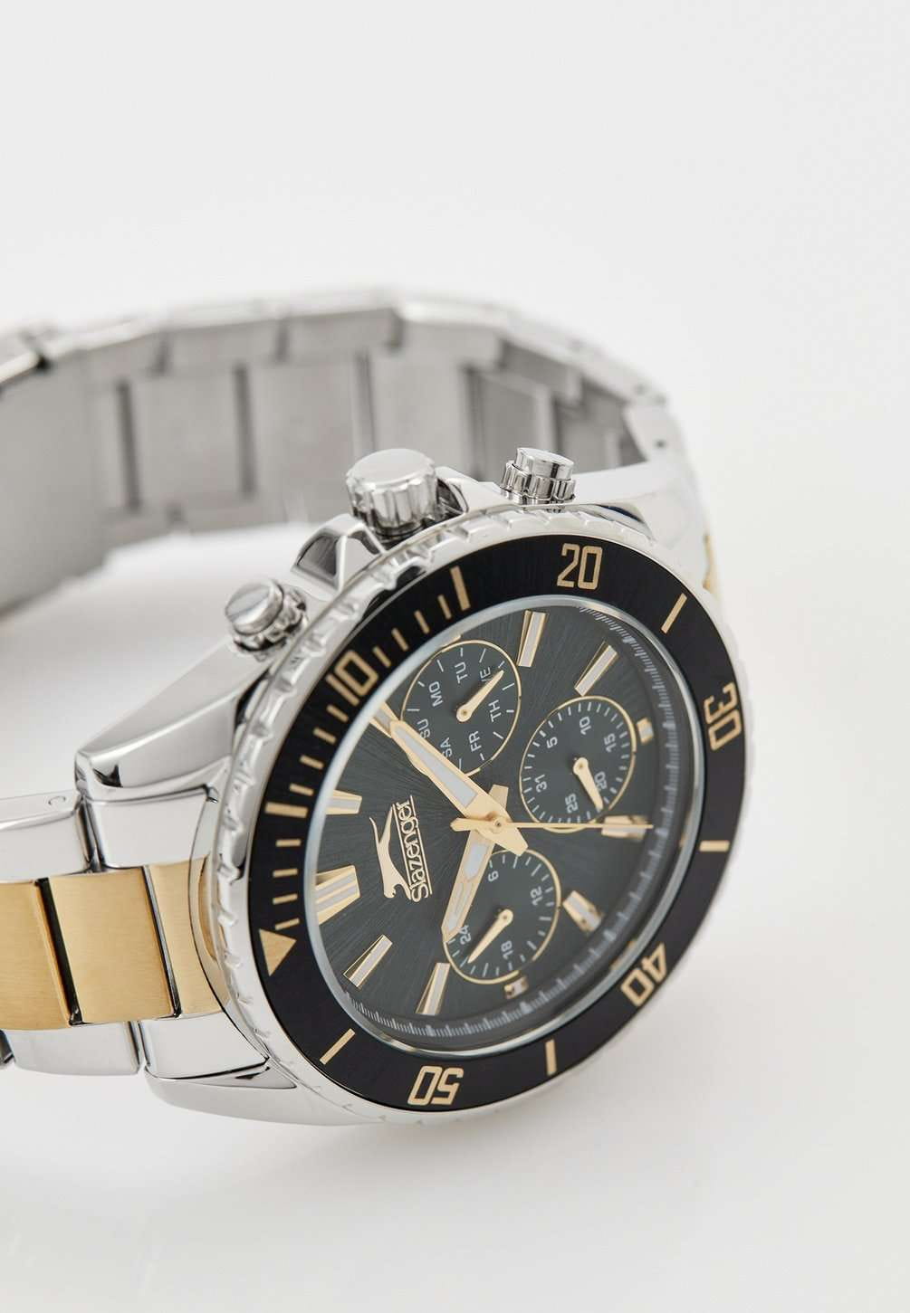 Часы Slazenger SL.09.2273.2.05 – стильный и функциональный аксессуар, который станет достойным дополнением к вашему образу. Модель оснащена надежным кварцевым механизмом, заключенным в корпус из инновационного суперметалла – прочного сплава на основе меди с пониженным содержанием цинка и никеля и специальным покрытием, устойчивым к износу. На безельБезельВнешний ободок, закрепляющий стекло. В спортивных часах так называется поворотное кольцо с делениями на циферблате, выполняет роль таймера – замеряет отрезки времени на шкале. Неподвижный безель – элемент декора. Однонаправленно вращающийся безель на дайверских часах позволяет фиксировать моменты погружения и выныривания на поверхность. нанесено черное IP-покрытиеIP-покрытиеМетод ионного напыления. Демонстрирует повышенную устойчивость к истиранию, окислению и химическим веществам. Под воздействием высокого давления и температуры около 1500°C молекулы металла надёжно соединяются с частицами корпуса часов., что придает аксессуару утончённый и универсальный внешний вид. Зеленый циферблат под минеральным стекломМинеральное стеклоМинеральное стекло представляет собой искусственно выращенный минерал кварца. Такое стекло отличается особой устойчивостью к повреждениям и царапинам. Уступает по некоторым качествам сапфировому стеклу. дополнен отдельными счетчиками: 24-часовой указатель времени, индикаторы даты и дня недели. Диаметр корпуса составляет 44 мм, а толщина – 12 мм, что обеспечивает комфортную посадку на запястье и подчёркивает современный стиль часов. Браслет из суперметалла с частичным золотистым IP-покрытиемIP-покрытиеМетод ионного напыления. Демонстрирует повышенную устойчивость к истиранию, окислению и химическим веществам. Под воздействием высокого давления и температуры около 1500°C молекулы металла надёжно соединяются с частицами корпуса часов. и с раскладной застёжкойРаскладная застёжкаТакой тип застёжки используется только на браслетах из металла. Она никогда не раскрывается полностью, происходит разделение на 2 и более частей. Раскладывающая застёжка снизит вероятность потери часов к минимуму. обеспечивает комфортную посадку. Стрелки и метки с люминесцентным покрытиемЛюминесцентное покрытиеПозволяет считывать показания времени в темноте. Производители наносят на стрелки, часовые индексы, безель или поверхность циферблата светонакопительный состав, дающий холодное свечение. удобно подсвечиваются в темноте после зарядки на свету. Водонепроницаемость 5 АТМ защищает механизм от брызг и дождя, позволяя не беспокоиться о сохранности аксессуара в повседневной жизни. Эта модель станет отличным выбором для ежедневного ношения или особых случаев и прекрасным подарком для мужчины к любому празднику.