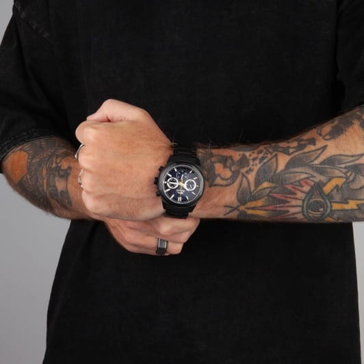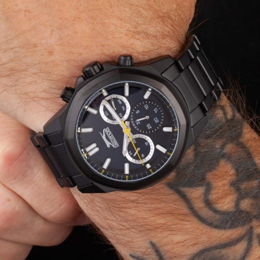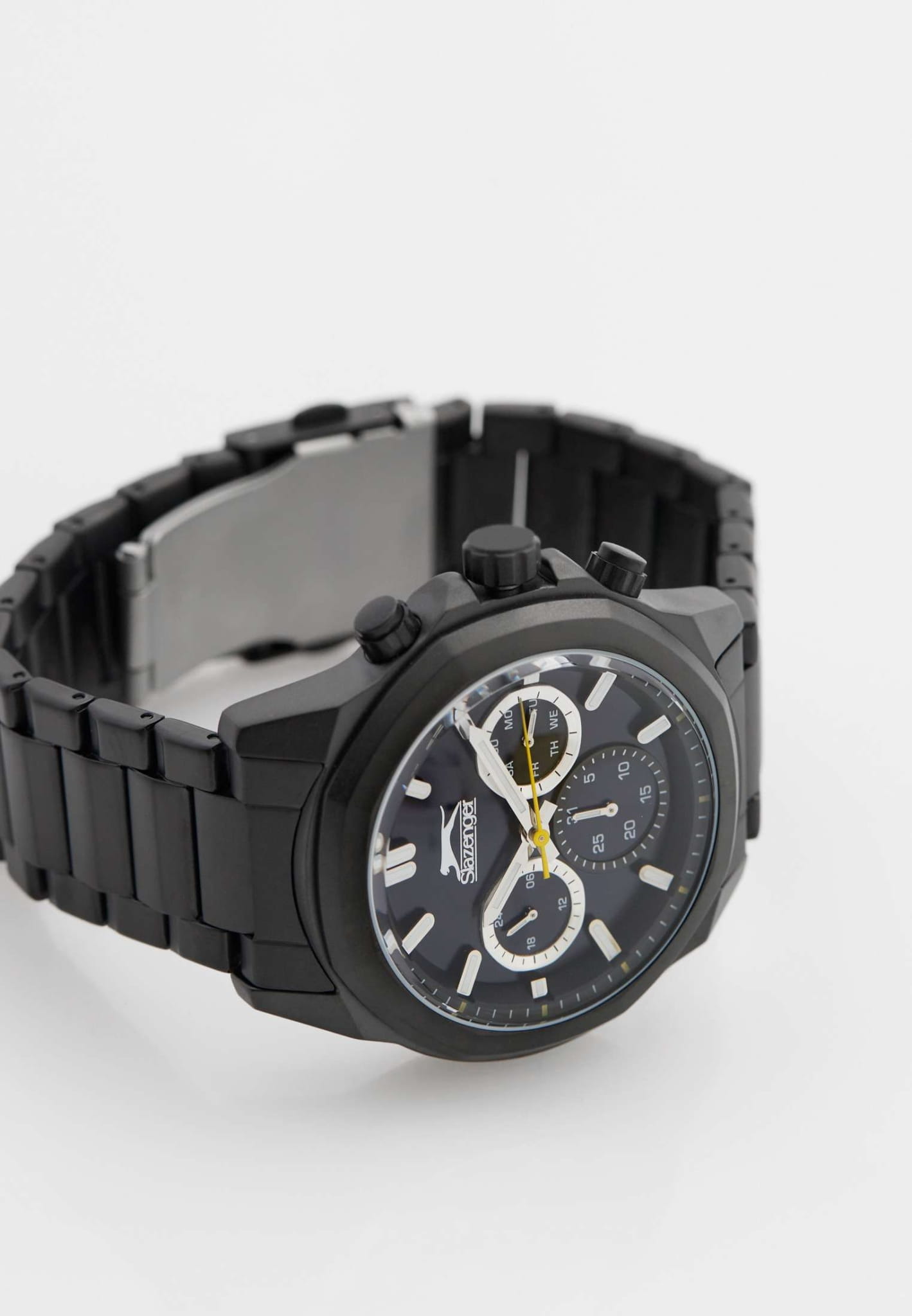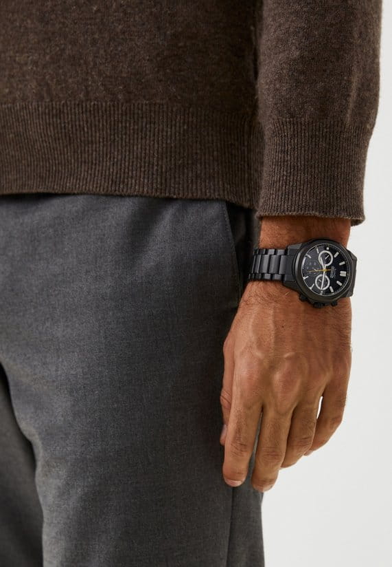 Часы Slazenger SL.09.2289.2.05 — это сочетание современного дизайна и функциональности, идеально подходящее для тех, кто ценит стиль и надежность. Корпус и браслет выполнены из прочного суперметалла с черным IP-покрытиемIP-покрытиеМетод ионного напыления. Демонстрирует повышенную устойчивость к истиранию, окислению и химическим веществам. Под воздействием высокого давления и температуры около 1500°C молекулы металла надёжно соединяются с частицами корпуса часов., что придаёт модели солидный и эффектный вид. Синий циферблат с лаконичными отметками и фирменным логотипом защищён устойчивым к царапинам минеральным стекломМинеральное стеклоМинеральное стекло представляет собой искусственно выращенный минерал кварца. Такое стекло отличается особой устойчивостью к повреждениям и царапинам. Уступает по некоторым качествам сапфировому стеклу.. Дополнительные функции включают отображение даты и дня недели, а также 12- и 24-часовой формат времени на отдельных мини-циферблатах, что делает использование часов максимально удобным. Заводная головка оснащена защитой, а надёжная раскладная застёжкаРаскладная застёжкаТакой тип застёжки используется только на браслетах из металла. Она никогда не раскрывается полностью, происходит разделение на 2 и более частей. Раскладывающая застёжка снизит вероятность потери часов к минимуму. обеспечивает комфортную посадку на запястье. Особое внимание привлекает восьмигранный безельБезельВнешний ободок, закрепляющий стекло. В спортивных часах так называется поворотное кольцо с делениями на циферблате, выполняет роль таймера – замеряет отрезки времени на шкале. Неподвижный безель – элемент декора. Однонаправленно вращающийся безель на дайверских часах позволяет фиксировать моменты погружения и выныривания на поверхность. с черным IP-покрытиемIP-покрытиеМетод ионного напыления. Демонстрирует повышенную устойчивость к истиранию, окислению и химическим веществам. Под воздействием высокого давления и температуры около 1500°C молекулы металла надёжно соединяются с частицами корпуса часов.. Циферблат оснащён люминесцентным покрытиемЛюминесцентное покрытиеПозволяет считывать показания времени в темноте. Производители наносят на стрелки, часовые индексы, безель или поверхность циферблата светонакопительный состав, дающий холодное свечение. стрелок и меток, что позволяет легко определять время даже в условиях плохой освещенности. Водозащита 50WR позволяет не беспокоиться о случайных брызгах и дождевых каплях. Диаметр корпуса составляет 46 мм, толщина — 14 мм, вес — 165 г, благодаря чему часы выглядят внушительно и подчёркивают индивидуальный стиль владельца. Эта модель станет отличным акцентом в вашем образе и подчеркнёт вашу уверенность в любой ситуации.