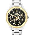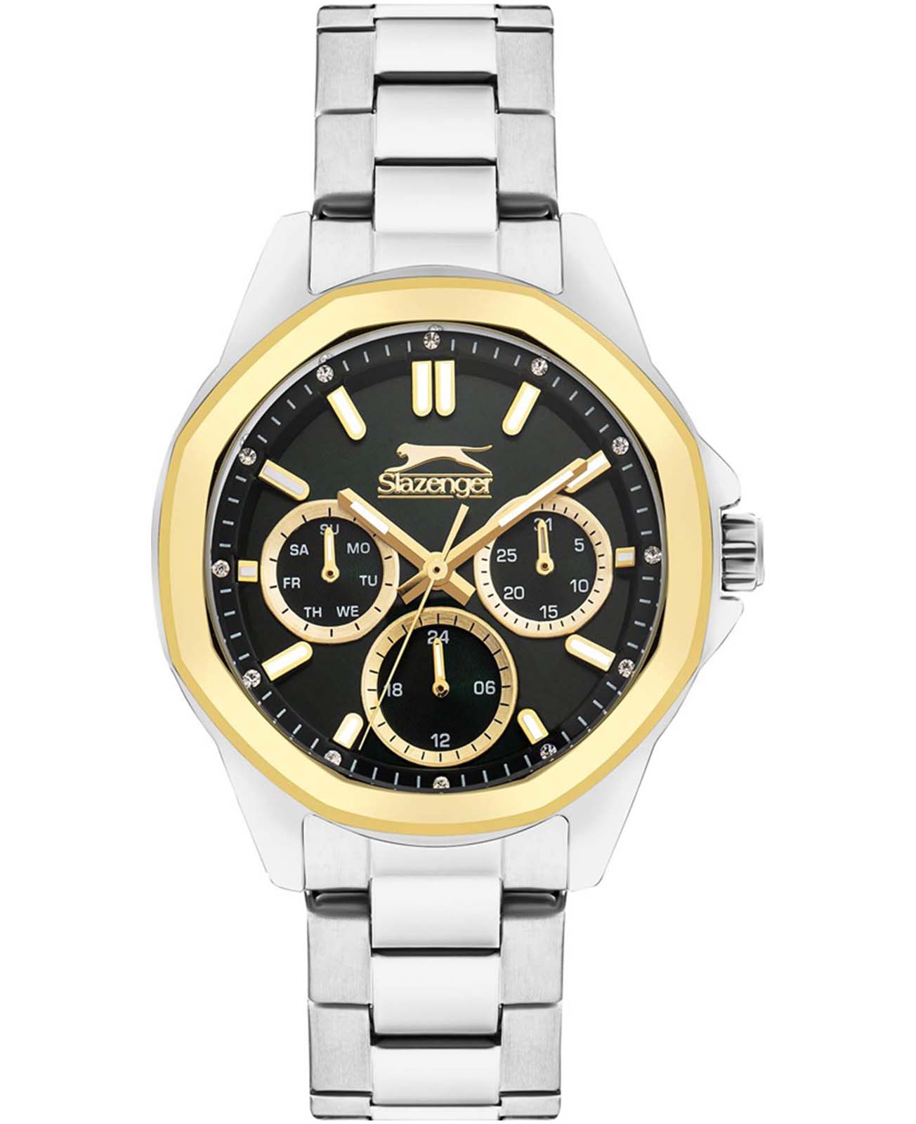 Часы Slazenger SL.09.2290.4.02 — это сочетание современного дизайна и функциональности, идеально подходящее для тех, кто ценит стиль и элегантность. Корпус и браслет выполнены из прочного суперметалла, что придаёт модели солидный и эффектный вид. Черный циферблат с лаконичными отметками, кристаллами и фирменным логотипом защищён устойчивым к царапинам минеральным стекломМинеральное стеклоМинеральное стекло представляет собой искусственно выращенный минерал кварца. Такое стекло отличается особой устойчивостью к повреждениям и царапинам. Уступает по некоторым качествам сапфировому стеклу.. Особое внимание привлекает восьмигранный безельБезельВнешний ободок, закрепляющий стекло. В спортивных часах так называется поворотное кольцо с делениями на циферблате, выполняет роль таймера – замеряет отрезки времени на шкале. Неподвижный безель – элемент декора. Однонаправленно вращающийся безель на дайверских часах позволяет фиксировать моменты погружения и выныривания на поверхность. с золотистым IP-покрытиемIP-покрытиеМетод ионного напыления. Демонстрирует повышенную устойчивость к истиранию, окислению и химическим веществам. Под воздействием высокого давления и температуры около 1500°C молекулы металла надёжно соединяются с частицами корпуса часов.. Дополнительные функции включают отображение даты и дня недели, а также 12- и 24-часовой формат времени на отдельных мини-циферблатах, что делает использование часов максимально удобным. Заводная головка оснащена защитой, а надёжная раскладная застёжкаРаскладная застёжкаТакой тип застёжки используется только на браслетах из металла. Она никогда не раскрывается полностью, происходит разделение на 2 и более частей. Раскладывающая застёжка снизит вероятность потери часов к минимуму. обеспечивает комфортную посадку на запястье. Особое внимание привлекает восьмигранный безельБезельВнешний ободок, закрепляющий стекло. В спортивных часах так называется поворотное кольцо с делениями на циферблате, выполняет роль таймера – замеряет отрезки времени на шкале. Неподвижный безель – элемент декора. Однонаправленно вращающийся безель на дайверских часах позволяет фиксировать моменты погружения и выныривания на поверхность.. Циферблат оснащён люминесцентным покрытиемЛюминесцентное покрытиеПозволяет считывать показания времени в темноте. Производители наносят на стрелки, часовые индексы, безель или поверхность циферблата светонакопительный состав, дающий холодное свечение. стрелок и меток, что позволяет легко определять время даже в условиях плохой освещенности. Водозащита 30WR позволяет не беспокоиться о случайных брызгах и дождевых каплях. Диаметр корпуса составляет 36 мм, толщина — 12 мм, вес — 97 г, благодаря чему часы выглядят внушительно и подчёркивают индивидуальный стиль владельца. Эта модель станет отличным акцентом в вашем образе и подчеркнёт вашу уверенность в любой ситуации.