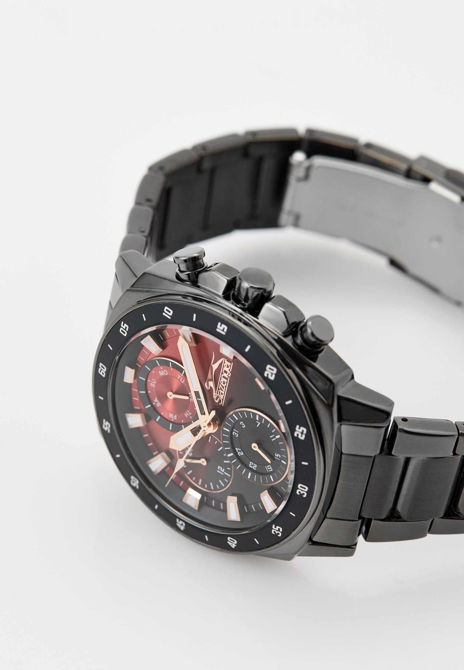 Slazenger SL.09.2292.2.07 — это стильные наручные часы, выполненные в современном дизайне и отлично подходящие для повседневного использования. Корпус диаметром 45 мм изготовлен из прочного металла с черным IP-покрытиемIP-покрытиеМетод ионного напыления. Демонстрирует повышенную устойчивость к истиранию, окислению и химическим веществам. Под воздействием высокого давления и температуры около 1500°C молекулы металла надёжно соединяются с частицами корпуса часов. и дополнен минеральным стекломМинеральное стеклоМинеральное стекло представляет собой искусственно выращенный минерал кварца. Такое стекло отличается особой устойчивостью к повреждениям и царапинам. Уступает по некоторым качествам сапфировому стеклу., которое защищает красно-черный циферблат. Черный металлический браслет с IP-покрытиемIP-покрытиеМетод ионного напыления. Демонстрирует повышенную устойчивость к истиранию, окислению и химическим веществам. Под воздействием высокого давления и температуры около 1500°C молекулы металла надёжно соединяются с частицами корпуса часов. шириной 24 мм оснащён надежной раскладной застёжкойРаскладная застёжкаТакой тип застёжки используется только на браслетах из металла. Она никогда не раскрывается полностью, происходит разделение на 2 и более частей. Раскладывающая застёжка снизит вероятность потери часов к минимуму., которая обеспечивает комфортную посадку на руке. Кварцевый механизм гарантирует точный ход, а водозащита уровня WR 50 позволяет не снимать часы во время мытья рук или под дождём. Модель оснащена люминесцентным покрытиемЛюминесцентное покрытиеПозволяет считывать показания времени в темноте. Производители наносят на стрелки, часовые индексы, безель или поверхность циферблата светонакопительный состав, дающий холодное свечение. стрелок и меток, что облегчает считывание времени в темноте. Дополнительные малые циферблаты отображают дату, день недели и текущее время в 24-часовом формате. Часы также оснащены заводной головкой с защитой и безелемБезельВнешний ободок, закрепляющий стекло. В спортивных часах так называется поворотное кольцо с делениями на циферблате, выполняет роль таймера – замеряет отрезки времени на шкале. Неподвижный безель – элемент декора. Однонаправленно вращающийся безель на дайверских часах позволяет фиксировать моменты погружения и выныривания на поверхность. с черным IP-покрытиемIP-покрытиеМетод ионного напыления. Демонстрирует повышенную устойчивость к истиранию, окислению и химическим веществам. Под воздействием высокого давления и температуры около 1500°C молекулы металла надёжно соединяются с частицами корпуса часов. и секундной разметкой. Вес изделия составляет 173 грамма.