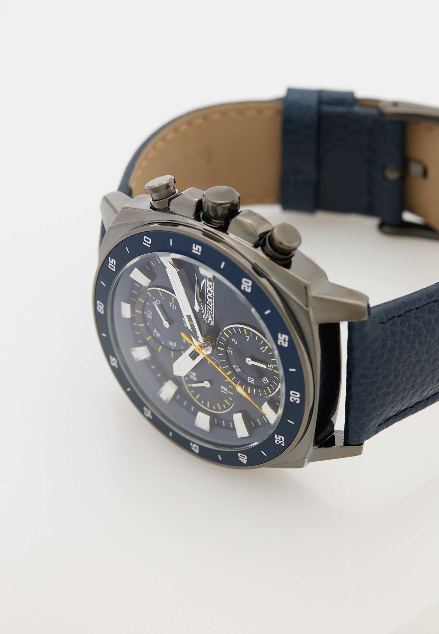 Slazenger SL.09.2293.2.03 — это стильные наручные часы, выполненные в современном дизайне и отлично подходящие для повседневного использования. Корпус диаметром 45 мм изготовлен из прочного металла с черным IP-покрытиемIP-покрытиеМетод ионного напыления. Демонстрирует повышенную устойчивость к истиранию, окислению и химическим веществам. Под воздействием высокого давления и температуры около 1500°C молекулы металла надёжно соединяются с частицами корпуса часов. и дополнен минеральным стекломМинеральное стеклоМинеральное стекло представляет собой искусственно выращенный минерал кварца. Такое стекло отличается особой устойчивостью к повреждениям и царапинам. Уступает по некоторым качествам сапфировому стеклу., которое защищает синий циферблат. Синий кожаный ремешок шириной 24 мм оснащён надежной классической застежкой, которая обеспечивает комфортную посадку на руке. Кварцевый механизм гарантирует точный ход, а водозащита уровня WR 50 позволяет не снимать часы во время мытья рук или под дождём. Модель оснащена люминесцентным покрытиемЛюминесцентное покрытиеПозволяет считывать показания времени в темноте. Производители наносят на стрелки, часовые индексы, безель или поверхность циферблата светонакопительный состав, дающий холодное свечение. стрелок и меток, что облегчает считывание времени в темноте. Дополнительные малые циферблаты отображают дату, день недели и текущее время в 24-часовом формате. Часы также оснащены заводной головкой с защитой и безелемБезельВнешний ободок, закрепляющий стекло. В спортивных часах так называется поворотное кольцо с делениями на циферблате, выполняет роль таймера – замеряет отрезки времени на шкале. Неподвижный безель – элемент декора. Однонаправленно вращающийся безель на дайверских часах позволяет фиксировать моменты погружения и выныривания на поверхность. с синим IP-покрытиемIP-покрытиеМетод ионного напыления. Демонстрирует повышенную устойчивость к истиранию, окислению и химическим веществам. Под воздействием высокого давления и температуры около 1500°C молекулы металла надёжно соединяются с частицами корпуса часов. и секундной разметкой. Вес изделия составляет 80 грамм.