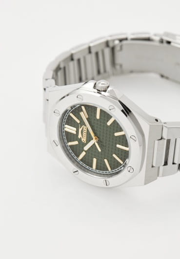 Мужские кварцевые часы Slazenger SL.09.2305.1.02 — это стильный и надёжный аксессуар, сочетающий современный дизайн и прочность. Корпус и браслет выполнены из суперметалла, защищён минеральным стекломМинеральное стеклоМинеральное стекло представляет собой искусственно выращенный минерал кварца. Такое стекло отличается особой устойчивостью к повреждениям и царапинам. Уступает по некоторым качествам сапфировому стеклу.. Циферблат зелёного цвета оформлен в классическом стиле, стрелки оснащены люминесцентным покрытиемЛюминесцентное покрытиеПозволяет считывать показания времени в темноте. Производители наносят на стрелки, часовые индексы, безель или поверхность циферблата светонакопительный состав, дающий холодное свечение., обеспечивающим хорошую читаемость в темноте. Заводная головка снабжена защитой, а задняя крышка — завинчивающаяся, что повышает надёжность конструкции. Браслет из суперметалла фиксируется на раскладной застёжкеРаскладная застёжкаТакой тип застёжки используется только на браслетах из металла. Она никогда не раскрывается полностью, происходит разделение на 2 и более частей. Раскладывающая застёжка снизит вероятность потери часов к минимуму., обеспечивая удобство и безопасность ношения. Водонепроницаемость 50 м позволяет использовать часы в повседневных условиях, защищая от случайных брызг и капель дождя. Модель подчёркивает индивидуальность владельца и идеально подходит как для повседневного, так и для делового образа.