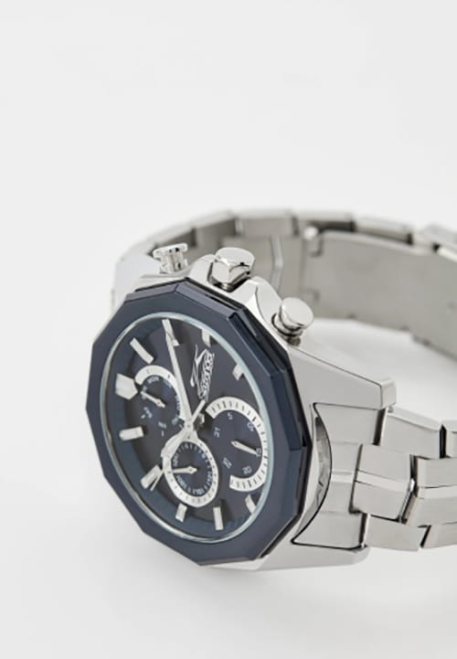 Мужские кварцевые часы Slazenger SL.09.2312.2.04 — это выразительный и функциональный аксессуар, сочетающий прочность, стиль и насыщенную комплектацию. Корпус выполнен из суперметалла с частичным IP-покрытиемIP-покрытиеМетод ионного напыления. Демонстрирует повышенную устойчивость к истиранию, окислению и химическим веществам. Под воздействием высокого давления и температуры около 1500°C молекулы металла надёжно соединяются с частицами корпуса часов. синего цвета, защищён минеральным стекломМинеральное стеклоМинеральное стекло представляет собой искусственно выращенный минерал кварца. Такое стекло отличается особой устойчивостью к повреждениям и царапинам. Уступает по некоторым качествам сапфировому стеклу.. Циферблат синего цвета оформлен с вынесенными малыми циферблатами для индикации дня недели, даты и времени в 24-часовом формате. Стрелки и метки оснащены люминесцентным покрытиемЛюминесцентное покрытиеПозволяет считывать показания времени в темноте. Производители наносят на стрелки, часовые индексы, безель или поверхность циферблата светонакопительный состав, дающий холодное свечение., обеспечивающим хорошую читаемость в темноте. Безель и гранёная заводная головка с защитой придают модели выразительный внешний вид. Браслет из суперметалла фиксируется на раскладной застёжкеРаскладная застёжкаТакой тип застёжки используется только на браслетах из металла. Она никогда не раскрывается полностью, происходит разделение на 2 и более частей. Раскладывающая застёжка снизит вероятность потери часов к минимуму., обеспечивая удобство и надёжность ношения. Водонепроницаемость 50 м позволяет использовать часы в повседневных условиях, защищая от случайных брызг и капель дождя. Модель подчёркивает индивидуальность владельца и идеально подходит как для повседневного, так и для делового образа.