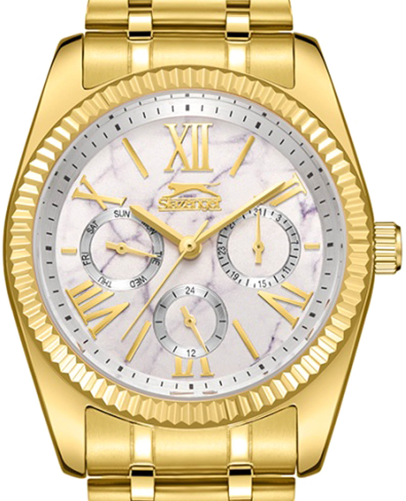 Женские кварцевые часы Slazenger SL.09.2343.4.02 – это сочетание элегантности, современного стиля и надёжности. Изящный корпус из суперметалла с IP-покрытиемIP-покрытиеМетод ионного напыления. Демонстрирует повышенную устойчивость к истиранию, окислению и химическим веществам. Под воздействием высокого давления и температуры около 1500°C молекулы металла надёжно соединяются с частицами корпуса часов. золотистого цвета, диаметром 36 мм и толщиной 10.5 мм, подчёркивает утончённость модели и делает их идеальным аксессуаром для любой ситуации – будь то деловая встреча, романтический вечер или повседневные выходы. Циферблат надёжно защищён минеральным стекломМинеральное стеклоМинеральное стекло представляет собой искусственно выращенный минерал кварца. Такое стекло отличается особой устойчивостью к повреждениям и царапинам. Уступает по некоторым качествам сапфировому стеклу., которое устойчиво к механическим повреждениям и сохраняет кристальную прозрачность. Рифленый неподвижный безельБезельВнешний ободок, закрепляющий стекло. В спортивных часах так называется поворотное кольцо с делениями на циферблате, выполняет роль таймера – замеряет отрезки времени на шкале. Неподвижный безель – элемент декора. Однонаправленно вращающийся безель на дайверских часах позволяет фиксировать моменты погружения и выныривания на поверхность.. Браслет из суперметалла с IP-покрытиемIP-покрытиеМетод ионного напыления. Демонстрирует повышенную устойчивость к истиранию, окислению и химическим веществам. Под воздействием высокого давления и температуры около 1500°C молекулы металла надёжно соединяются с частицами корпуса часов. удобно облегает запястье и фиксируется с помощью раскладной застёжкиРаскладная застёжкаТакой тип застёжки используется только на браслетах из металла. Она никогда не раскрывается полностью, происходит разделение на 2 и более частей. Раскладывающая застёжка снизит вероятность потери часов к минимуму., обеспечивая надёжность и комфорт в повседневном ношении. Утончённый стиль, внимание к деталям и практичность делают эту модель идеальным выбором для современных женщин, ценящих эстетику и функциональность. Вынесенный циферблат с 24-х часовым указателем времени. Водозащита до 30 метров позволит защитить корпус от случайных брызг или капель дождя.