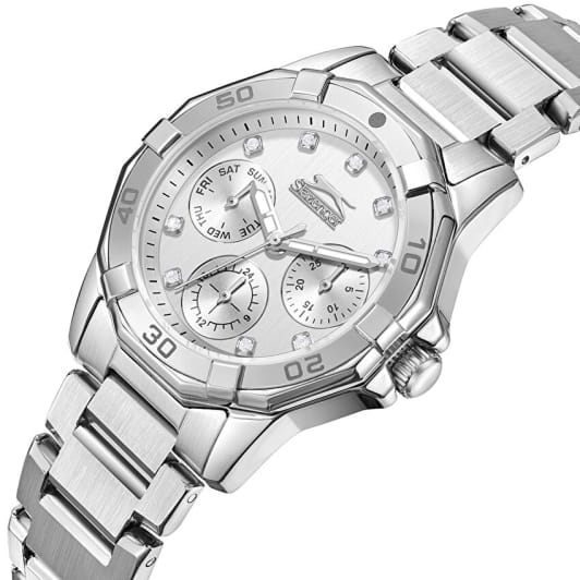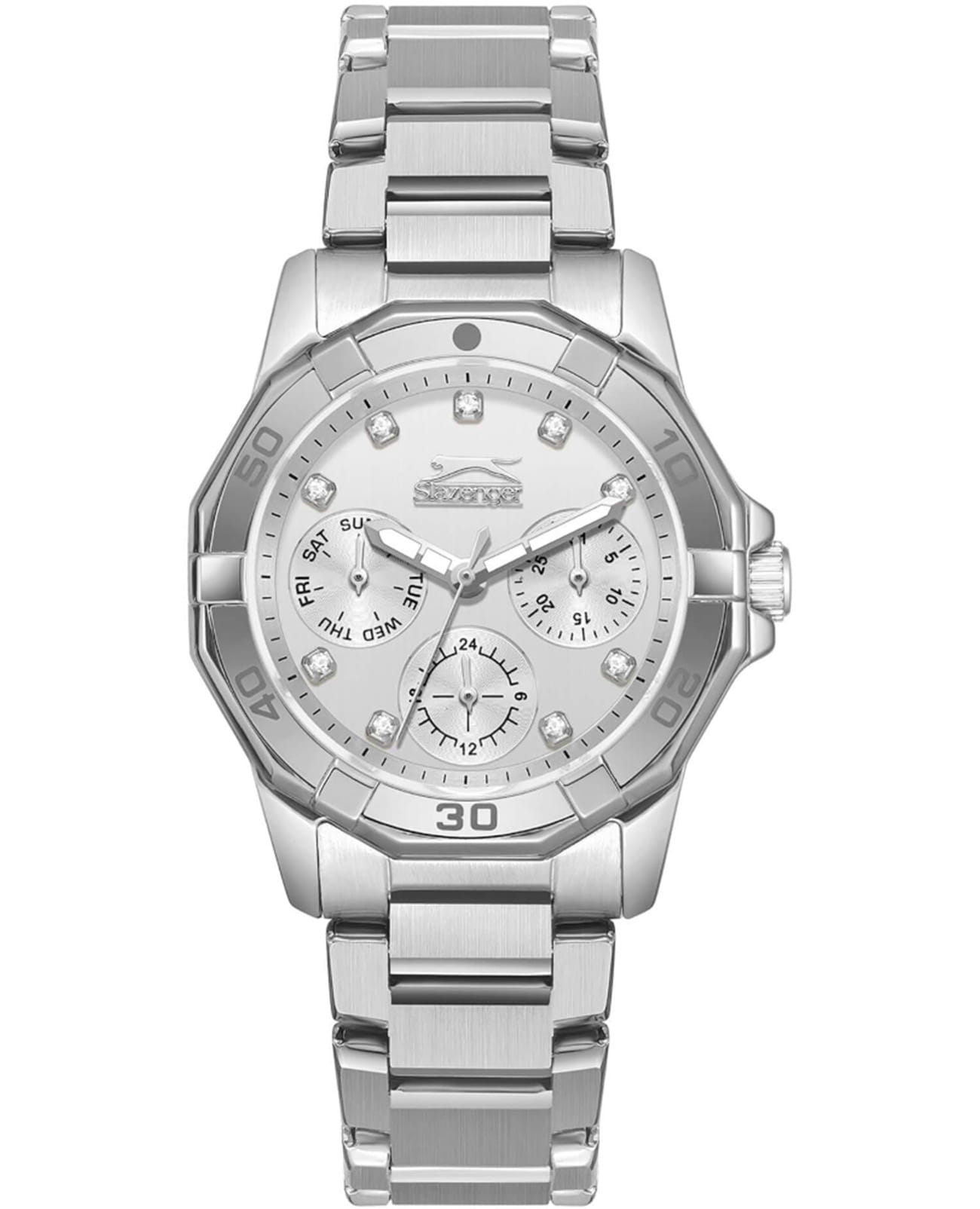 Женские кварцевые часы Slazenger — это элегантный и функциональный аксессуар. Корпус диаметром 33,5 мм и толщиной 10,5 мм выполнен из суперметалла. Циферблат серебристого цвета оформлен индексами и стрелками, украшен фианитами. Циферблат защищён минеральным стекломМинеральное стеклоМинеральное стекло представляет собой искусственно выращенный минерал кварца. Такое стекло отличается особой устойчивостью к повреждениям и царапинам. Уступает по некоторым качествам сапфировому стеклу.. Механизм — кварцевый. Часы оснащены индикацией дня недели, даты и 12/24-часового формата времени. Часы оснащены браслетом из суперметалла с раскладной застёжкойРаскладная застёжкаТакой тип застёжки используется только на браслетах из металла. Она никогда не раскрывается полностью, происходит разделение на 2 и более частей. Раскладывающая застёжка снизит вероятность потери часов к минимуму.. Водонепроницаемость 50 м позволяет использовать часы в повседневных условиях. Гарантия — 12 месяцев. Идеальный выбор для тех, кто ценит стиль, функциональность и качество.