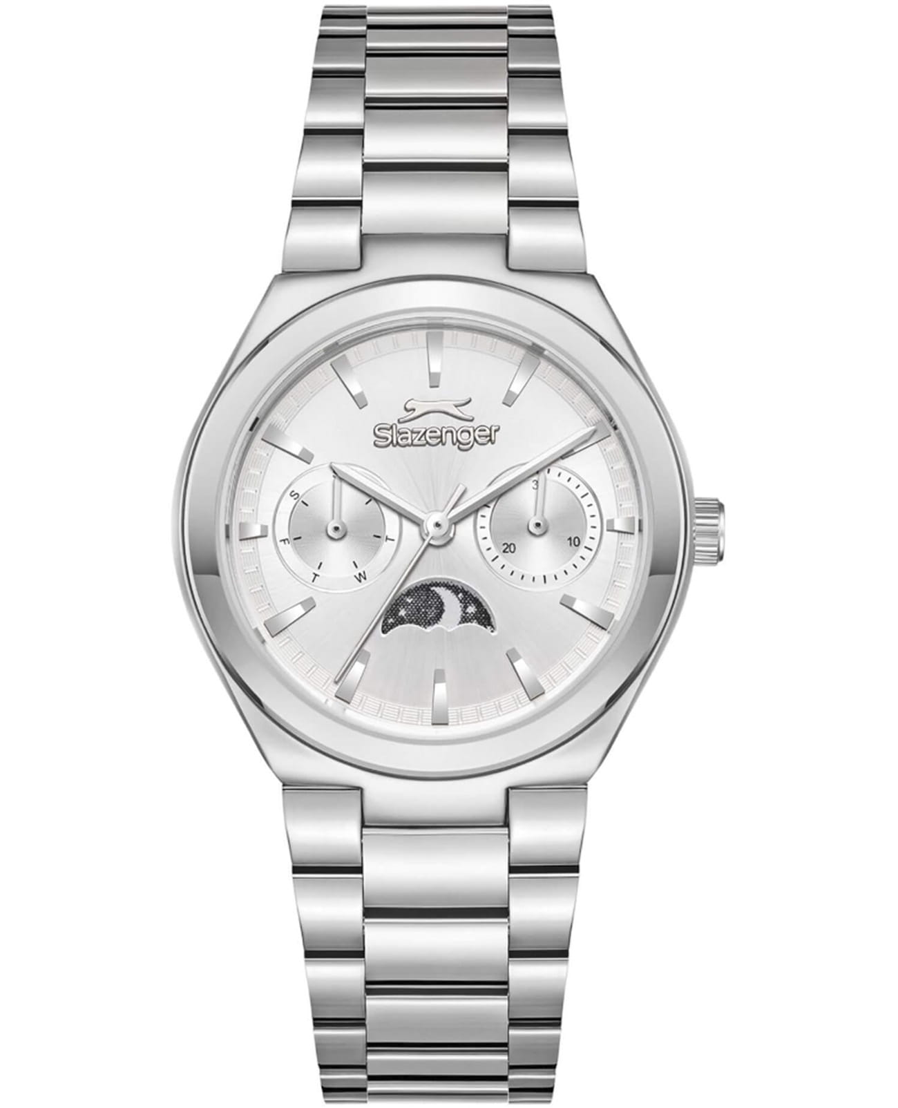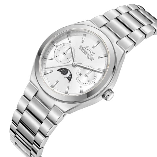 Женские кварцевые часы Slazenger — это выразительный и функциональный аксессуар. Корпус диаметром 34 мм и толщиной 9,5 мм выполнен из суперметалла. Циферблат серебристого цвета оформлен индексами и стрелками. Циферблат защищён минеральным стекломМинеральное стеклоМинеральное стекло представляет собой искусственно выращенный минерал кварца. Такое стекло отличается особой устойчивостью к повреждениям и царапинам. Уступает по некоторым качествам сапфировому стеклу.. Механизм — кварцевый калибр VX3HE11. Часы оснащены индикацией дня недели, даты и индикатором день/ночь, отображающим солнце или луну в зависимости от времени суток. Часы оснащены браслетом из суперметалла с раскладной застёжкойРаскладная застёжкаТакой тип застёжки используется только на браслетах из металла. Она никогда не раскрывается полностью, происходит разделение на 2 и более частей. Раскладывающая застёжка снизит вероятность потери часов к минимуму.. Водонепроницаемость 50 м позволяет использовать часы в повседневных условиях. Гарантия — 12 месяцев. Идеальный выбор для тех, кто ценит стиль, функциональность и качество.