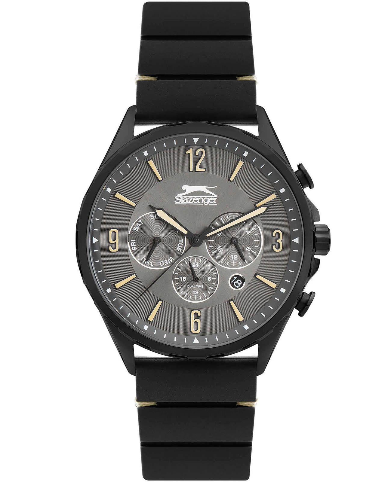 Мужские кварцевые часы Slazenger — это выразительный и функциональный аксессуар. Корпус диаметром 46 мм и толщиной 11 мм выполнен из суперметалла с IP-покрытиемIP-покрытиеМетод ионного напыления. Демонстрирует повышенную устойчивость к истиранию, окислению и химическим веществам. Под воздействием высокого давления и температуры около 1500°C молекулы металла надёжно соединяются с частицами корпуса часов.. Циферблат чёрного цвета оформлен индексами, стрелками и двумя вынесенными субциферблатами: для отображения дня недели и 24-часового формата времени. Окошко даты расположено между 4 и 5 часами. Присутствует указатель второго часового пояса (GMTВторой часовой поясФункция, позволяющая отображать время двух часовых поясов одновременно.). Циферблат защищён минеральным стекломМинеральное стеклоМинеральное стекло представляет собой искусственно выращенный минерал кварца. Такое стекло отличается особой устойчивостью к повреждениям и царапинам. Уступает по некоторым качествам сапфировому стеклу.. Часы оснащены силиконовым ремешком на классической пряжке. Водонепроницаемость 50 м позволяет использовать часы в повседневных условиях. Идеальный выбор для тех, кто ценит стиль и качество.