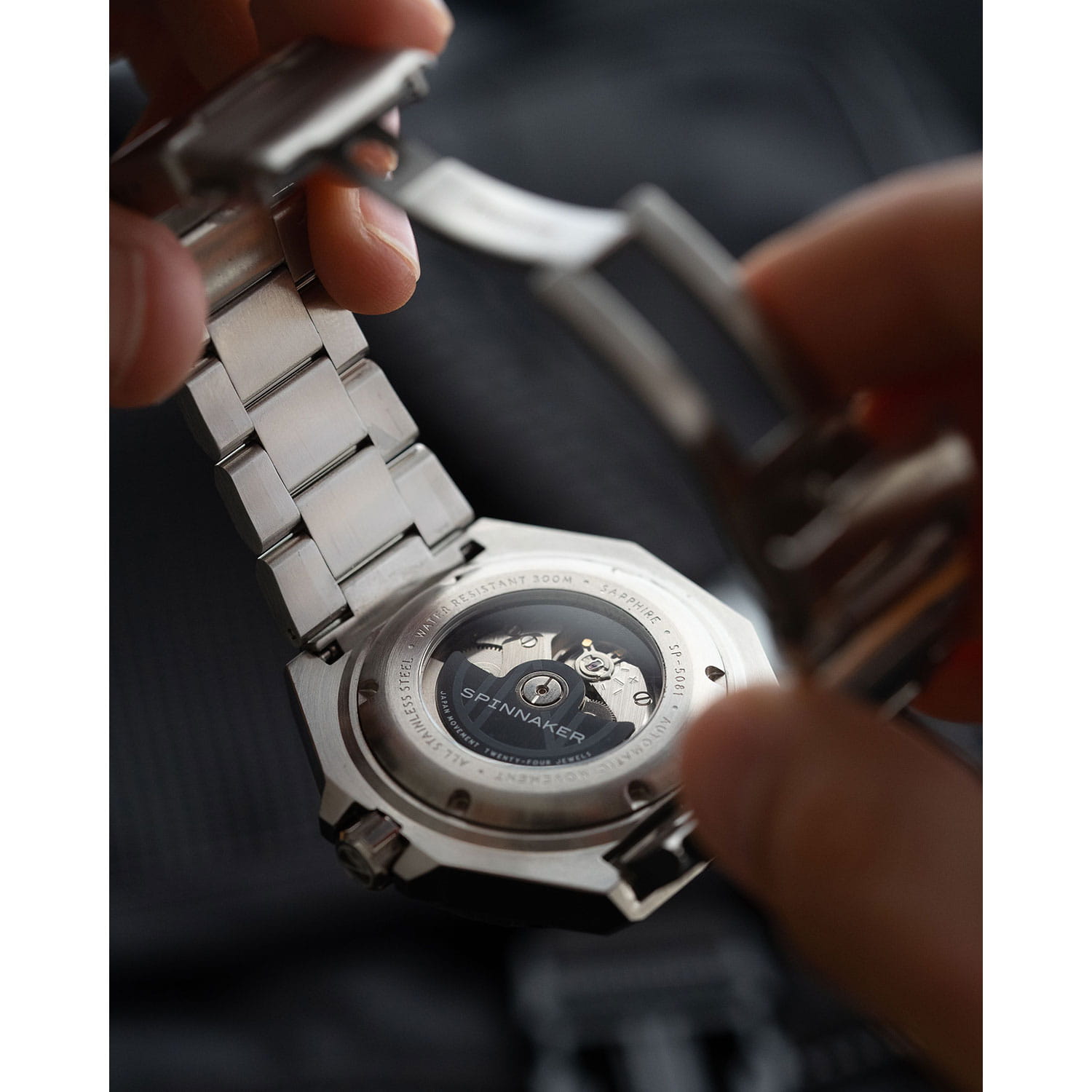 Мужские итальянские часы Spinnaker Dumas SP-5081-JJ, механический механизм (автоматический калибр) с высокой точностью. Циферблат с люминесцентным покрытиемЛюминесцентное покрытиеПозволяет считывать показания времени в темноте. Производители наносят на стрелки, часовые индексы, безель или поверхность циферблата светонакопительный состав, дающий холодное свечение. стрелок и меток, дополнен сапфировым стекломСапфировое стеклоПрочный и надёжный материал из кристалла сапфира синтетического происхождения, характеризующийся особой твёрдостью и устойчивостью к царапинам и повреждениям., устойчивым к появлению царапин и обладающее высокой прозрачностью. Класс водозащиты: 300 метров, позволит плавать, нырять и заниматься другими водными видами спорта. Корпус часов изготовлен из стали.