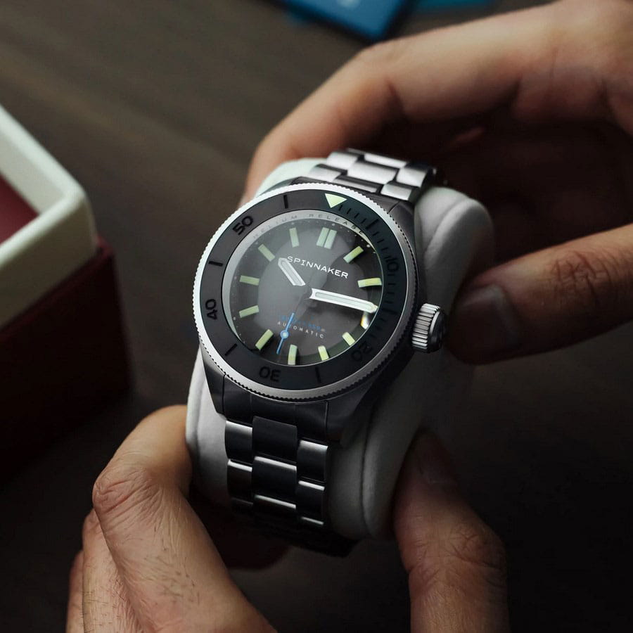 Мужские итальянские часы Spinnaker Spence SP-5098-33, механический механизм (автоматический калибр) с высокой точностью. Циферблат с люминесцентным покрытиемЛюминесцентное покрытиеПозволяет считывать показания времени в темноте. Производители наносят на стрелки, часовые индексы, безель или поверхность циферблата светонакопительный состав, дающий холодное свечение. стрелок и меток, дополнен сапфировым стекломСапфировое стеклоПрочный и надёжный материал из кристалла сапфира синтетического происхождения, характеризующийся особой твёрдостью и устойчивостью к царапинам и повреждениям., устойчивым к появлению царапин и обладающее высокой прозрачностью. Вращающийся безельБезельВнешний ободок, закрепляющий стекло. В спортивных часах так называется поворотное кольцо с делениями на циферблате, выполняет роль таймера – замеряет отрезки времени на шкале. Неподвижный безель – элемент декора. Однонаправленно вращающийся безель на дайверских часах позволяет фиксировать моменты погружения и выныривания на поверхность. с PVD-покрытиемPVDУльтратонкое покрытие наносится в технике вакуумного напыления, сочетает в себе нитрид титана особой прочности со слоем золота или оксида хрома. Несёт в себе декоративную или защитную функцию.. Класс водозащиты: 300 метров, позволит плавать, нырять и заниматься другими водными видами спорта. Корпус часов изготовлен из стали. Браслет с раскладной застёжкойРаскладная застёжкаТакой тип застёжки используется только на браслетах из металла. Она никогда не раскрывается полностью, происходит разделение на 2 и более частей. Раскладывающая застёжка снизит вероятность потери часов к минимуму..