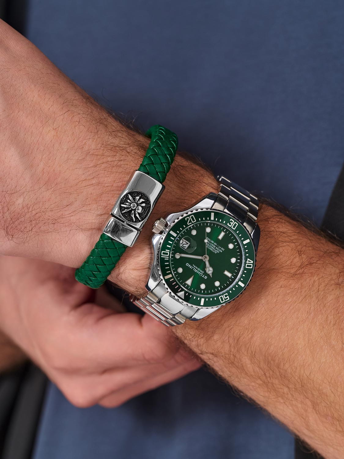 Stuhrling 4048.2 — стильные мужские часы в духе морского дайверского дизайна. Глубокий циферблат с радиальным переливом и крупные метки/стрелки с люминесцентным покрытиемЛюминесцентное покрытиеПозволяет считывать показания времени в темноте. Производители наносят на стрелки, часовые индексы, безель или поверхность циферблата светонакопительный состав, дающий холодное свечение. обеспечивают отличную читаемость, вращающийся безельБезельВнешний ободок, закрепляющий стекло. В спортивных часах так называется поворотное кольцо с делениями на циферблате, выполняет роль таймера – замеряет отрезки времени на шкале. Неподвижный безель – элемент декора. Однонаправленно вращающийся безель на дайверских часах позволяет фиксировать моменты погружения и выныривания на поверхность. с PVD-покрытиемPVDУльтратонкое покрытие наносится в технике вакуумного напыления, сочетает в себе нитрид титана особой прочности со слоем золота или оксида хрома. Несёт в себе декоративную или защитную функцию. подчёркивает спортивный характер. Браслет из нержавеющей стали, удобная раскладная застёжкаРаскладная застёжкаТакой тип застёжки используется только на браслетах из металла. Она никогда не раскрывается полностью, происходит разделение на 2 и более частей. Раскладывающая застёжка снизит вероятность потери часов к минимуму. фиксирует часы на запястье. Циферблат прикрыт стеклом KrysternaKrysternaKrysterna — инновационное стекло для наручных часов. Благодаря уникальной структуре, Krysterna объединяет ключевые преимущества двух материалов: твердость сапфира, защищающую от царапин, и гибкость минерального стекла, обеспечивающую устойчивость к деформациям. Такая комбинация делает его идеальным решением для часов, подверженных экстремальным нагрузкам, сохраняя при этом оптическую прозрачность. с высокой стойкостью к царапинам. Надёжный спутник для повседневной настроения и активного отдыха.