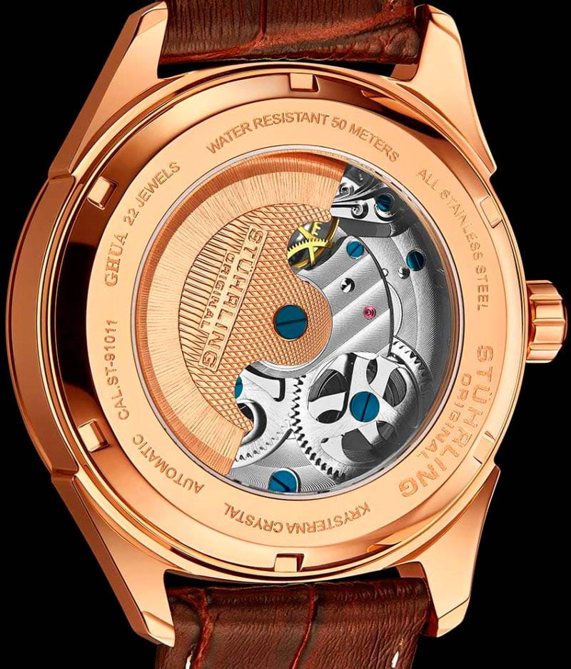 Stuhrling 943A.03 — эффектные мужские часы с открытым механическим сердцем, воплощающие искусство часового мастерства. Полностью скелетонизированный циферблат демонстрирует работу механизма, подчёркивая эстетику точности и движения. Корпус из нержавеющей стали с PVD-покрытиемPVDУльтратонкое покрытие наносится в технике вакуумного напыления, сочетает в себе нитрид титана особой прочности со слоем золота или оксида хрома. Несёт в себе декоративную или защитную функцию. гармонирует с ремнём из натуральной кожи, придавая модели классическую солидность. Металлизированные стрелки и метки обеспечивают читаемость, а прочное стекло KrysternaKrysternaKrysterna — инновационное стекло для наручных часов. Благодаря уникальной структуре, Krysterna объединяет ключевые преимущества двух материалов: твердость сапфира, защищающую от царапин, и гибкость минерального стекла, обеспечивающую устойчивость к деформациям. Такая комбинация делает его идеальным решением для часов, подверженных экстремальным нагрузкам, сохраняя при этом оптическую прозрачность. надёжно защищает конструкцию от повреждений. Stuhrling — это сочетание прозрачной механики, изысканного дизайна и утончённого стиля для ценителей настоящей инженерной красоты.