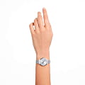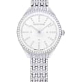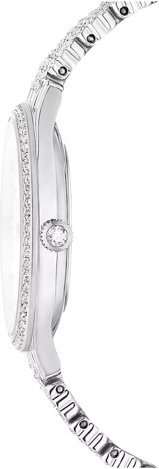 Часы Swarovski 5644062– это воплощение изысканного дизайна и функциональности, созданное для тех, кто ценит красоту и точность. Серебристый круглый корпус из нержавеющей стали оснащен безелемБезельВнешний ободок, закрепляющий стекло. В спортивных часах так называется поворотное кольцо с делениями на циферблате, выполняет роль таймера – замеряет отрезки времени на шкале. Неподвижный безель – элемент декора. Однонаправленно вращающийся безель на дайверских часах позволяет фиксировать моменты погружения и выныривания на поверхность., украшенным паве из тридцати мерцающих кристаллов. Под минеральным стекломМинеральное стеклоМинеральное стекло представляет собой искусственно выращенный минерал кварца. Такое стекло отличается особой устойчивостью к повреждениям и царапинам. Уступает по некоторым качествам сапфировому стеклу. открывается серебристый циферблат украшен гильошированным узором и кристаллами для индексных меток. Рифленая заводная головка украшена кристаллом круглой огранки. Стальной браслет с застежкой «бабочка»Застёжка "бабочка"Такой вид застёжки дополняется предохранителями, помогающими избежать случайного раскрытия браслета. Обладают изящным исполнением. , декорирован кристаллами Swarovski. Водозащита 50WR делает их устойчивыми к влаге, позволяя наслаждаться стильным аксессуаром в любых условиях.