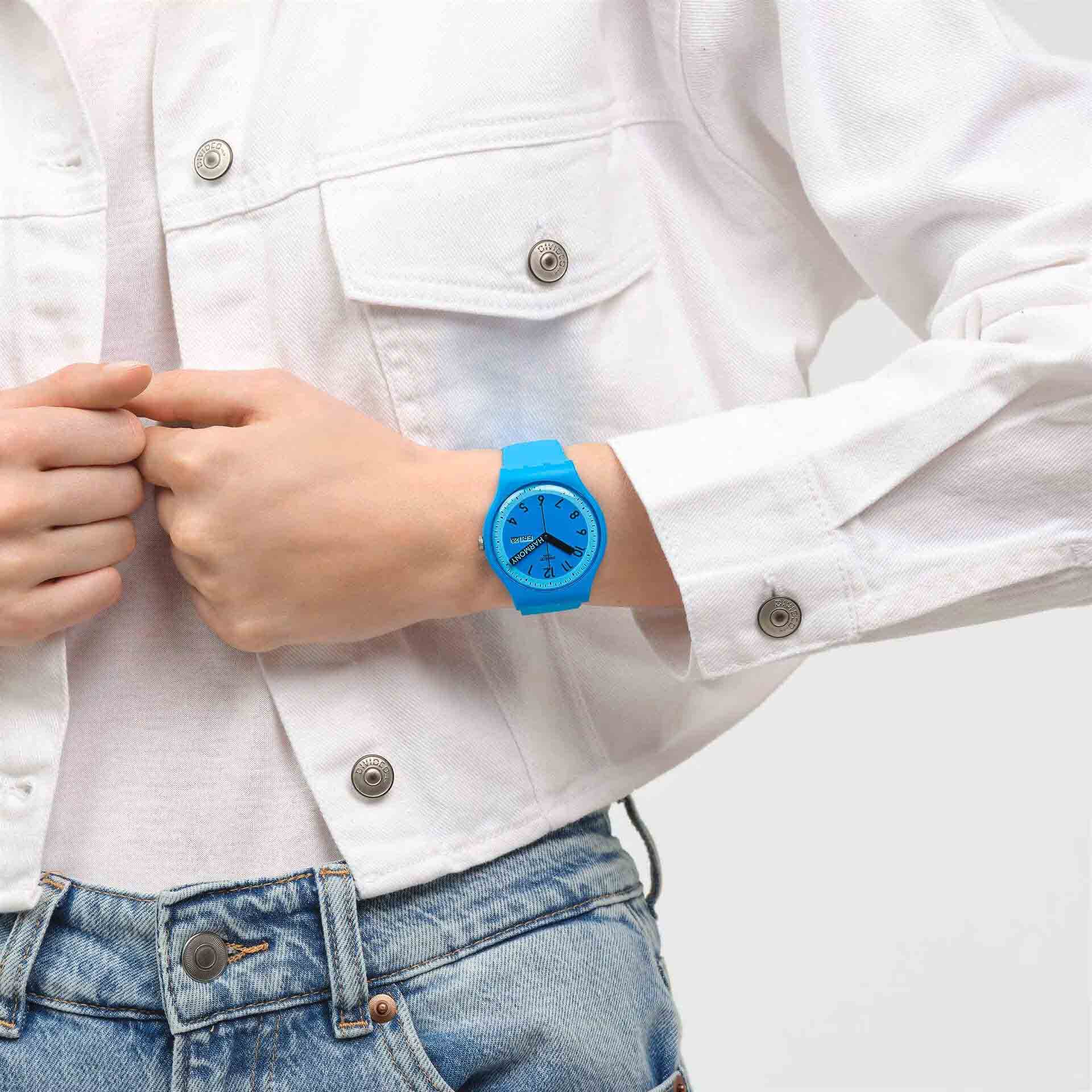 Часы Swatch SO29S702 —  стильный и надежный аксессуар. Эти часы Swatch Pride 2023 Special отличаются циферблатом с черным  принтом и голубым стеклом из биоматериалов, а также корпусом из тех же материалов. Часовая и минутная стрелки выполнены в черном цвете, при этом минутная стрелка символизирует значение голубого цвета в флаге Прайда: гармония. Ремешок этих ярко-голубых часов дополнен двумя специальными петлями, которые, соединяясь, образуют радугу. Ремешок силиконовый на классической застежке. Имеется окошко даты и дня недели в положении 3 часа. Внутри часов установлен надежный кварцевый механизм, который обеспечивает точность хода. Эти часы водонепроницаемы до 30 метров, что позволяет не беспокоиться о случайных брызгах или дождевых каплях. Swatch SO29S702 — это идеальный выбор для тех, кто ценит сочетание стиля, комфорта и функциональности в одном аксессуаре.