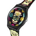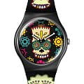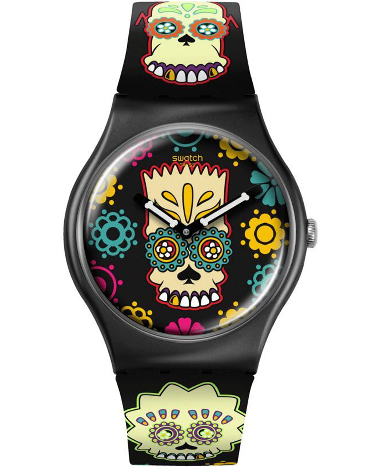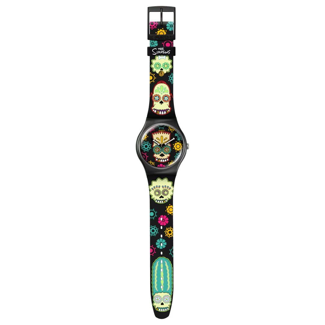 Часы Swatch SO29Z135 —  эффектный и надежный аксессуар. Эти праздничные часы входят в коллекцию "Симпсоны" и изображают всю семью Симпсонов в масках на Хэллоуин. Изображения выполнены в многоцветной печати на матовом черном циферблате и ремешке. Черный циферблат украшен принтом и светящимися в темноте деталями, а также черными стрелками часов и минут с люминесцентным покрытиемЛюминесцентное покрытиеПозволяет считывать показания времени в темноте. Производители наносят на стрелки, часовые индексы, безель или поверхность циферблата светонакопительный состав, дающий холодное свечение. и белым принтом в форме костей. Логотип "Симпсоны" выполнен белым цветом на черной петле, а матовая черная пряжка завершает дизайн этих часов. Ремешок из силикона на стандартной застёжке. Внутри часов установлен надежный кварцевый механизм, который обеспечивает точность хода. Эти часы водонепроницаемы до 30 метров, что позволяет не беспокоиться о случайных брызгах или дождевых каплях. Swatch SO29Z135 — это идеальный выбор для тех, кто ценит сочетание стиля, комфорта и функциональности в одном аксессуаре.