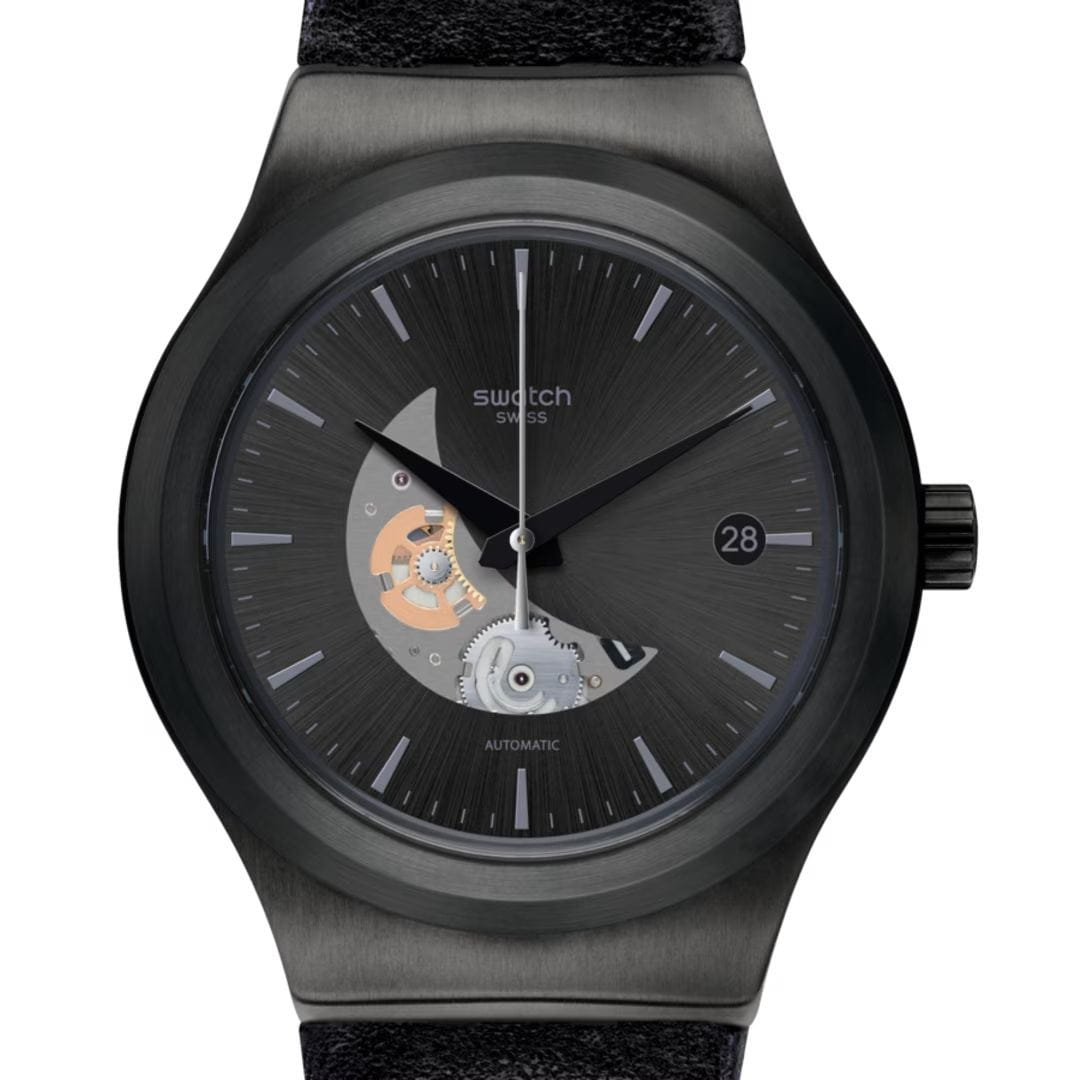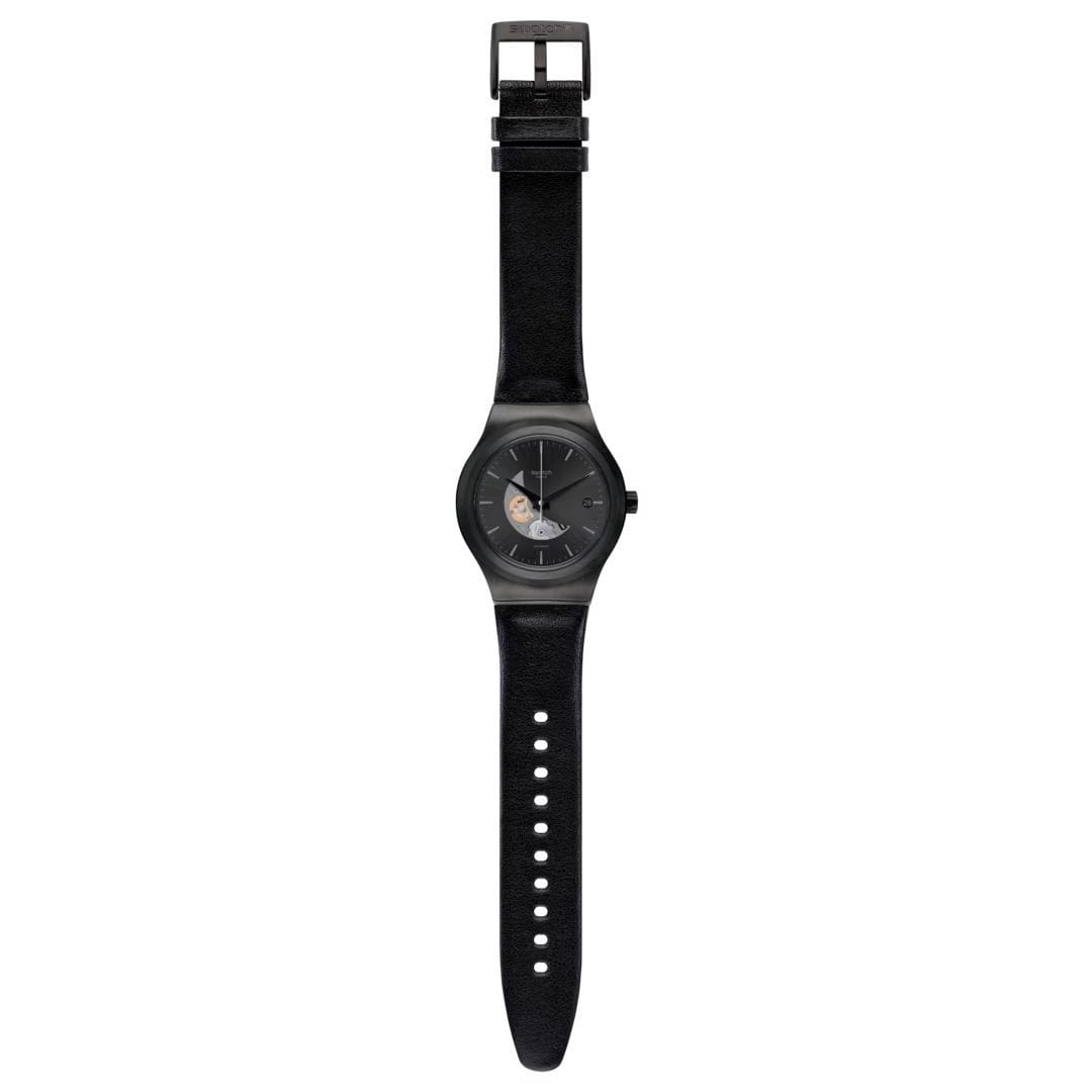 Часы Swatch Sistem51 SISTEM PILOTE YIB404— модель украшает окошко в виде полумесяца на циферблате с радиальной полировкой, сквозь которое можно разглядеть механизм. Они оснащены черным циферблатом с солнечной шлифовкой и кожанным ремешком. Корпус часов круглый, диаметром 42 мм, выполнен из нержавеющей стали. Стрелки с люминесцентным покрытиемЛюминесцентное покрытиеПозволяет считывать показания времени в темноте. Производители наносят на стрелки, часовые индексы, безель или поверхность циферблата светонакопительный состав, дающий холодное свечение.. Модель оснащена автоматическим механизмом Sistem51, который состоит всего из 51 детали и имеет запас хода 90 часов. Особенностью часов является прозрачная задняя крышка, позволяющая наблюдать за работой механизма. Часы водонепроницаемы до 3 бар. YIG400G принадлежит к коллекции Sistem51, которая революционизировала мир автоматических часов благодаря полностью автоматизированному процессу производства и исключительным антимагнитным свойствам.