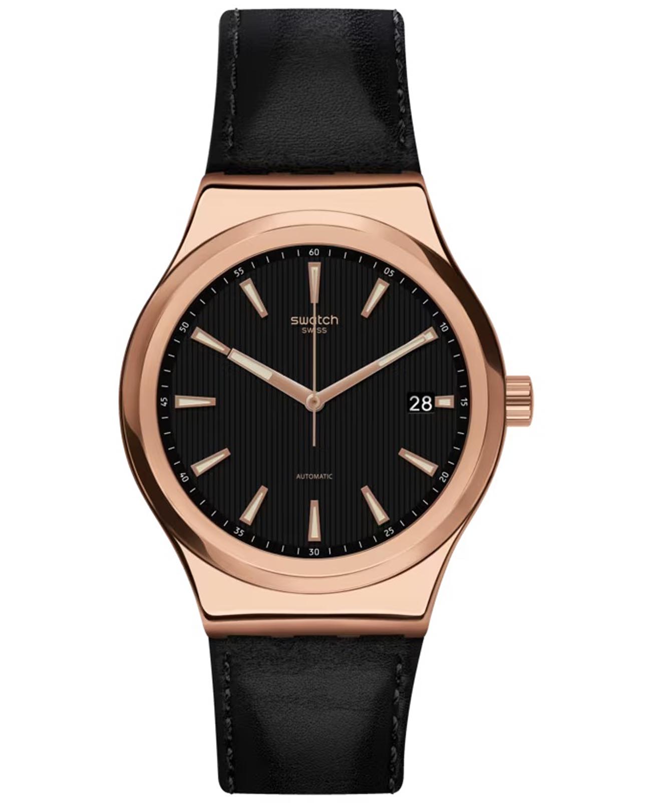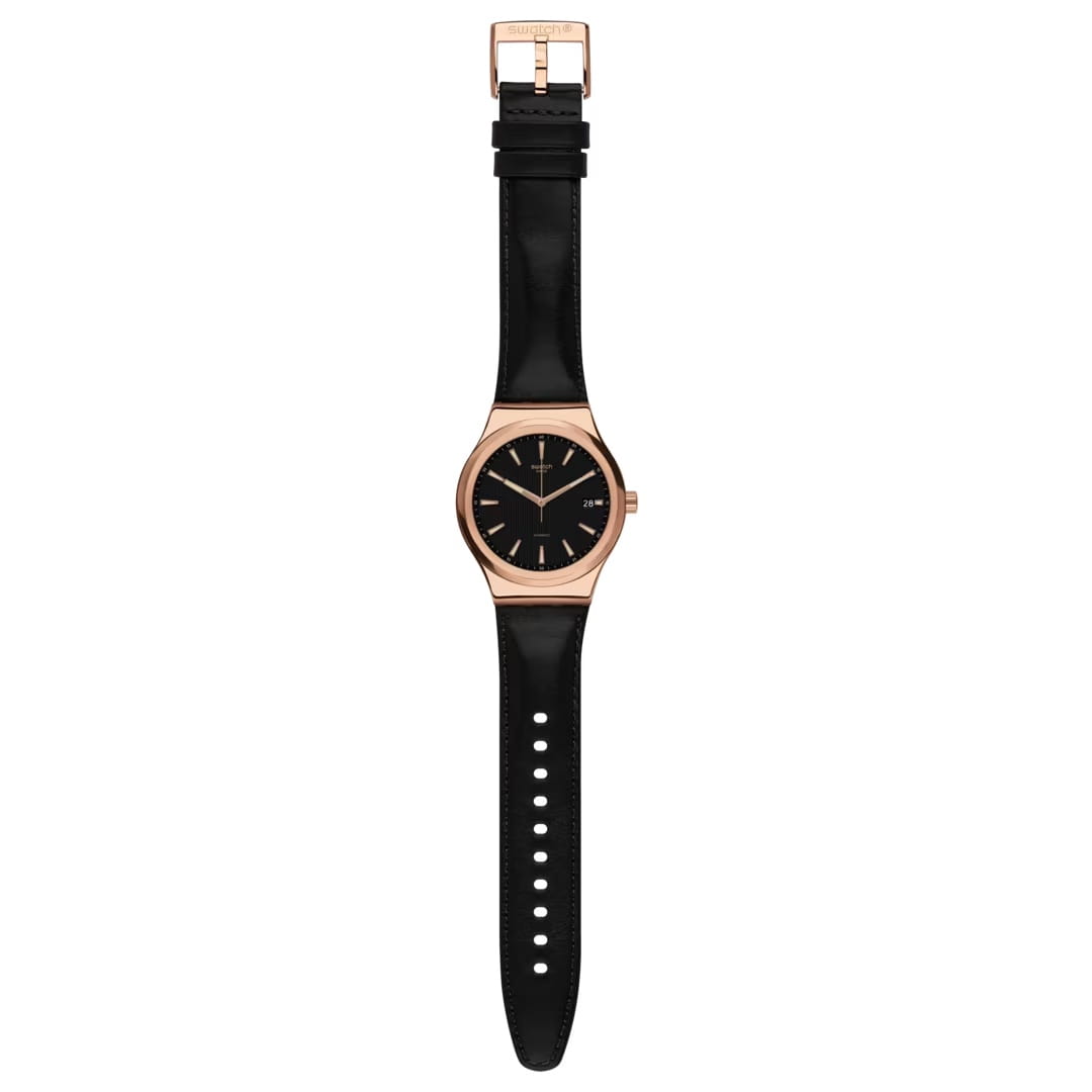 Часы Swatch SISTEM ROSEE YIG400 — это элегантная механическая модель с золотистым акцентом. Они оснащены черным циферблатом из нержавеющей стали с PVD-покрытиемPVDУльтратонкое покрытие наносится в технике вакуумного напыления, сочетает в себе нитрид титана особой прочности со слоем золота или оксида хрома. Несёт в себе декоративную или защитную функцию. цвета розового золота и кожаным ремешком на классической застежке. Стрелки с люминесцентным покрытиемЛюминесцентное покрытиеПозволяет считывать показания времени в темноте. Производители наносят на стрелки, часовые индексы, безель или поверхность циферблата светонакопительный состав, дающий холодное свечение.. Модель оснащена автоматическим механизмом Sistem51, который состоит всего из 51 детали и имеет запас хода 90 часов. Особенностью часов является прозрачная задняя крышка, позволяющая наблюдать за работой механизма. Часы водонепроницаемы до 3 бар. Часы Swatch YIG400 принадлежит к коллекции Sistem51, которая революционизировала мир автоматических часов благодаря полностью автоматизированному процессу производства и исключительным антимагнитным свойствам.