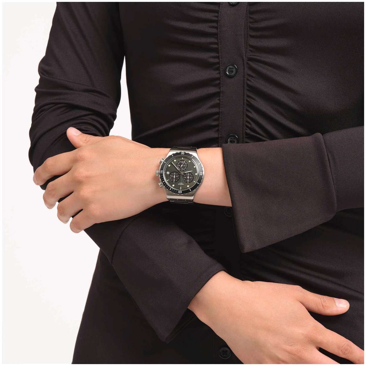 Часы Swatch YVS488G — это стильный и современный аксессуар для тех, кто ценит лёгкость и комфорт. Эта стильная модель часов из нержавеющей стали дополнена матовым металлическим браслетом из нержавеющей стали со съемными звеньями и застёжкой «бабочка»Застёжка "бабочка"Такой вид застёжки дополняется предохранителями, помогающими избежать случайного раскрытия браслета. Обладают изящным исполнением. . Зеленый матовый циферблат с хронографомХронографФункция позволяет измерять отрезки времени с особой точностью: часы, минуты, секунды. Верным признаком хронографа является наличие на циферблате 3 дополнительных окошек-счётчиков. и светящимися в темноте индексами и стрелками из-за люминесцентного покрытияЛюминесцентное покрытиеПозволяет считывать показания времени в темноте. Производители наносят на стрелки, часовые индексы, безель или поверхность циферблата светонакопительный состав, дающий холодное свечение. заключен в матовый корпус из нержавеющей стали. Завершают образ индикатор даты в положении «3 часа» на циферблате, а также серебристые цифры и индексы на безелеБезельВнешний ободок, закрепляющий стекло. В спортивных часах так называется поворотное кольцо с делениями на циферблате, выполняет роль таймера – замеряет отрезки времени на шкале. Неподвижный безель – элемент декора. Однонаправленно вращающийся безель на дайверских часах позволяет фиксировать моменты погружения и выныривания на поверхность. из нержавеющей стали с черным PVDPVDУльтратонкое покрытие наносится в технике вакуумного напыления, сочетает в себе нитрид титана особой прочности со слоем золота или оксида хрома. Несёт в себе декоративную или защитную функцию. покрытием. Водозащита 30 метров делает часы практичными для повседневного использования. Эти часы подойдут для повседневного ношения и станут ярким акцентом в вашем наряде.