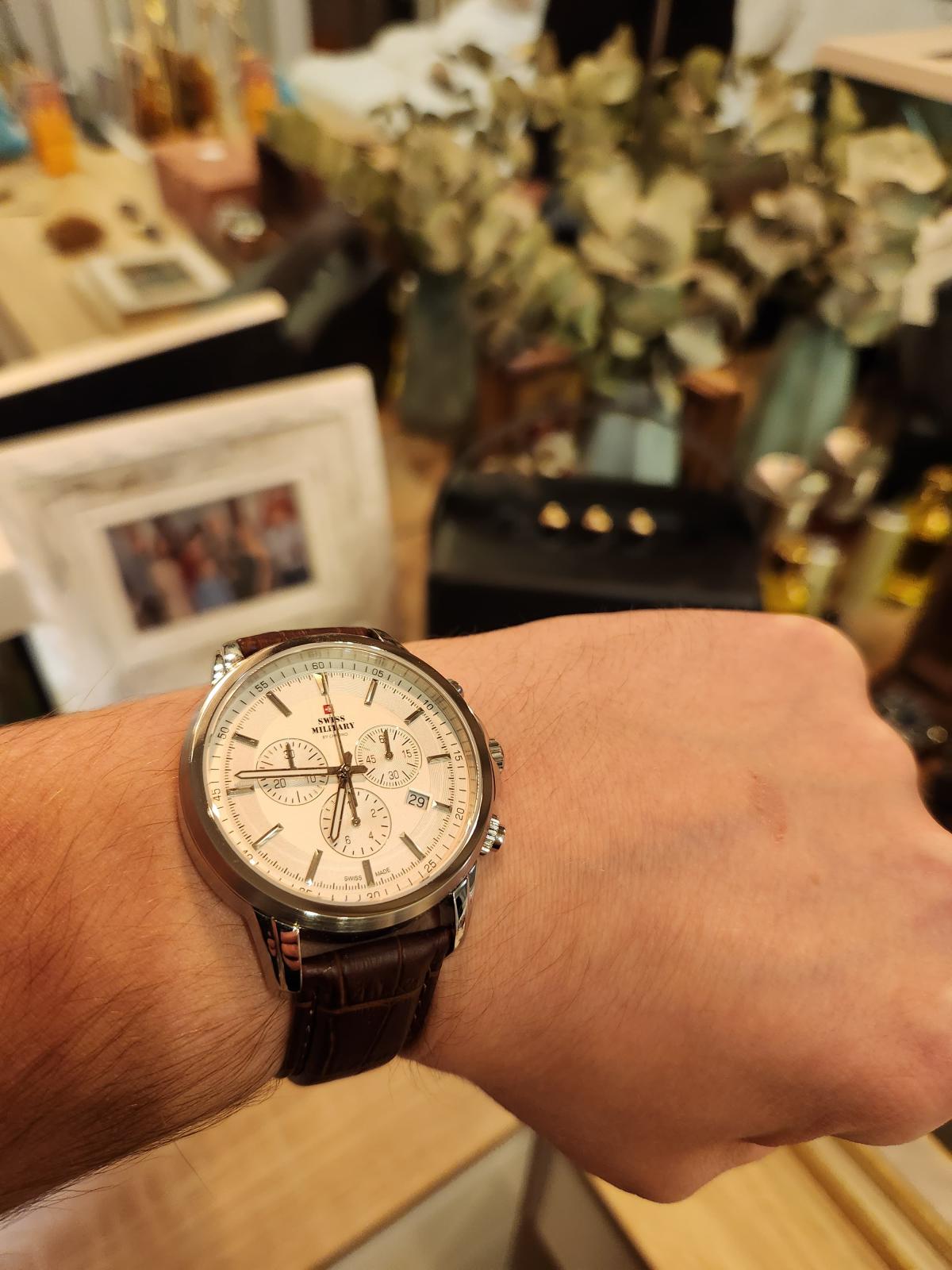 Часы Swiss Military SM34052.20 — элегантный мужской хронограф, сочетающий стиль и швейцарскую точность. Корпус из нержавеющей стали диаметром 42 мм защищён сапфировым стекломСапфировое стеклоПрочный и надёжный материал из кристалла сапфира синтетического происхождения, характеризующийся особой твёрдостью и устойчивостью к царапинам и повреждениям. с антибликовым покрытиемАнтибликовое покрытиеСлой оксида металла в 0,13-0,3 микрон, благодаря которому стекло часов не бликует и не отражает свет. Антибликовое покрытие уменьшает отражение света в 10 раз, обеспечивая отличную читаемость показателей циферблата., что обеспечивает долговечность и идеальную читаемость в любых условиях. Серебристый циферблат с классическими индексами и стрелками дополняет стильный облик модели.
