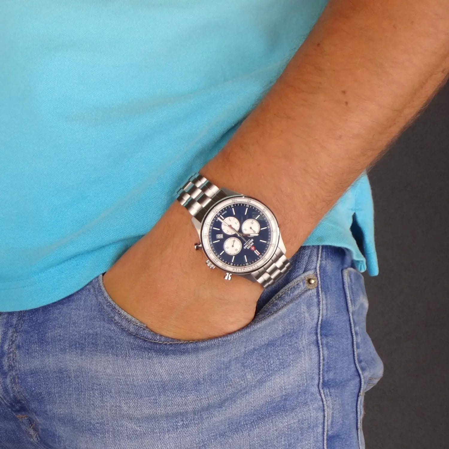 Мужские швейцарские наручные часы-хронографХронографФункция позволяет измерять отрезки времени с особой точностью: часы, минуты, секунды. Верным признаком хронографа является наличие на циферблате 3 дополнительных окошек-счётчиков. Swiss Military by Chrono SM34013.04, кварцевый механизм с высокой точностью. Класс водозащиты: 100 метров, позволит плавать, нырять и заниматься другими водными видами спорта. Стрелки с люминесцентным покрытиемЛюминесцентное покрытиеПозволяет считывать показания времени в темноте. Производители наносят на стрелки, часовые индексы, безель или поверхность циферблата светонакопительный состав, дающий холодное свечение.. Корпус и браслет часов изготовлены из нержавеющей стали. Минеральное стеклоМинеральное стеклоМинеральное стекло представляет собой искусственно выращенный минерал кварца. Такое стекло отличается особой устойчивостью к повреждениям и царапинам. Уступает по некоторым качествам сапфировому стеклу.. Браслет с раскладной застёжкойРаскладная застёжкаТакой тип застёжки используется только на браслетах из металла. Она никогда не раскрывается полностью, происходит разделение на 2 и более частей. Раскладывающая застёжка снизит вероятность потери часов к минимуму..