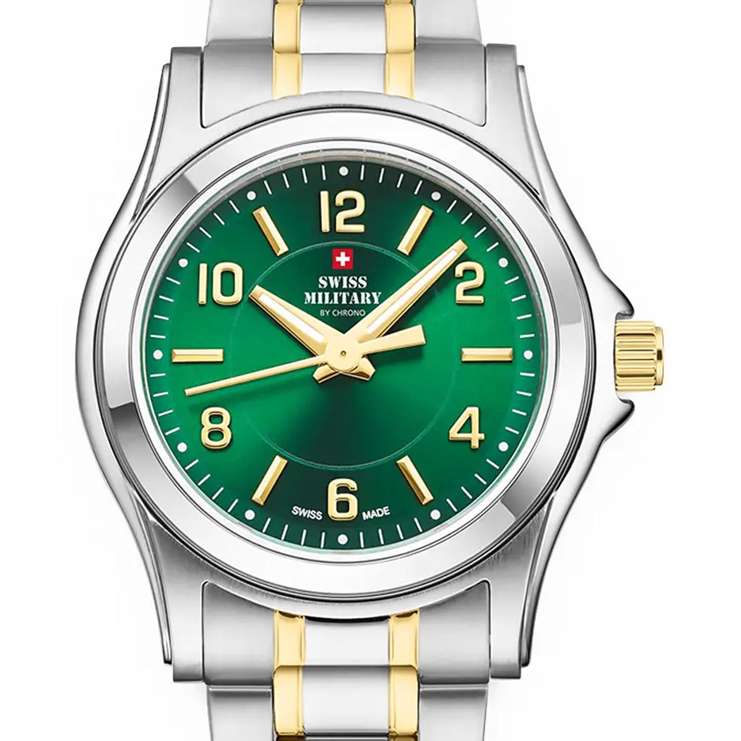Женские швейцарские наручные часы Swiss Military by Chrono SM34003.28, кварцевый механизм с высокой точностью. Класс водозащиты: 50 метров, позволит защитить корпус от случайных брызг или капель дождя. Стрелки и метки с люминесцентным покрытиемЛюминесцентное покрытиеПозволяет считывать показания времени в темноте. Производители наносят на стрелки, часовые индексы, безель или поверхность циферблата светонакопительный состав, дающий холодное свечение.. Корпус часов изготовлен из стали. Минеральное стеклоМинеральное стеклоМинеральное стекло представляет собой искусственно выращенный минерал кварца. Такое стекло отличается особой устойчивостью к повреждениям и царапинам. Уступает по некоторым качествам сапфировому стеклу.. Браслет с частичным PVD-покрытиемPVDУльтратонкое покрытие наносится в технике вакуумного напыления, сочетает в себе нитрид титана особой прочности со слоем золота или оксида хрома. Несёт в себе декоративную или защитную функцию. и с раскладной застёжкойРаскладная застёжкаТакой тип застёжки используется только на браслетах из металла. Она никогда не раскрывается полностью, происходит разделение на 2 и более частей. Раскладывающая застёжка снизит вероятность потери часов к минимуму..