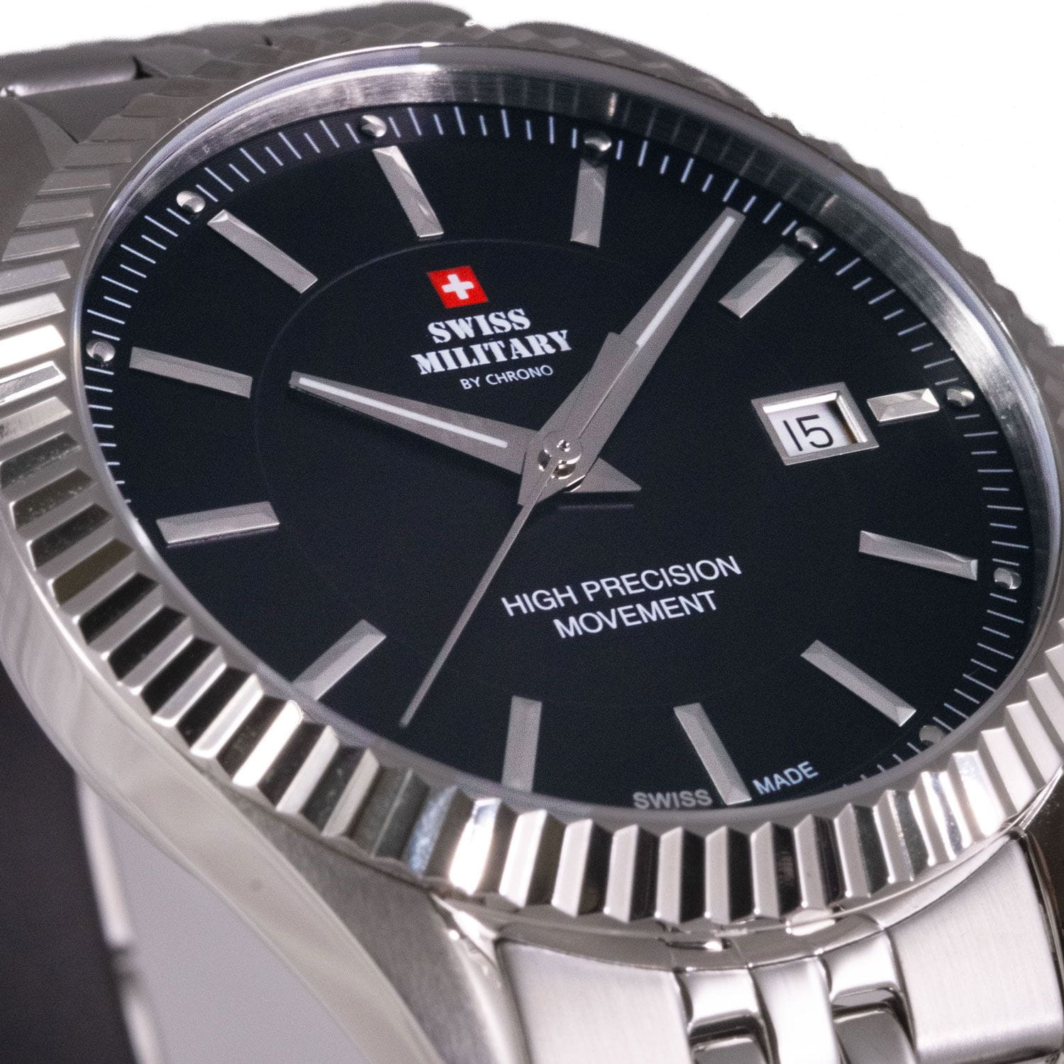 Часы Swiss Military SM34065.01 — это элегантное сочетание швейцарского качества и классического дизайна. Корпус диаметром 40 мм и браслет выполнены из нержавеющей стали, что обеспечивает прочность и стиль. Чёрный циферблат с классическими индексами и стрелками надёжно защищён минеральным стеклом с сапфировым покрытиемСапфировое стеклоПрочный и надёжный материал из кристалла сапфира синтетического происхождения, характеризующийся особой твёрдостью и устойчивостью к царапинам и повреждениям., устойчивым к царапинам.