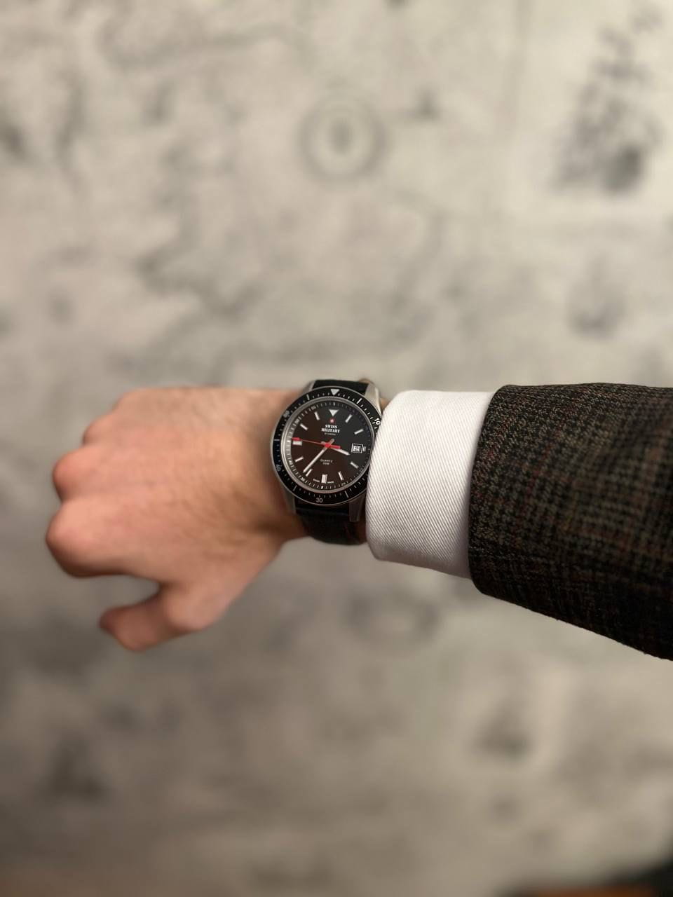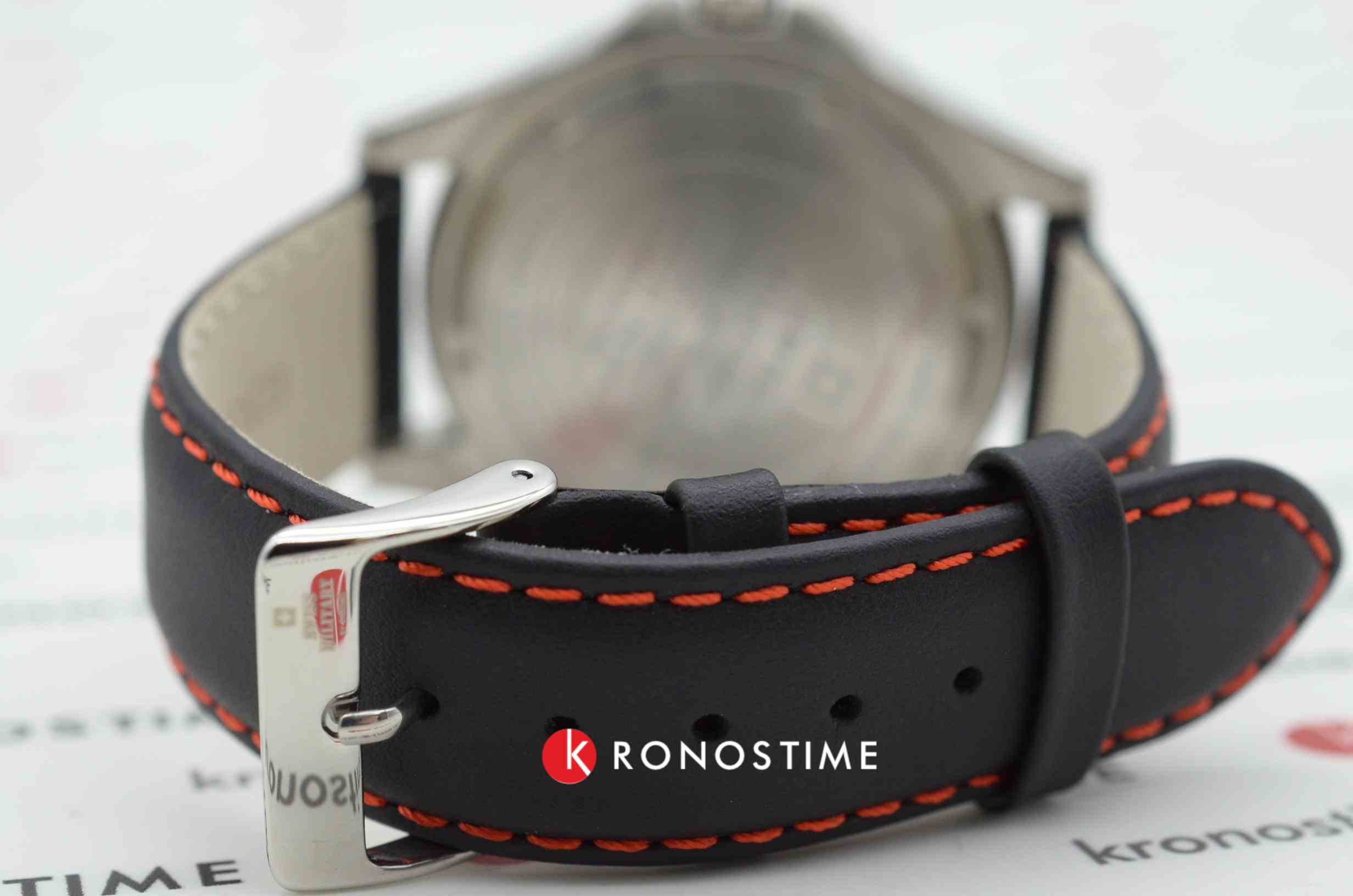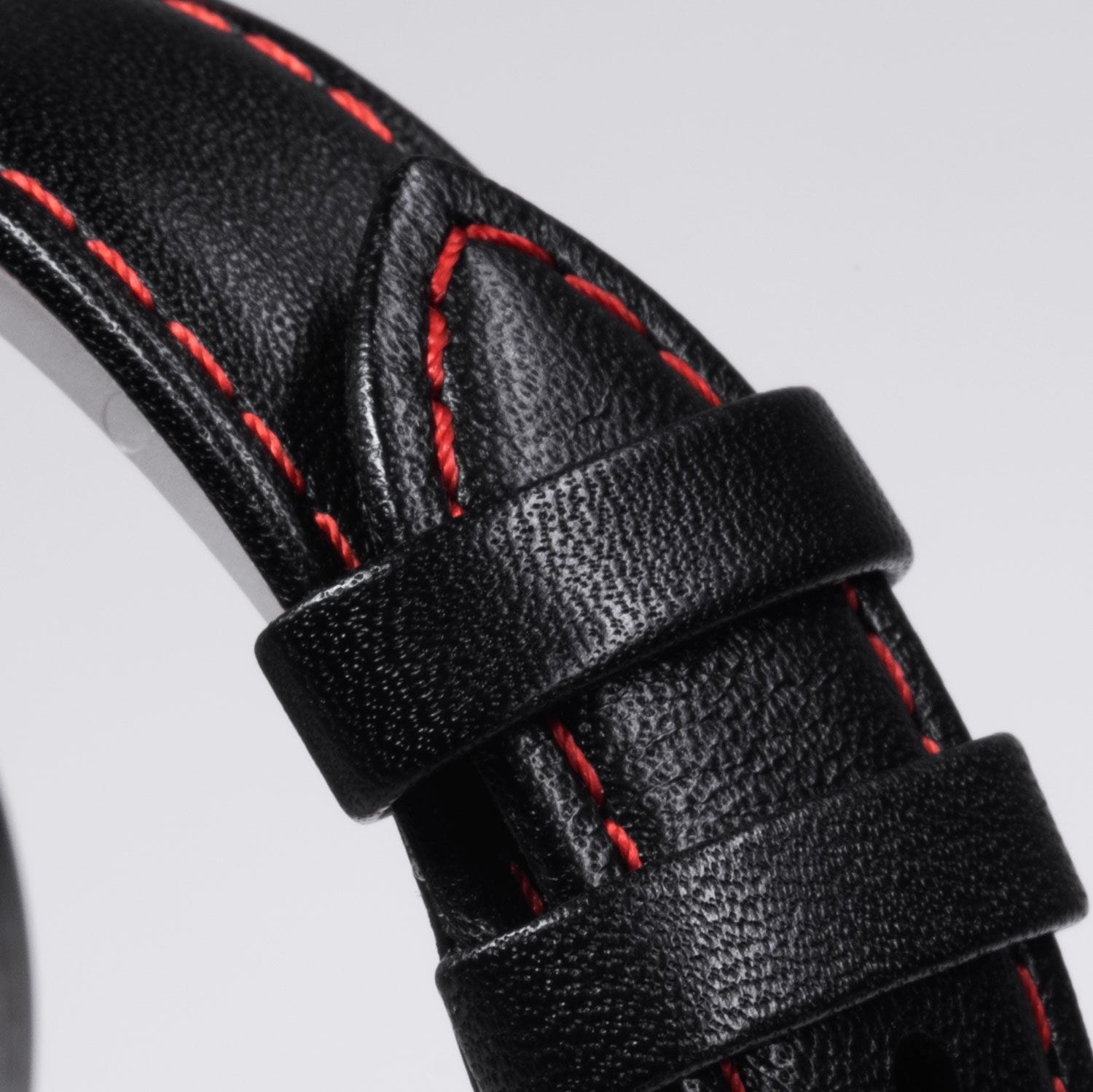 Ремешок из натуральной чёрной кожи с красной строчкой и классической застёжкой подчёркивает спортивный характер часов, обеспечивая комфортное ношение. Водозащита до 5 ATM делает модель подходящей для повседневного использования, включая случайные контакты с водой.