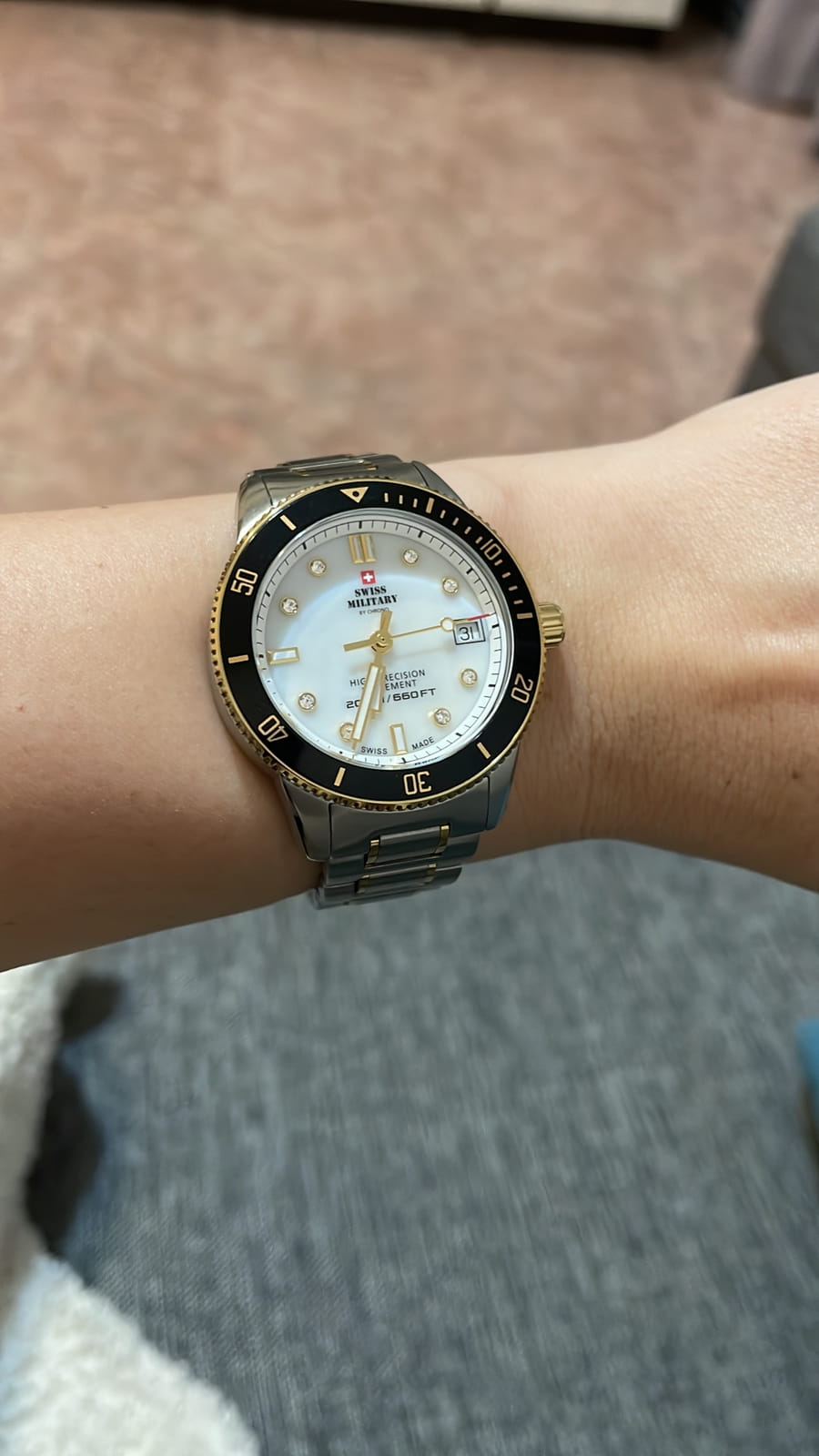 У данной модели диаметр корпуса 37  мм, Стальной браслет - все как я хотела .Страна производитель - Швейцария Есть индикация даты. Стрелки и метки с люминесцентным покрытием. Перламутровый циферблат с часовыми индексами в виде штрихов и точек. Корпус выполнен из нержавеющей стали с частичным PVD покрытием