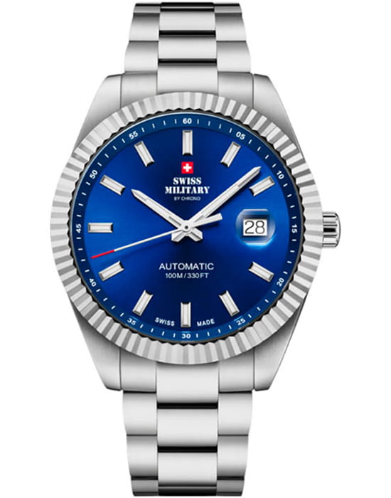 Мужские механические швейцарские часы с автоподзаводом Swiss Military by Chrono Automatic Collection SMA34110.03 — это элегантный мужской аксессуар, сочетающий швейцарское качество и классический дизайн. Корпус диаметром 40 мм и браслет выполнены из нержавеющей стали, придающим изделию изысканный вид. Сапфировое стеклоСапфировое стеклоПрочный и надёжный материал из кристалла сапфира синтетического происхождения, характеризующийся особой твёрдостью и устойчивостью к царапинам и повреждениям. устойчивое к появлению царапин, обладающее высокой прозрачностью. Стрелки и часовые метки покрыты люминесцентным составомЛюминесцентное покрытиеПозволяет считывать показания времени в темноте. Производители наносят на стрелки, часовые индексы, безель или поверхность циферблата светонакопительный состав, дающий холодное свечение., обеспечивая отличную читаемость в условиях низкой освещённости. Окошко даты находится в положении 3 часов. Браслет из нержавеющей стали с раскладной застёжкойРаскладная застёжкаТакой тип застёжки используется только на браслетах из металла. Она никогда не раскрывается полностью, происходит разделение на 2 и более частей. Раскладывающая застёжка снизит вероятность потери часов к минимуму. обеспечивает комфортное ношение и надёжную фиксацию на запястье. Водонепроницаемость до 10 ATM позволяет использовать часы при плавании и других водных активностях. Swiss Military — это идеальный выбор для мужчин, ценящих сочетание элегантности, функциональности и швейцарского качества.