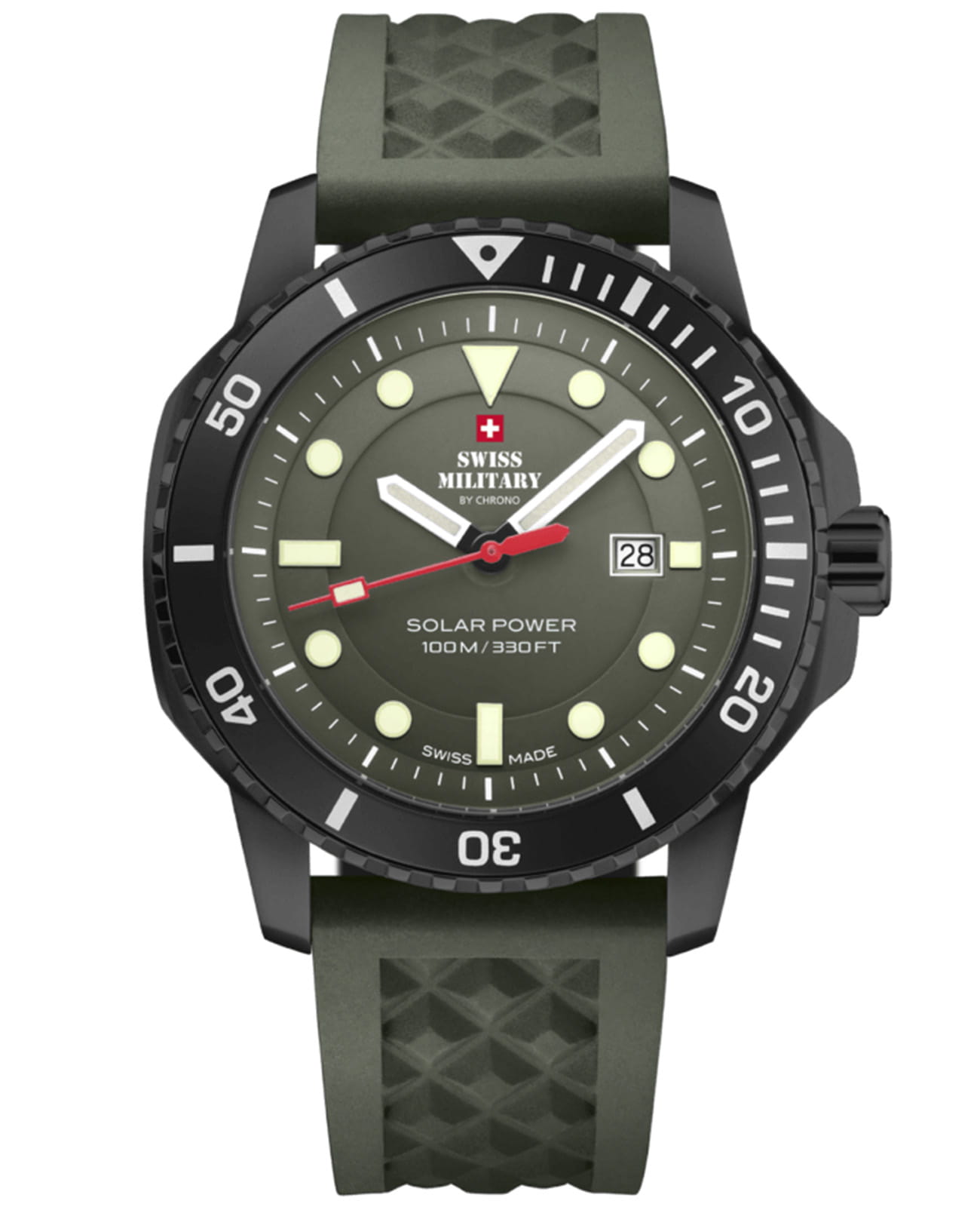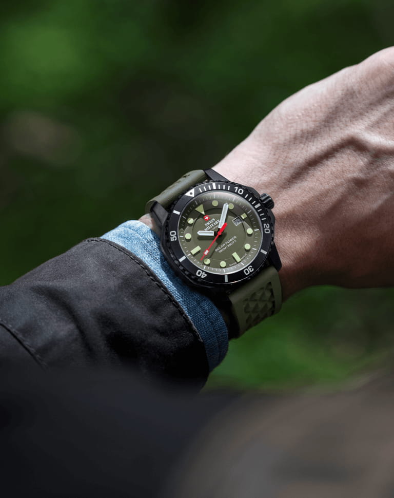 Мужские кварцевые часы Swiss Military — это прочный и функциональный аксессуар. Корпус диаметром 43 мм и толщиной 11 мм выполнен из нержавеющей стали с PVD-покрытиемPVDУльтратонкое покрытие наносится в технике вакуумного напыления, сочетает в себе нитрид титана особой прочности со слоем золота или оксида хрома. Несёт в себе декоративную или защитную функцию. цвета чёрного золота. Циферблат зелёного цвета оформлен индексами, стрелками и апертурой даты в положении 3 часов. Стрелки и метки с люминесцентным покрытиемЛюминесцентное покрытиеПозволяет считывать показания времени в темноте. Производители наносят на стрелки, часовые индексы, безель или поверхность циферблата светонакопительный состав, дающий холодное свечение., обеспечивающим хорошую читаемость в темноте. Циферблат защищён сапфировым стекломСапфировое стеклоПрочный и надёжный материал из кристалла сапфира синтетического происхождения, характеризующийся особой твёрдостью и устойчивостью к царапинам и повреждениям.. Механизм — швейцарское кварцевое движение калибра Ronda 215 (Swiss Made) на солнечной батарее. БезельБезельВнешний ободок, закрепляющий стекло. В спортивных часах так называется поворотное кольцо с делениями на циферблате, выполняет роль таймера – замеряет отрезки времени на шкале. Неподвижный безель – элемент декора. Однонаправленно вращающийся безель на дайверских часах позволяет фиксировать моменты погружения и выныривания на поверхность. вращающийся. Заводная головка с защитой повышает надёжность. Часы оснащены зелёным резиновым ремешком на классической пряжке. Водонепроницаемость 100 м позволяет использовать часы для плавания и повседневного ношения. Идеальный выбор для тех, кто ценит швейцарское качество и универсальный дизайн.